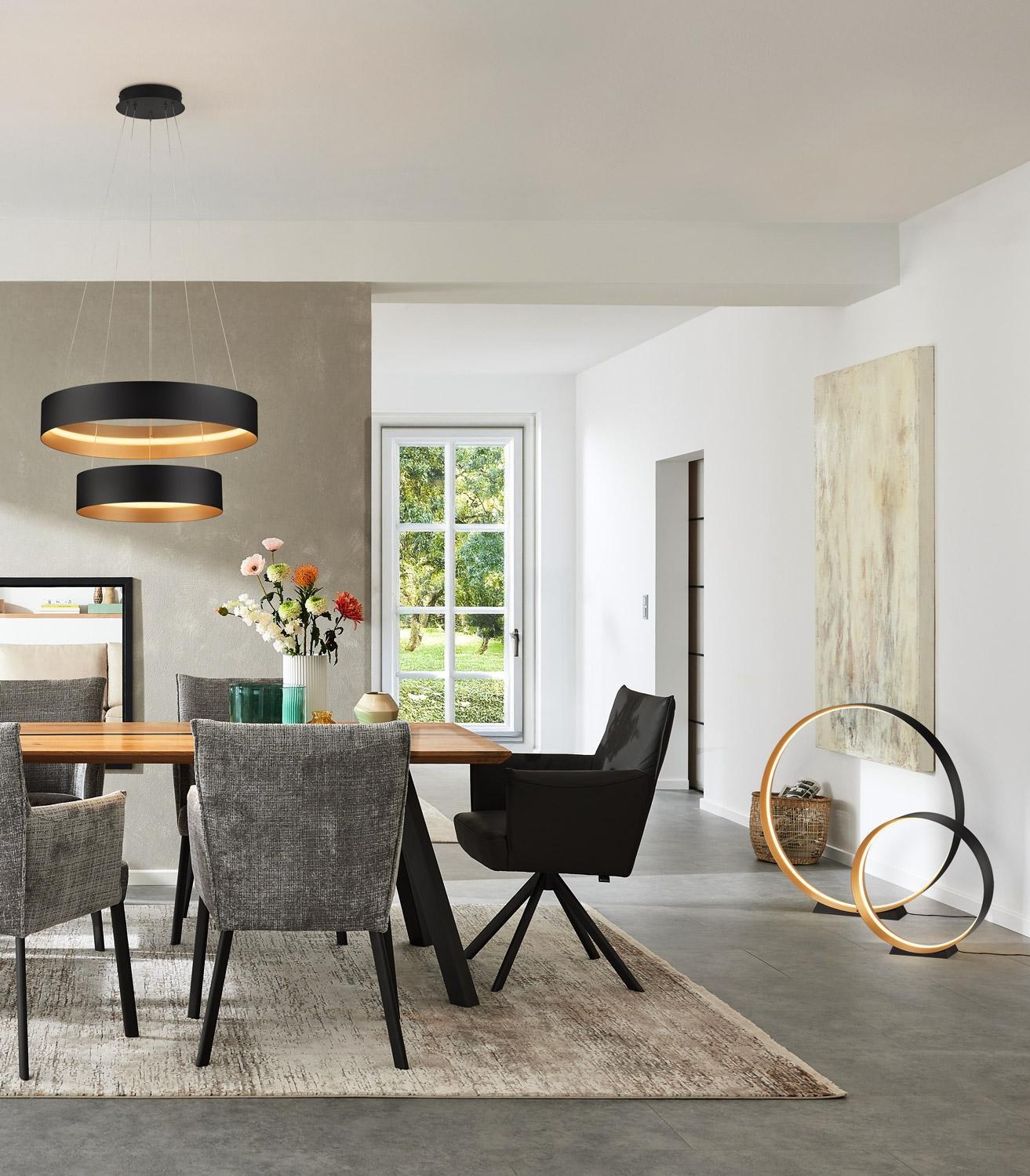 Die LED-Stehlampe LOOP von Musterring beeindruckt durch ihr modernes Design und vielseitige Funktionen. Sie besteht aus schwarzem Metall und besitzt einen Lampenschirm in stilvollem Goldgelb. Die Lampe ermöglicht eine flexible Anpassung der Farbtemperatur und ist dimmbar, was beides bequem über eine Fernbedienung gesteuert werden kann. Das Ein- und Ausschalten erfolgt über einen praktischen Schnurschalter. Mit Abmessungen von 75 cm in der Breite, 75 cm in der Höhe und 10 cm in der Tiefe fügt sie sich harmonisch in verschiedenste Wohnbereiche ein. Das integrierte LED-Leuchtmittel hat eine Leistung von 30 Watt, eine Helligkeit von 3600 Lumen und Farbtemperaturen von 2700 bis 6000 Kelvin. Ein Austausch des Leuchtmittels ist nicht möglich.