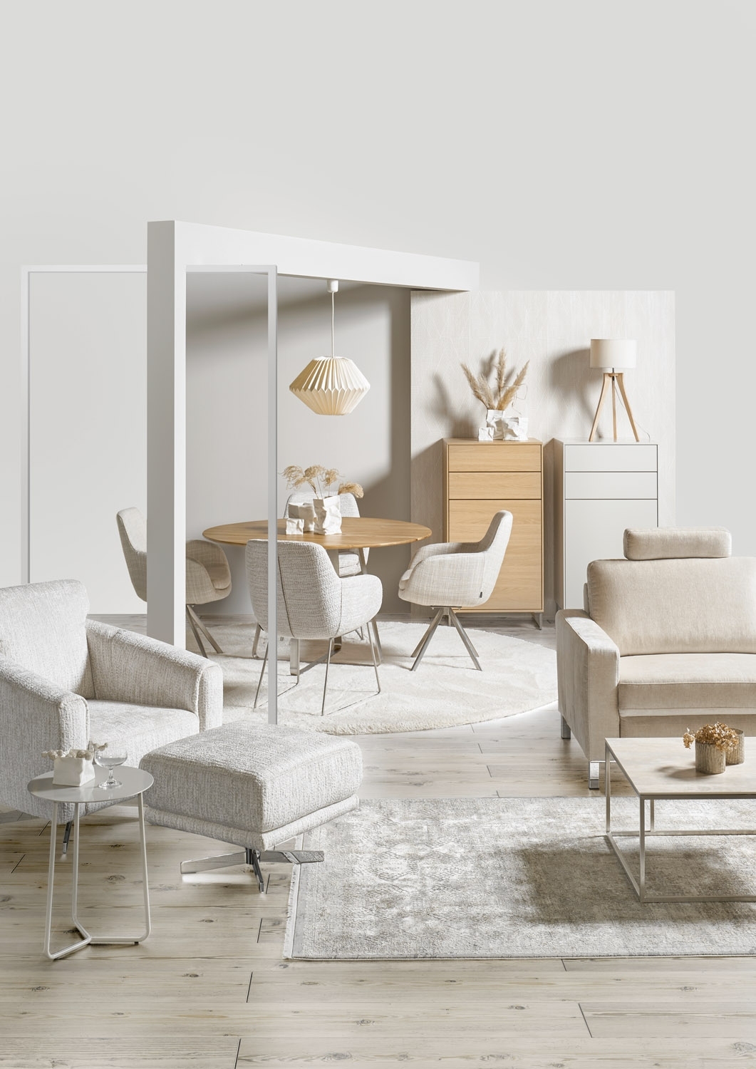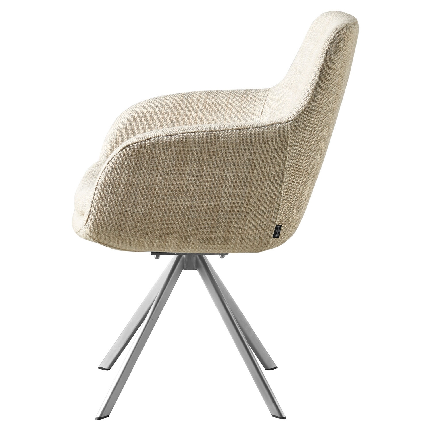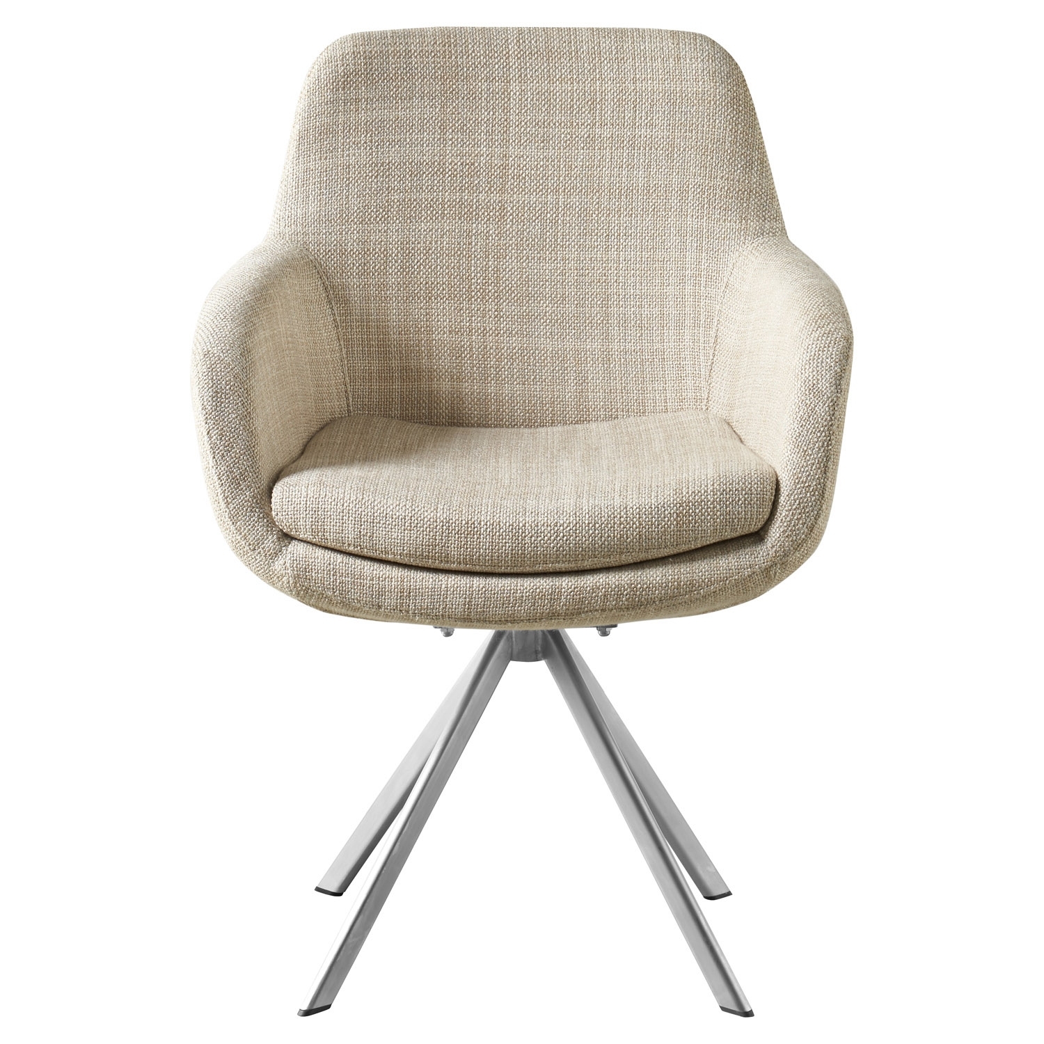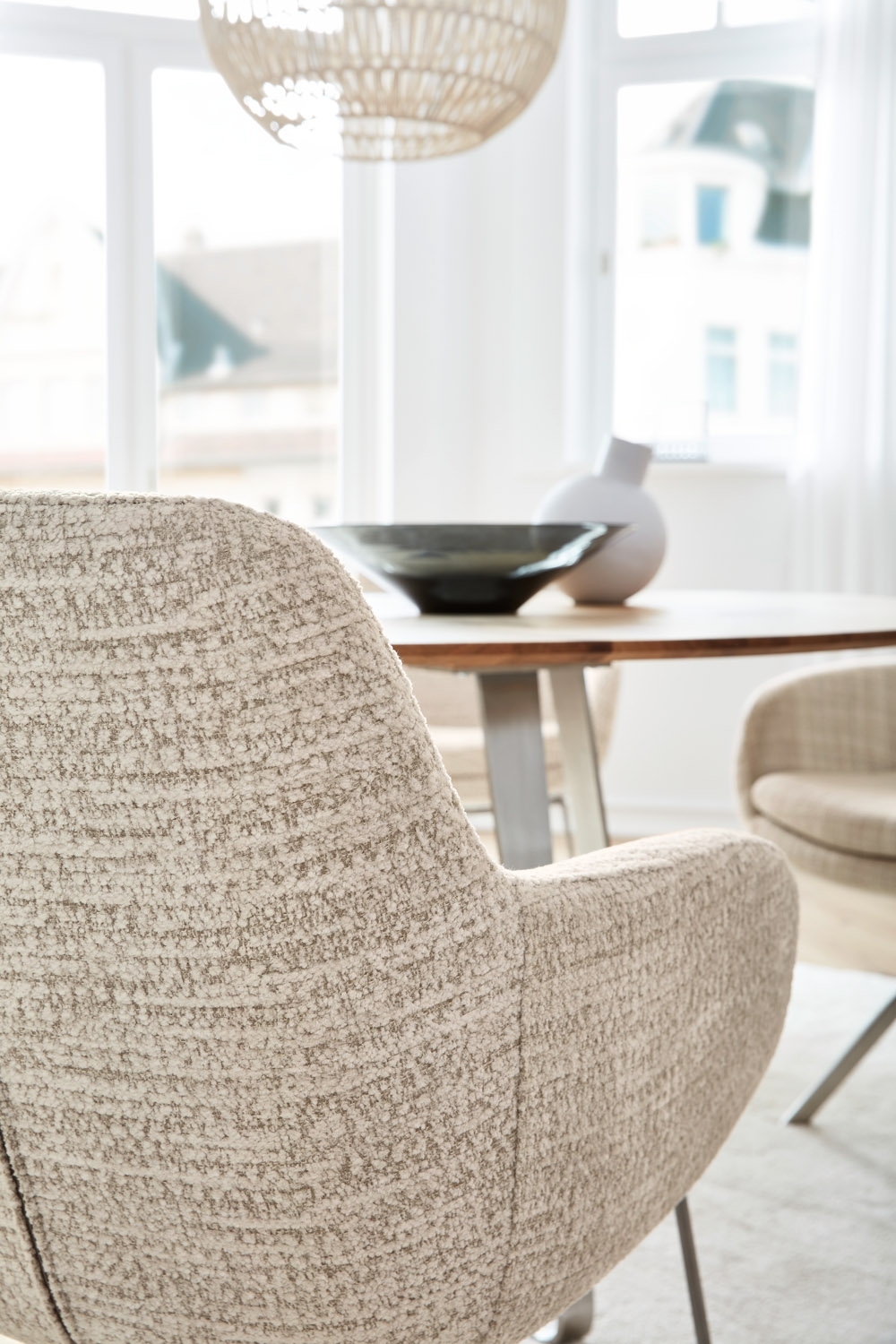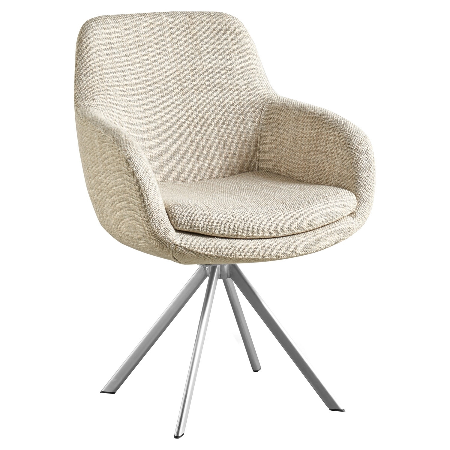Der Polsterstuhl TAVIA von Musterring kombiniert elegantes Design und Komfort. Der weiße Stoffbezug verleiht ihm eine moderne Optik, während das Gestell aus gebürstetem Edelstahl für Stabilität sorgt. Die Polsterung aus Kaltschaum und das Sitzkissen bieten hohen Sitzkomfort. Besonders praktisch ist die 180-Grad-Drehfunktion mit Rückholmechanismus. Mit Maßen von 62 cm Breite, 86 cm Höhe und 66 cm Tiefe ist der Stuhl eine stilvolle Ergänzung für jedes Zuhause.