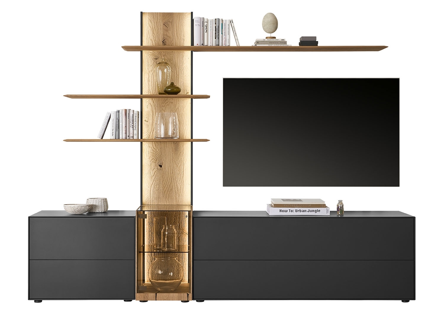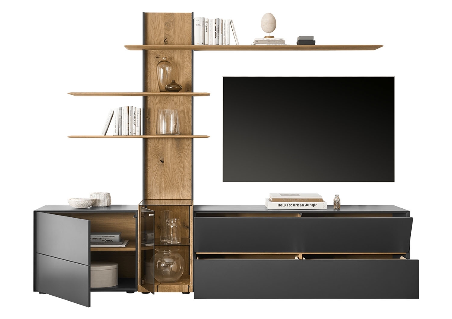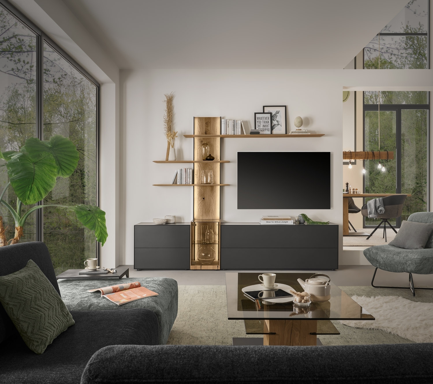 Die 4-teilige Wohnwand TREVIO von Musterring kombiniert natürliches Material mit funktionalem Design. Gefertigt aus massivem Kerneichenholz, verleihen die lackierten Birkenholz-Oberplatten und Fronten der Wohnwand eine schlichte, elegante Optik. Das Set umfasst zwei TV-Lowboards, ein Anbau-Lowboard mit Glastür und ein Wandboard. Das Anbau-Lowboard ist mit einer praktischen Push-to-Open-Funktion ausgestattet. Die Wohnwand kommt ohne LED-Beleuchtung und bietet mit einer Breite von 267 cm, einer Höhe von 207 cm und einer Tiefe von 51 cm viel Stauraum und Platz für Unterhaltungselektronik.
