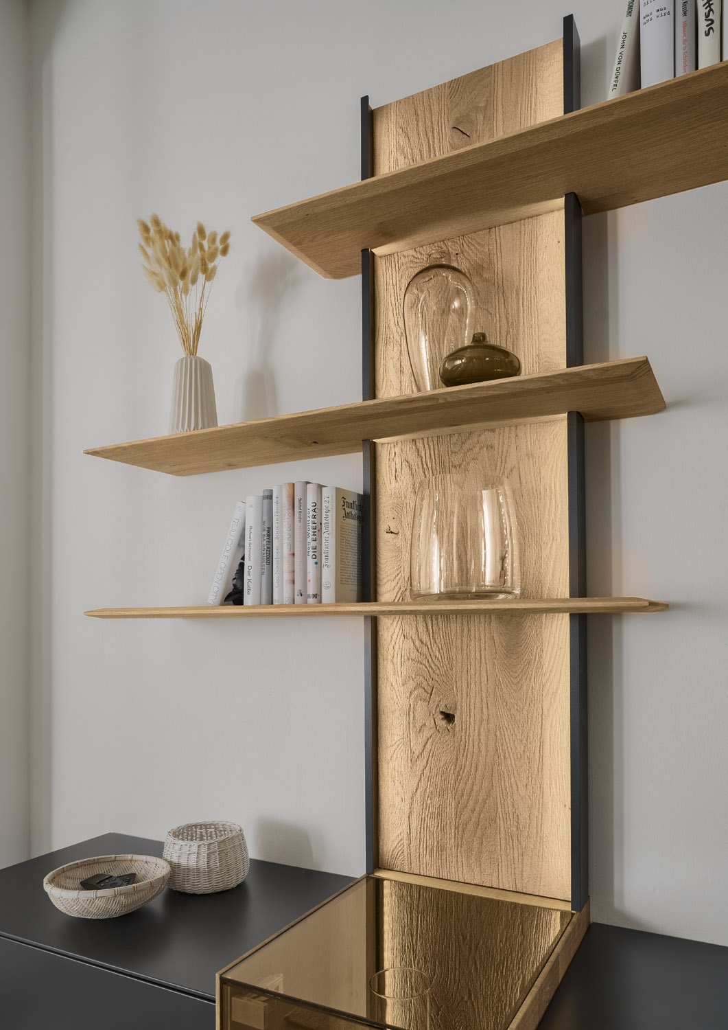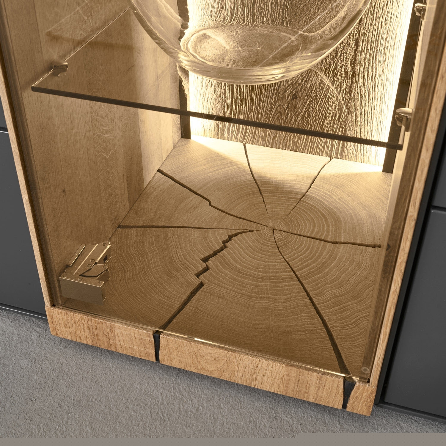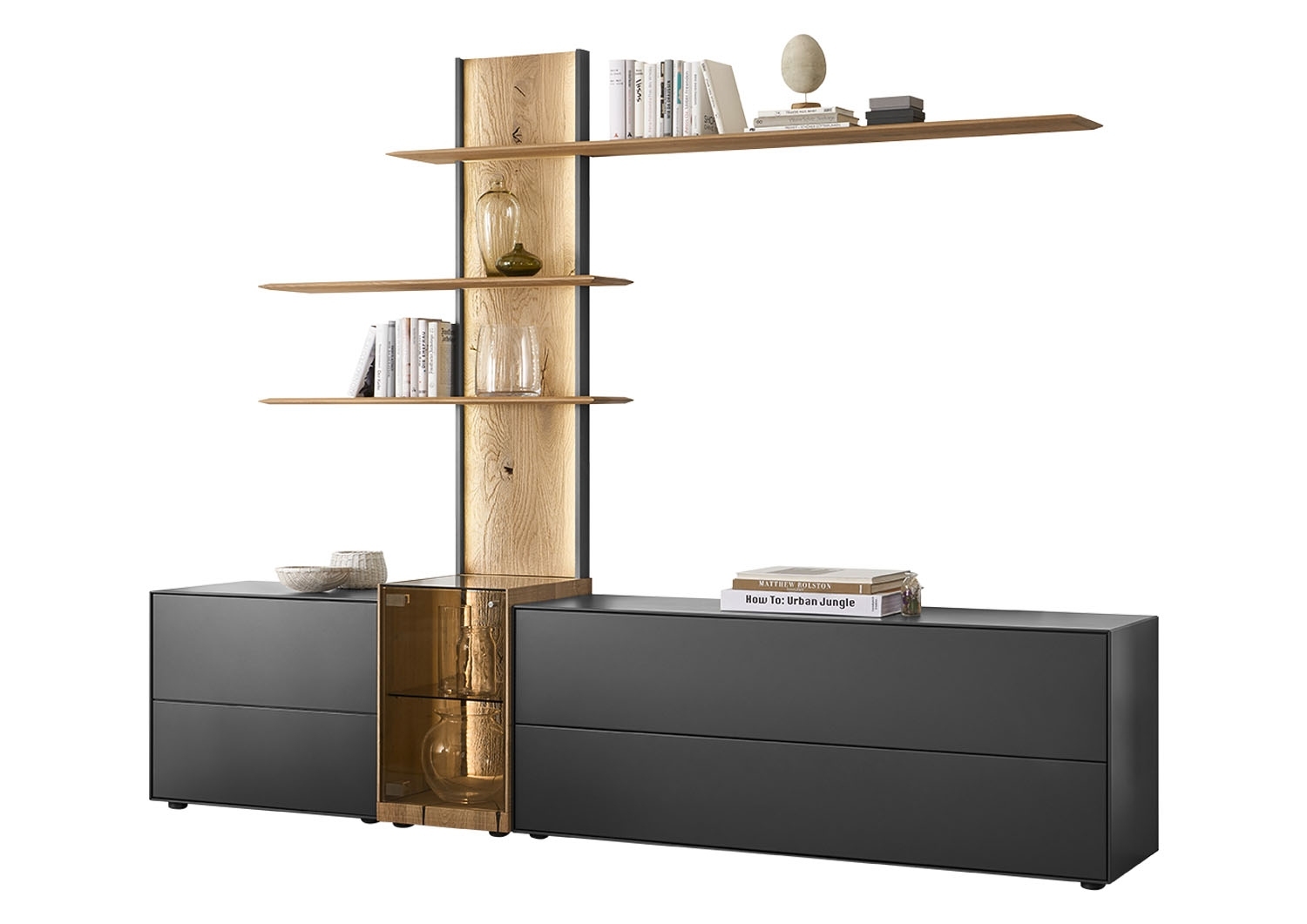 Die 4-teilige Wohnwand TREVIO von Musterring kombiniert natürliches Material mit funktionalem Design. Gefertigt aus massivem Kerneichenholz, verleihen die lackierten Birkenholz-Oberplatten und Fronten der Wohnwand eine schlichte, elegante Optik. Das Set umfasst zwei TV-Lowboards, ein Anbau-Lowboard mit Glastür und ein Wandboard. Das Anbau-Lowboard ist mit einer praktischen Push-to-Open-Funktion ausgestattet. Die Wohnwand kommt ohne LED-Beleuchtung und bietet mit einer Breite von 267 cm, einer Höhe von 207 cm und einer Tiefe von 51 cm viel Stauraum und Platz für Unterhaltungselektronik.