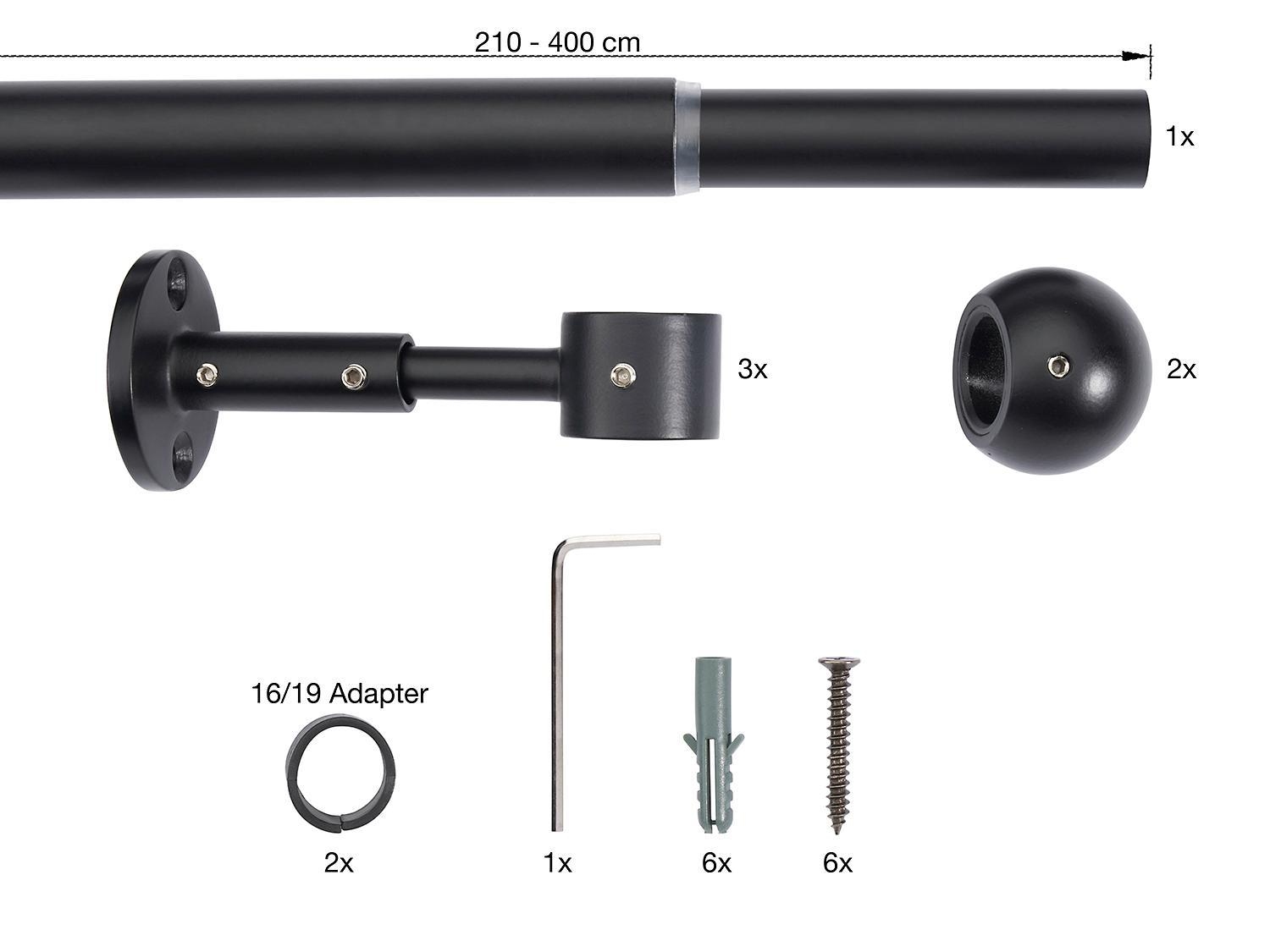 Die 2in1 Teleskopgarnitur BALL in Schwarz von mydeco kombiniert modernes Design mit praktischer Flexibilität. Dank der stufenlos verstellbaren Länge von 210 bis 400 cm eignet sie sich ideal für verschiedene Fenstergrößen. Mit einem Rohrdurchmesser von 1,6 bis 1,9 cm bietet die Stange eine stabile Basis für leichte bis mittelschwere Vorhänge. Die einfache Montage macht sie zur perfekten Lösung für stilvolles und funktionales Wohnen.