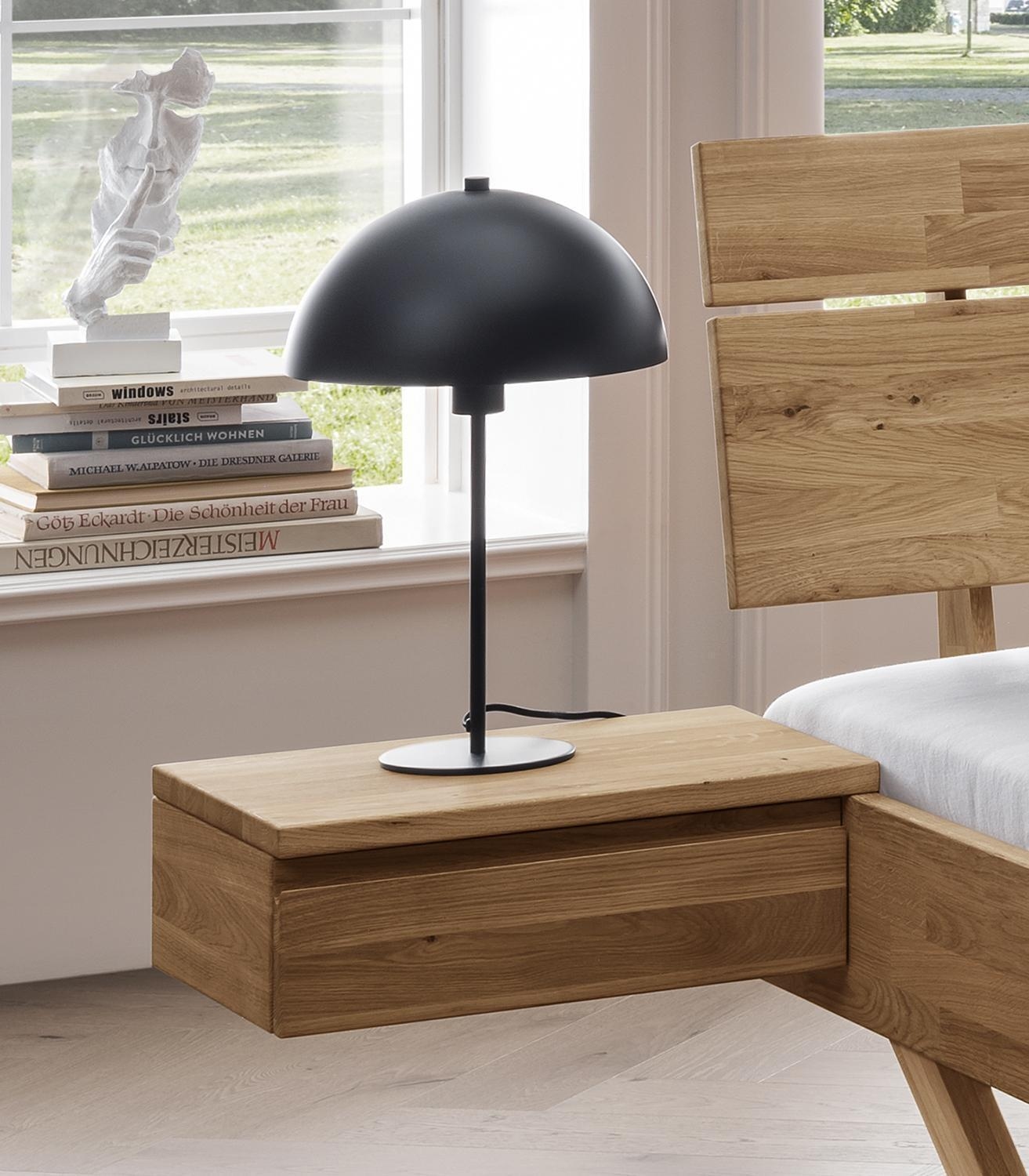 Der Nachttisch ANERO ist aus massivem Wildeichenholz in Braun gefertigt. Er verfügt über eine Schublade, die mit einer Griffleiste ausgestattet ist. Die Montage erfolgt davorstehend linksseitig, indem der Nachttisch in den Bettrahmen eingehängt wird. Zur zusätzlichen Sicherung muss das Element anschließend mit zwei Schrauben fixiert werden. Die Abmessungen des Nachttischs betragen 48 cm in der Breite, 16 cm in der Höhe und 33 cm in der Tiefe.