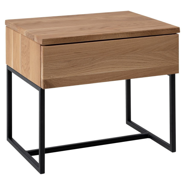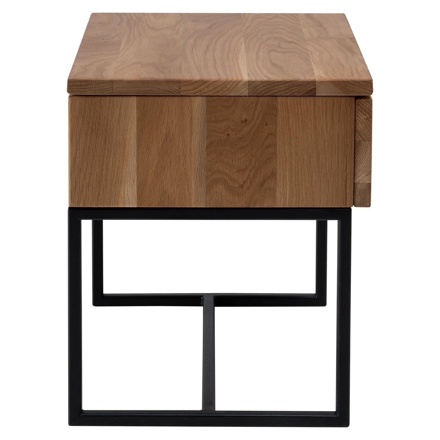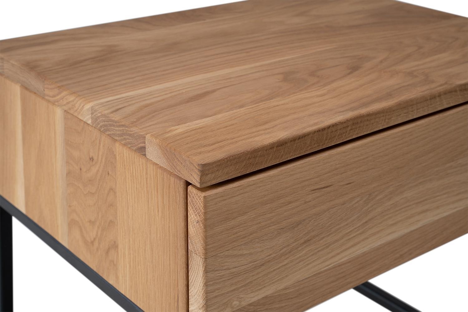 Der Nachttisch BANTO besteht aus massivem Wildeichenholz und ist mit einem schwarzen Metallgestell ausgestattet. Die Oberfläche ist geölt. Der Nachttisch verfügt über eine Schublade. Die Maße betragen 45 Zentimeter in der Breite, 41 Zentimeter in der Höhe und 35 Zentimeter in der Tiefe.