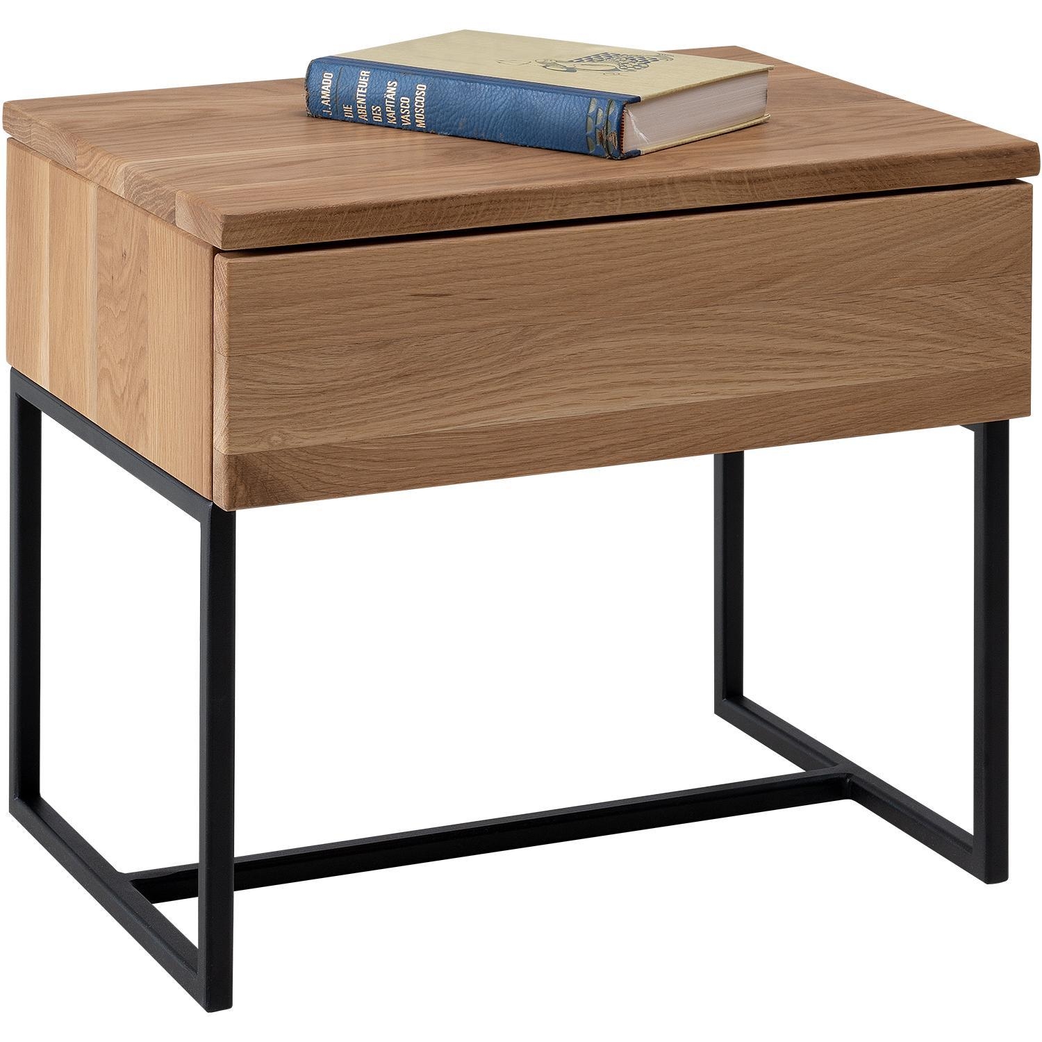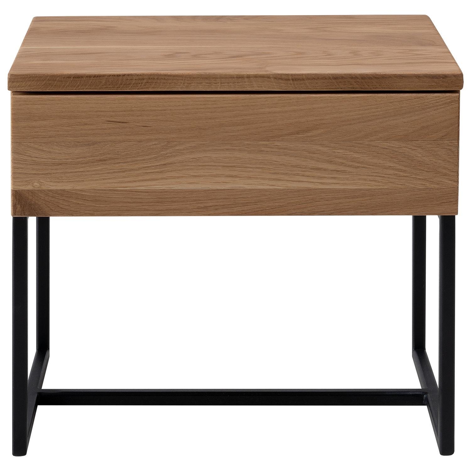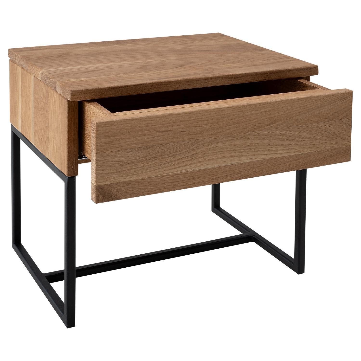 Der Nachttisch BANTO besteht aus massivem Wildeichenholz und ist mit einem schwarzen Metallgestell ausgestattet. Die Oberfläche ist geölt. Der Nachttisch verfügt über eine Schublade. Die Maße betragen 45 Zentimeter in der Breite, 41 Zentimeter in der Höhe und 35 Zentimeter in der Tiefe.