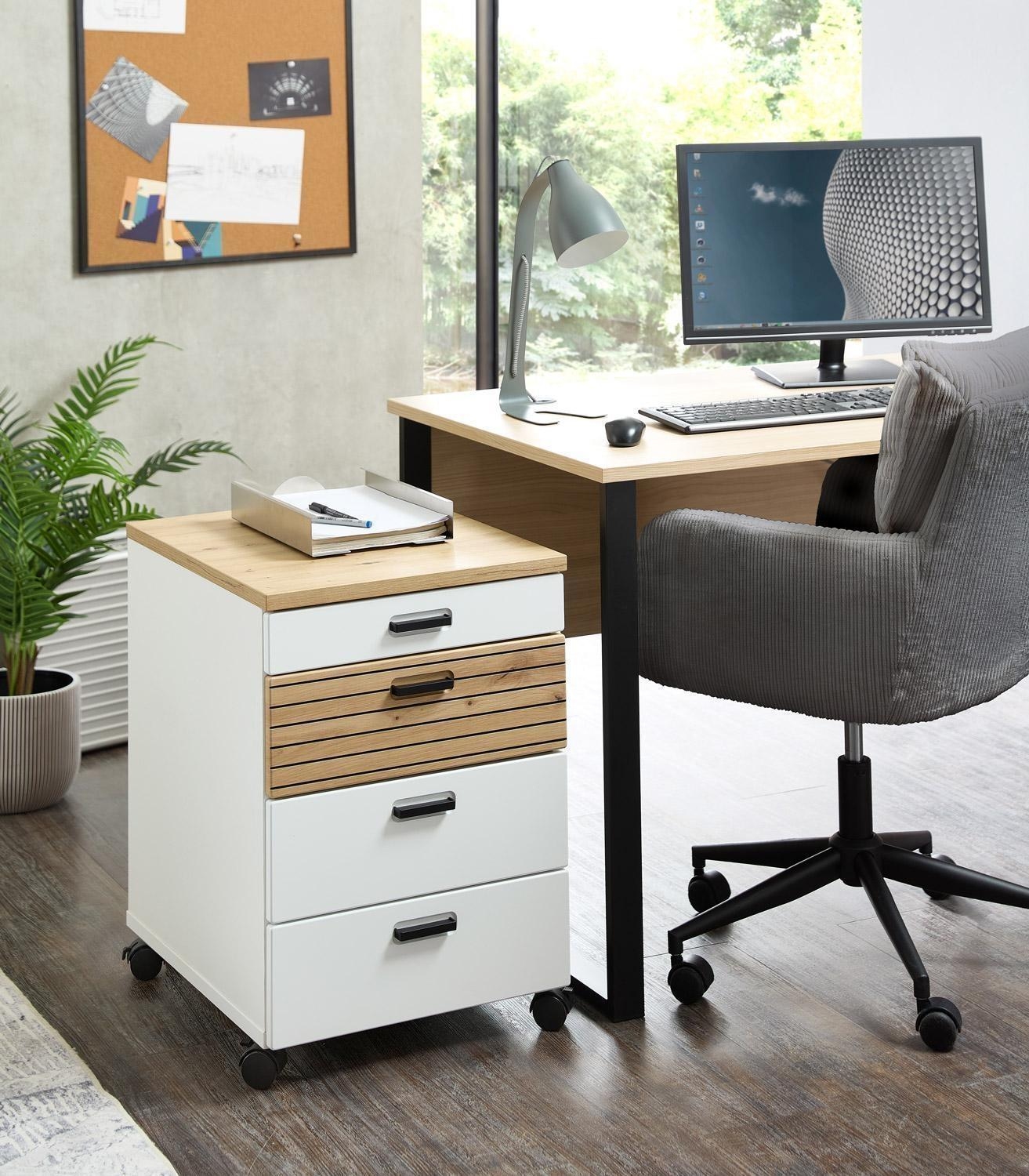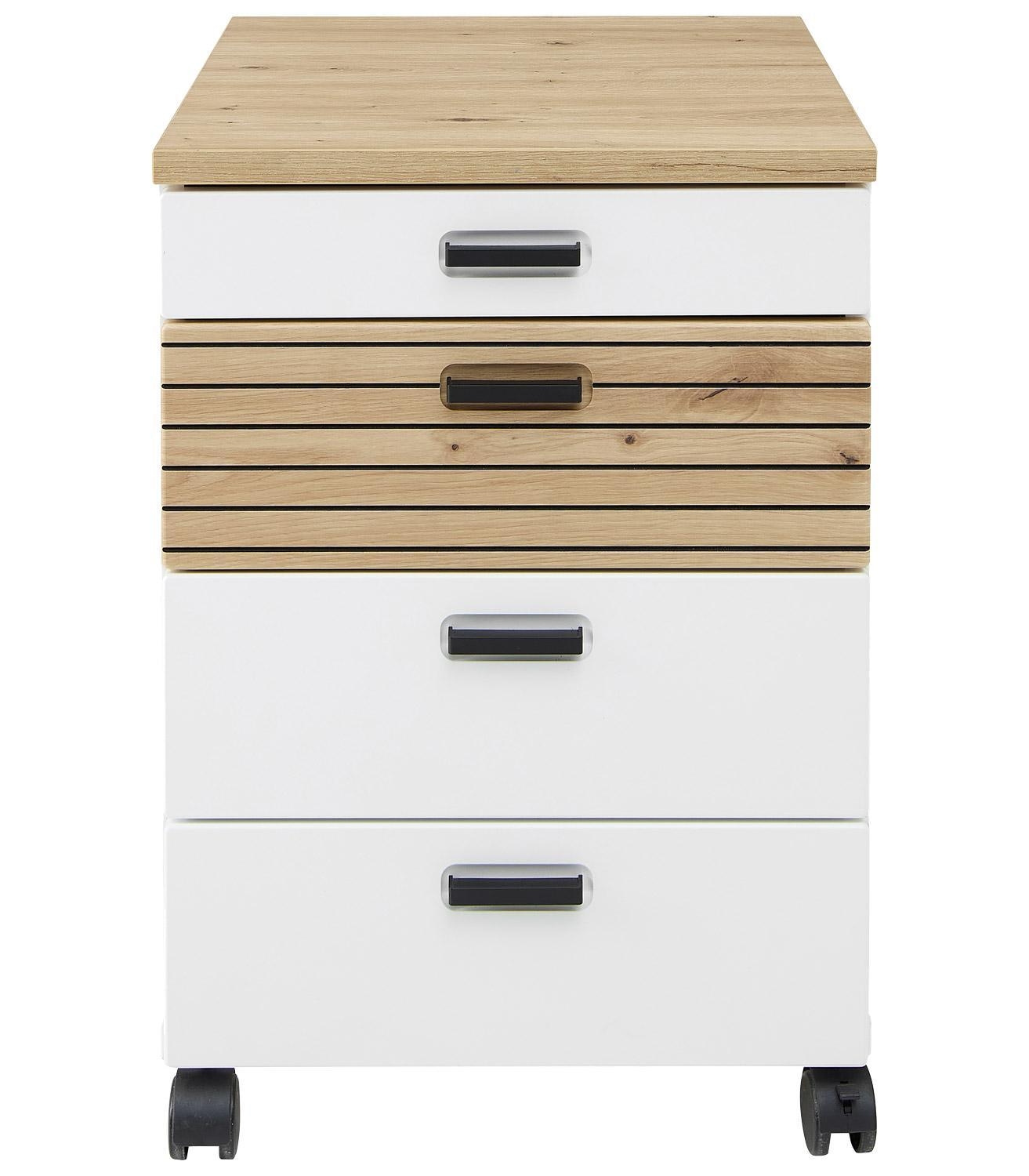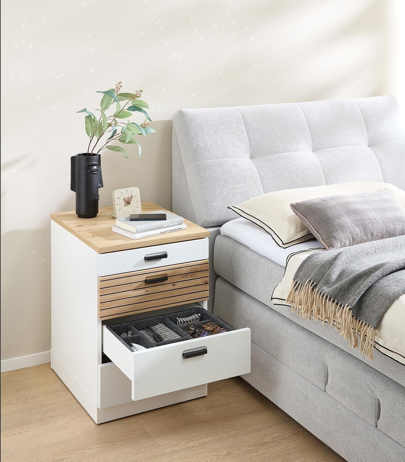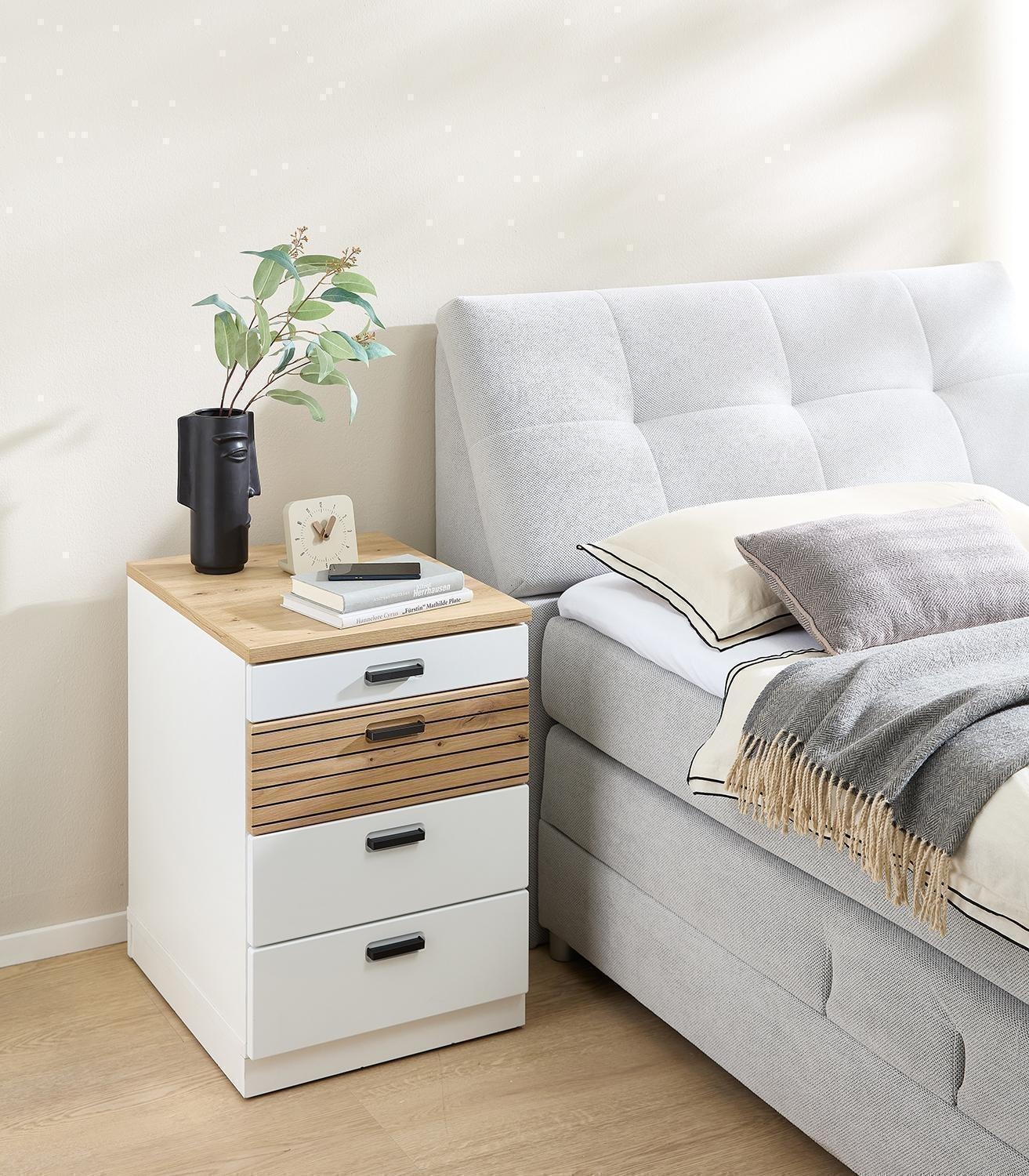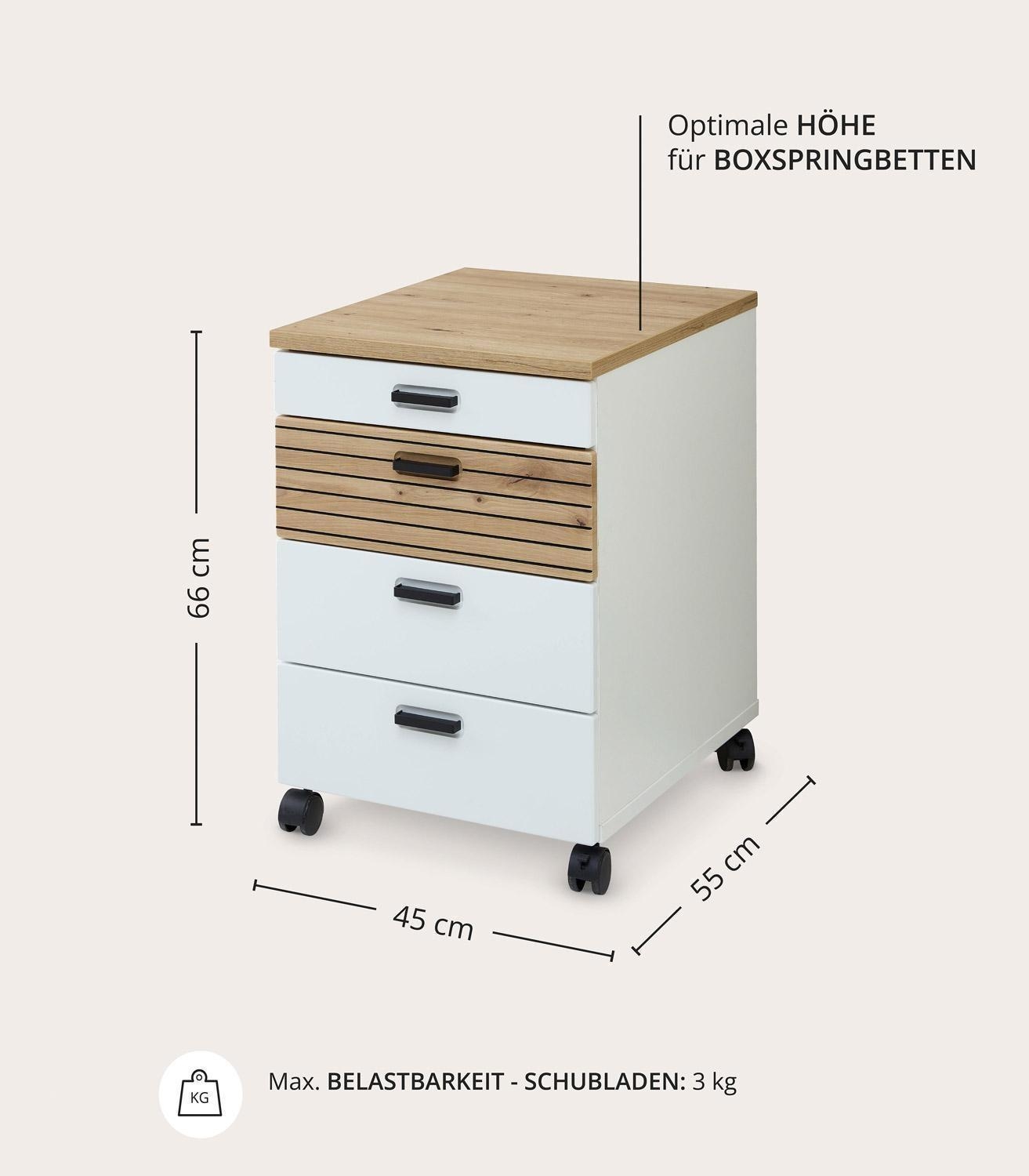 Der Nachttisch GASPI ist in Weiß gehalten und verfügt über eine Oberplatte sowie Teilbereiche der Front in Artisan Eiche Dekor. Ausgestattet ist der Nachttisch mit drei Schubladen, die Stauraum für verschiedene Gegenstände bieten. Zur einfachen Bewegung ist das Möbelstück mit vier Rollen versehen, von denen zwei gebremst und zwei ungebremst sind. Die Maße betragen 45 cm in der Breite, 66 cm in der Höhe und 55 cm in der Tiefe.