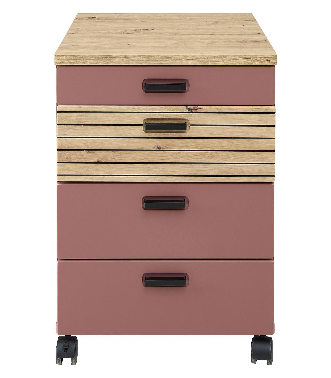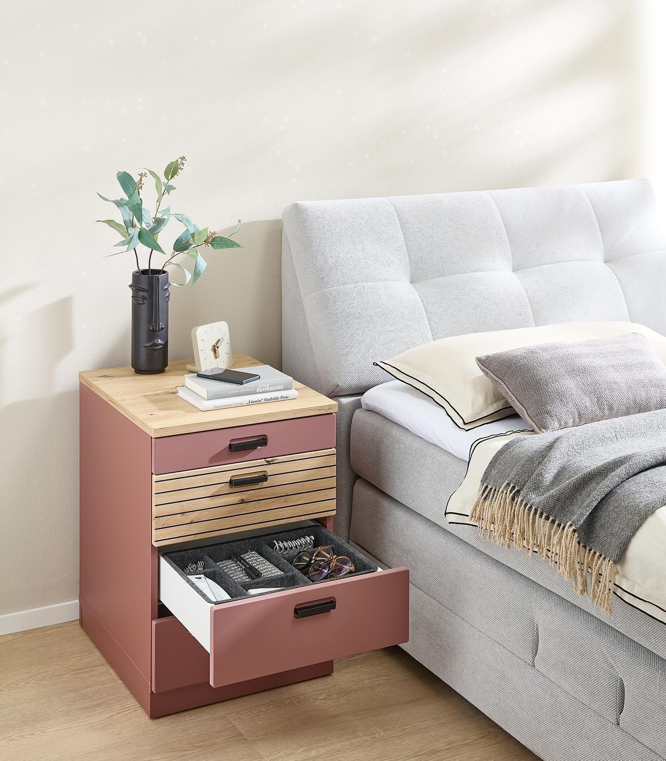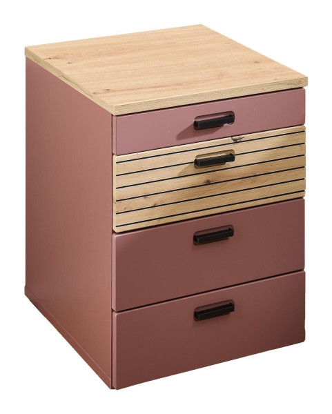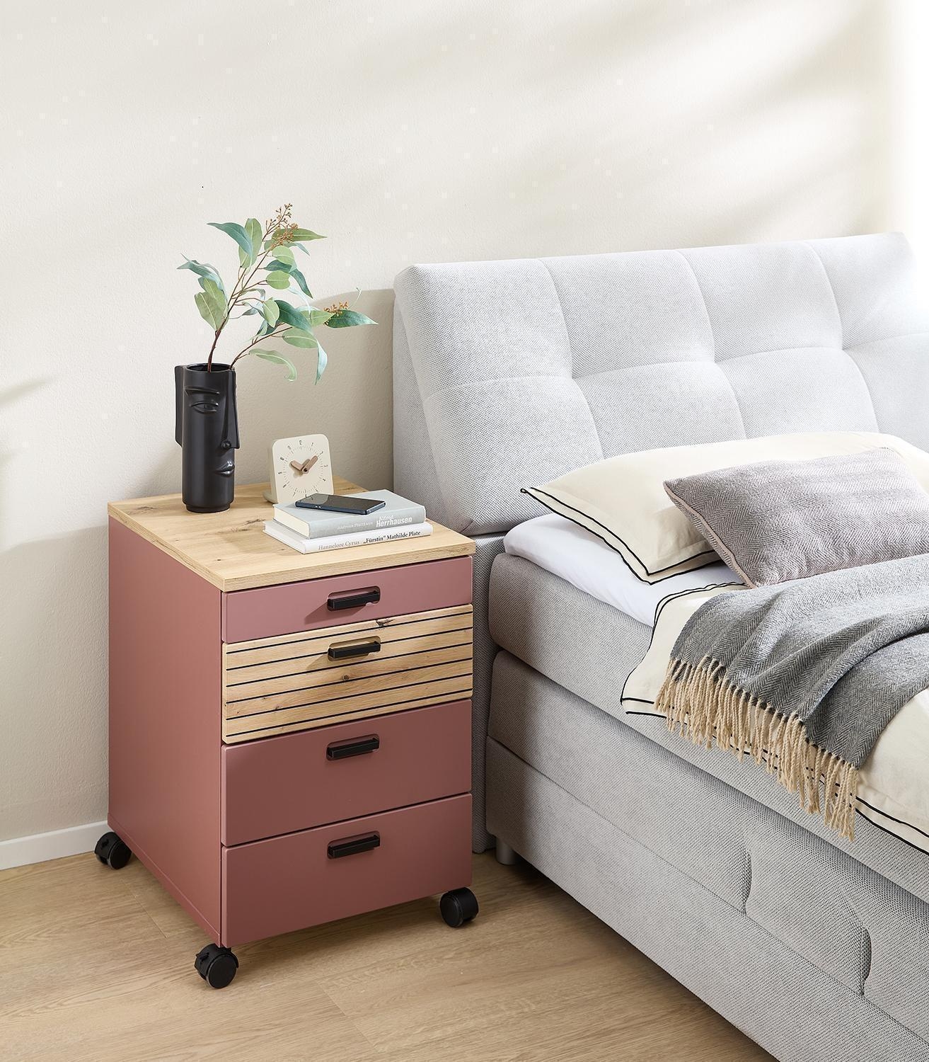 Der Nachttisch GASPI ist in Rostbraun gehalten und verfügt über eine Oberplatte sowie Teilbereiche der Front in Artisan Eiche Dekor. Ausgestattet ist der Nachttisch mit drei Schubladen, die Stauraum für verschiedene Gegenstände bieten. Zur einfachen Bewegung ist das Möbelstück mit vier Rollen versehen, von denen zwei gebremst und zwei ungebremst sind. Die Maße betragen 45 cm in der Breite, 66 cm in der Höhe und 55 cm in der Tiefe.