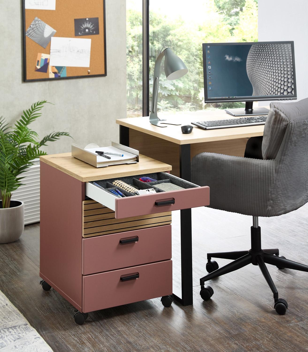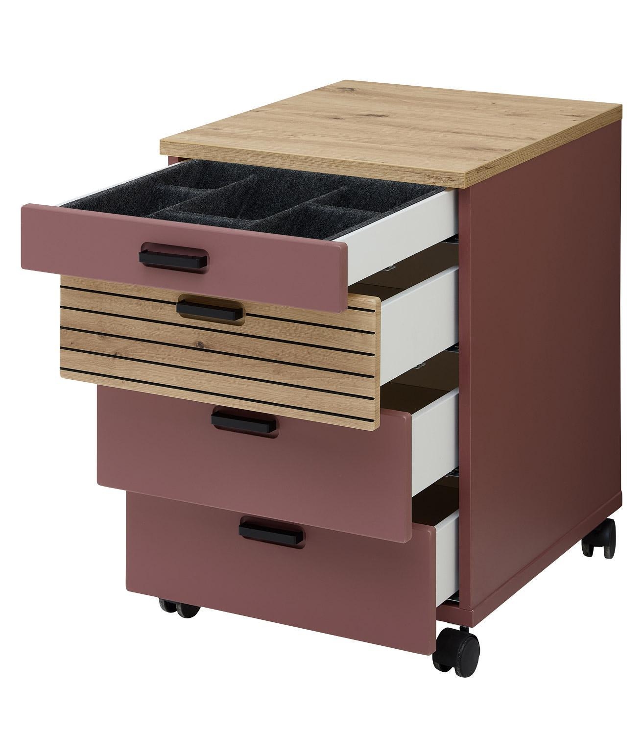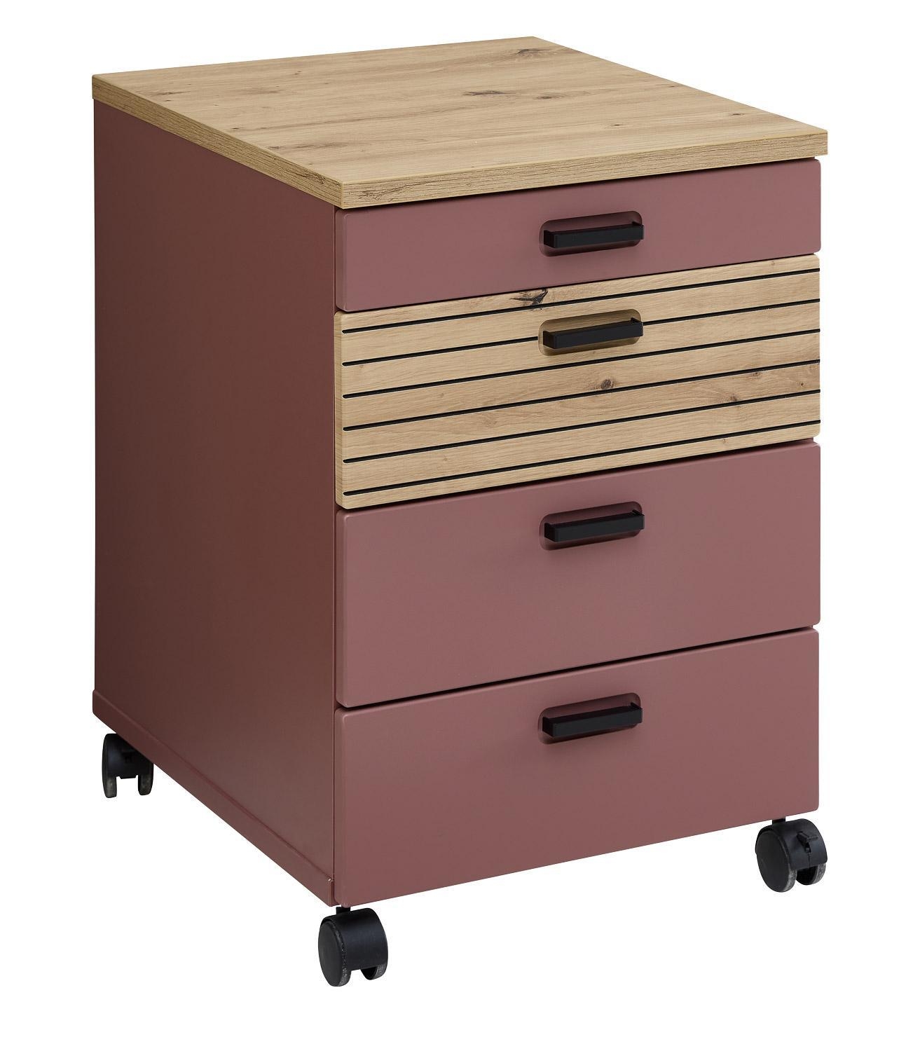 Der Nachttisch GASPI ist in Rostbraun gehalten und verfügt über eine Oberplatte sowie Teilbereiche der Front in Artisan Eiche Dekor. Ausgestattet ist der Nachttisch mit drei Schubladen, die Stauraum für verschiedene Gegenstände bieten. Zur einfachen Bewegung ist das Möbelstück mit vier Rollen versehen, von denen zwei gebremst und zwei ungebremst sind. Die Maße betragen 45 cm in der Breite, 66 cm in der Höhe und 55 cm in der Tiefe.