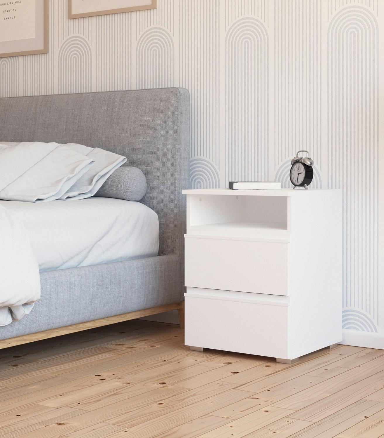| Lieferumfang: | 1 Nachttisch mit 2 Schubladen und 1 offenem Ablagefach |