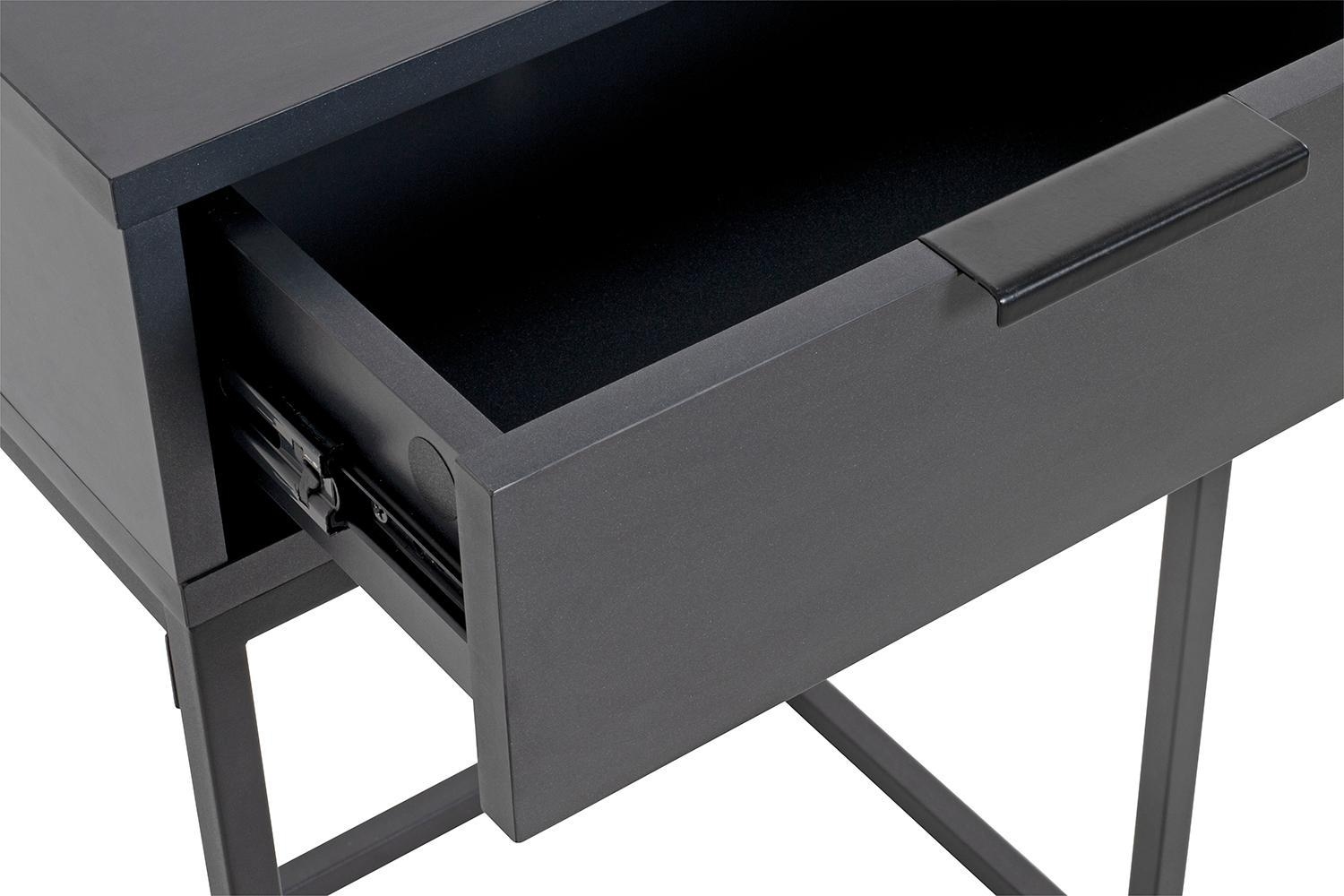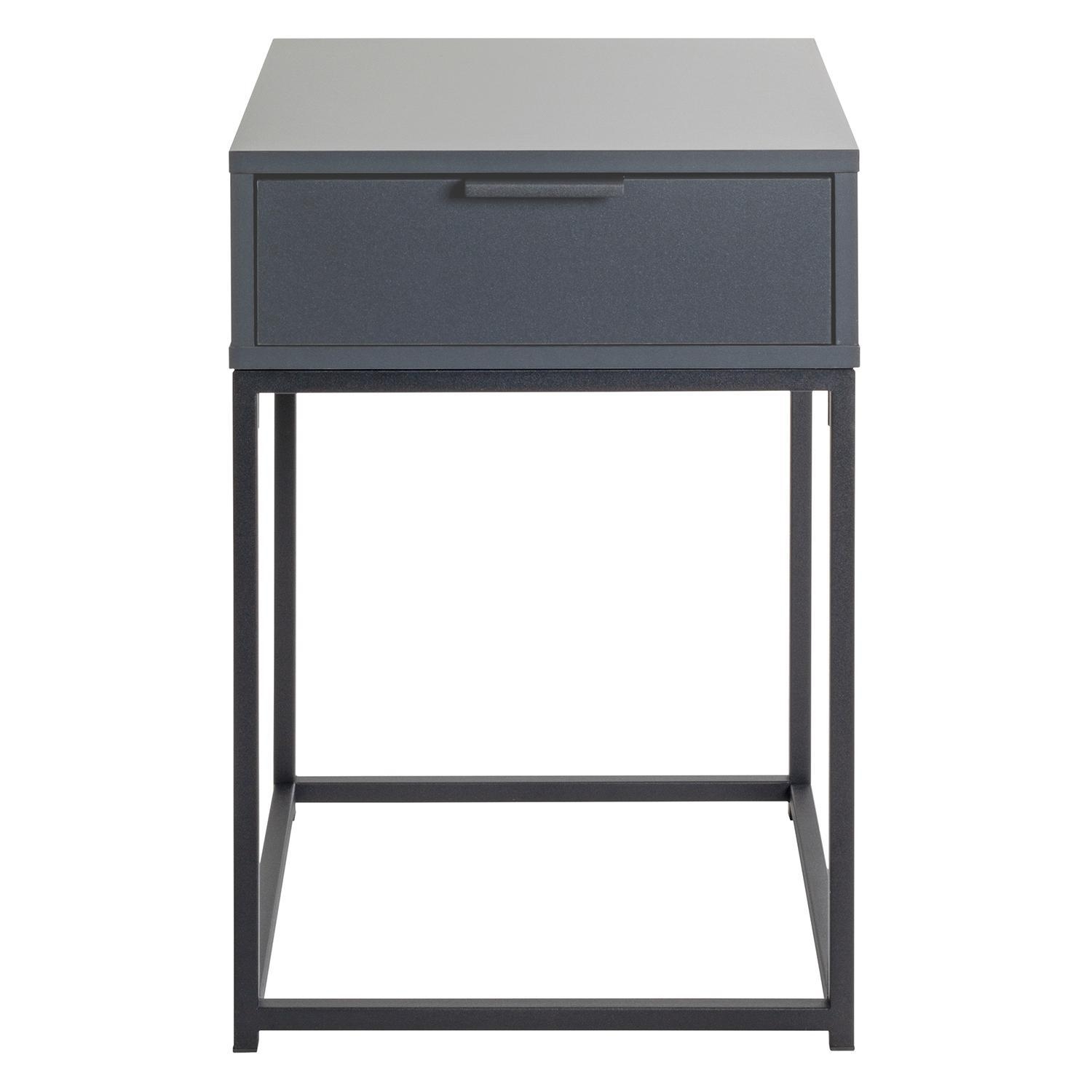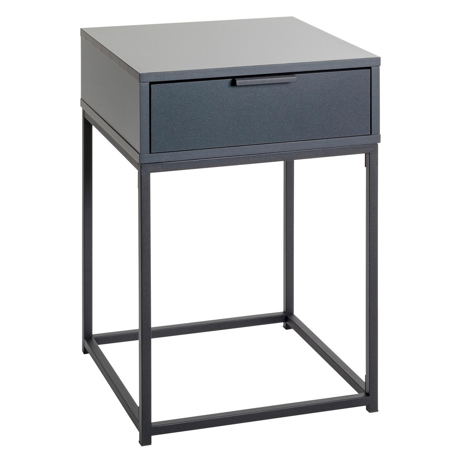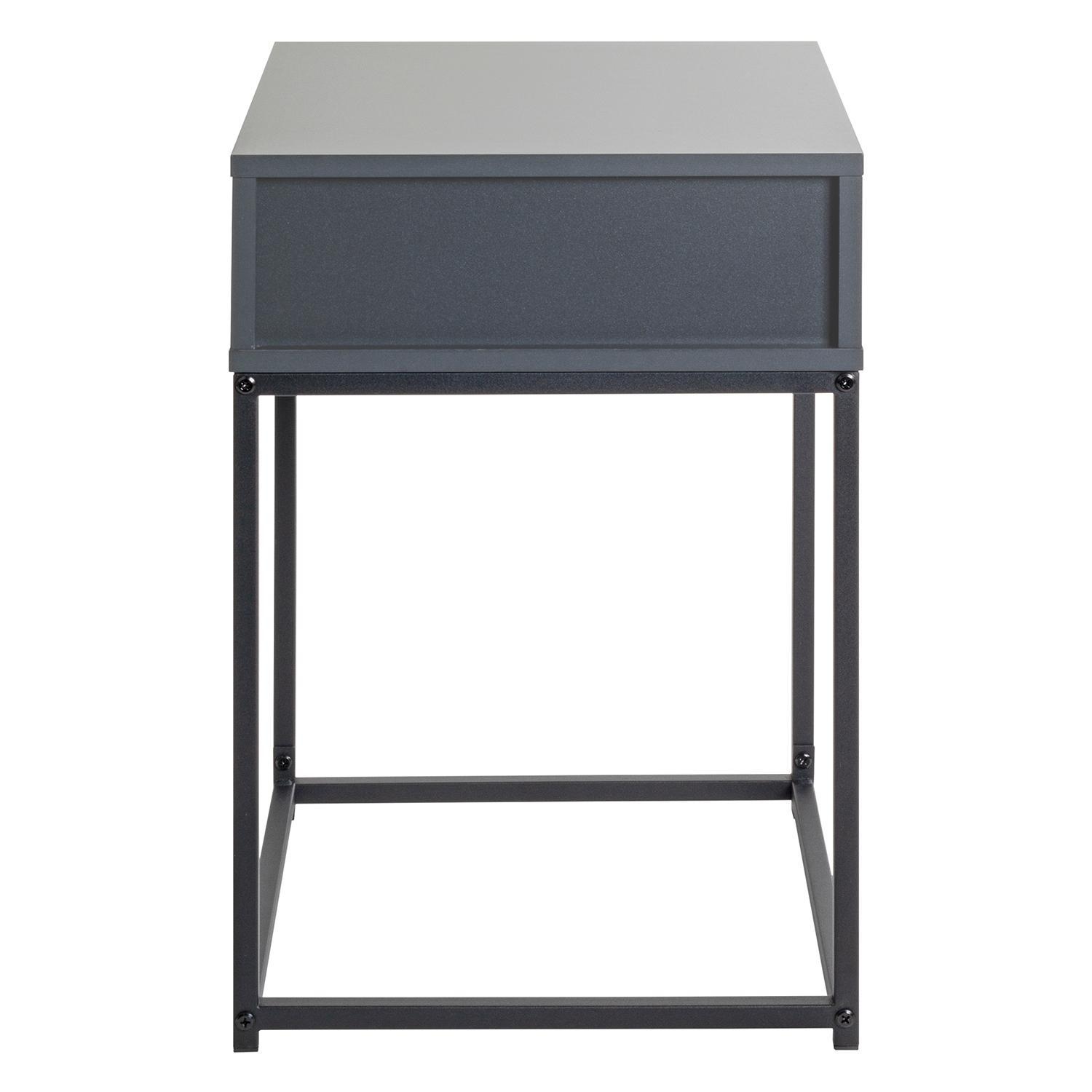 Der Nachttisch MARLENA ist mit einer Oberfläche Anthrazit versehen. Das Gestell besteht aus Metall und ist in Schwarz ausgeführt. Ausgestattet ist der Tisch mit einer Schublade. Die maximale Belastbarkeit beträgt 15 kg. Die Breite liegt bei 40 cm, die Höhe bei 60 cm und die Tiefe bei 28 cm.
