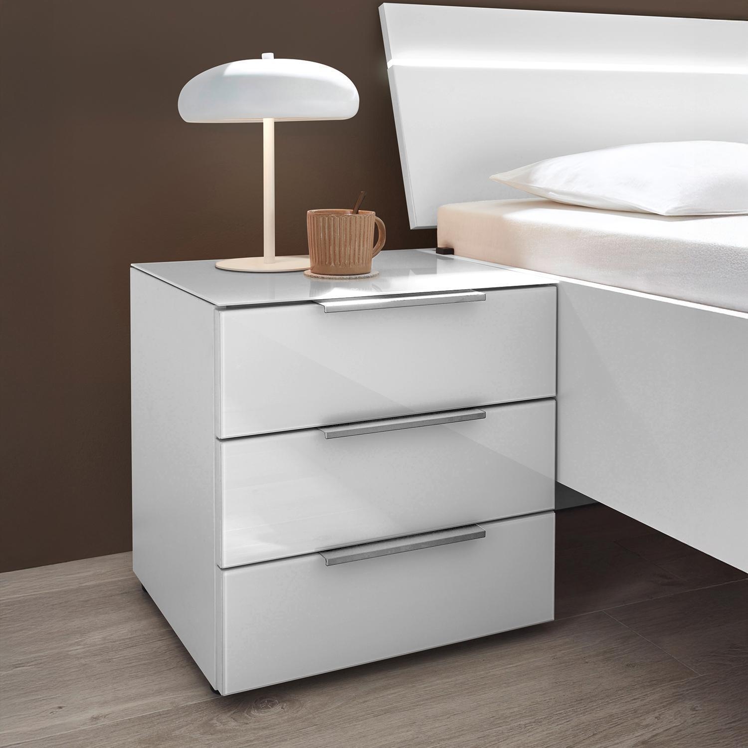Der Nachttisch SAKURA ist in Weiß matt gehalten und mit Fronten aus Weißglas ausgestattet. Er verfügt über drei Schubladen und ist mit chromfarbenen Griffen versehen. Mit einer Breite von 45 cm, einer Höhe von 46 cm und einer Tiefe von 40 cm hat die Nachtkommode kompakte Maße für den Einsatz neben dem Bett.