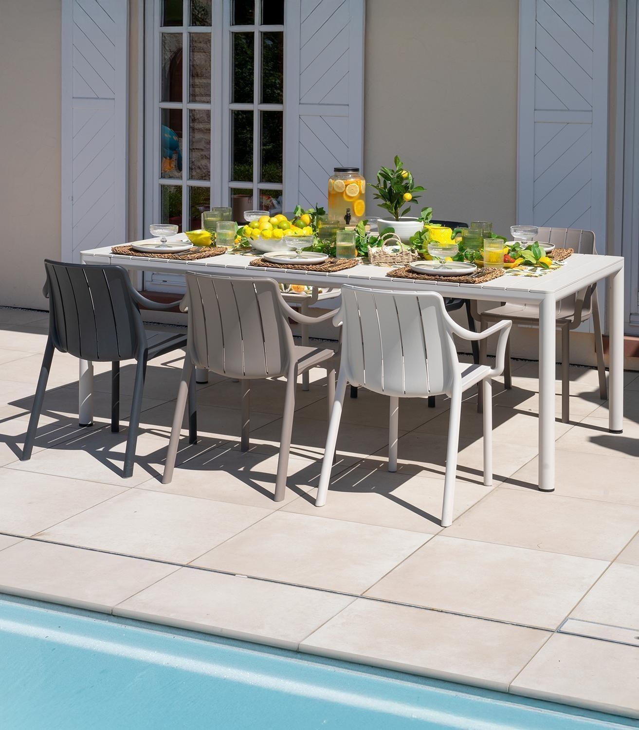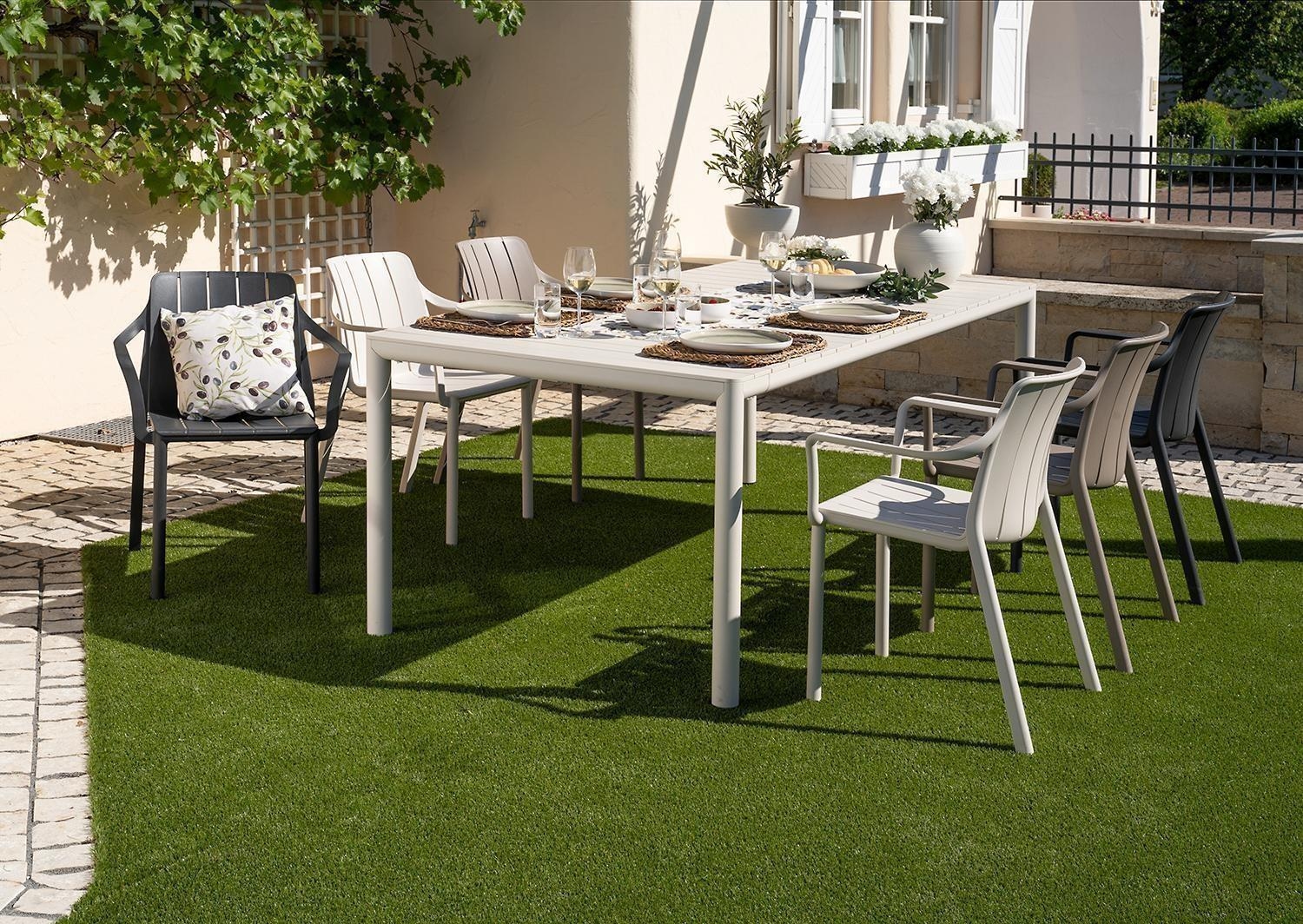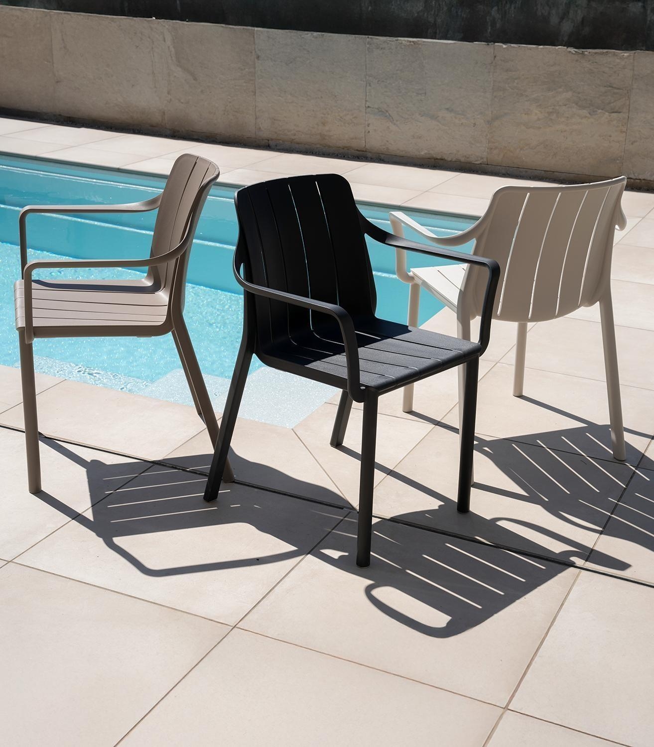 Der Gartenstuhl TIBERINA der Marke Nardi besteht aus glasfaserverstärktem Polypropylen in Anthrazit mit Matt-Effekt. Er ist mit Armlehnen und rutschfesten Fußkappen ausgestattet. Der Stuhl ist platzsparend stapelbar. Die Maße betragen 59 cm in der Breite, 81 cm in der Höhe und 56 cm in der Tiefe.