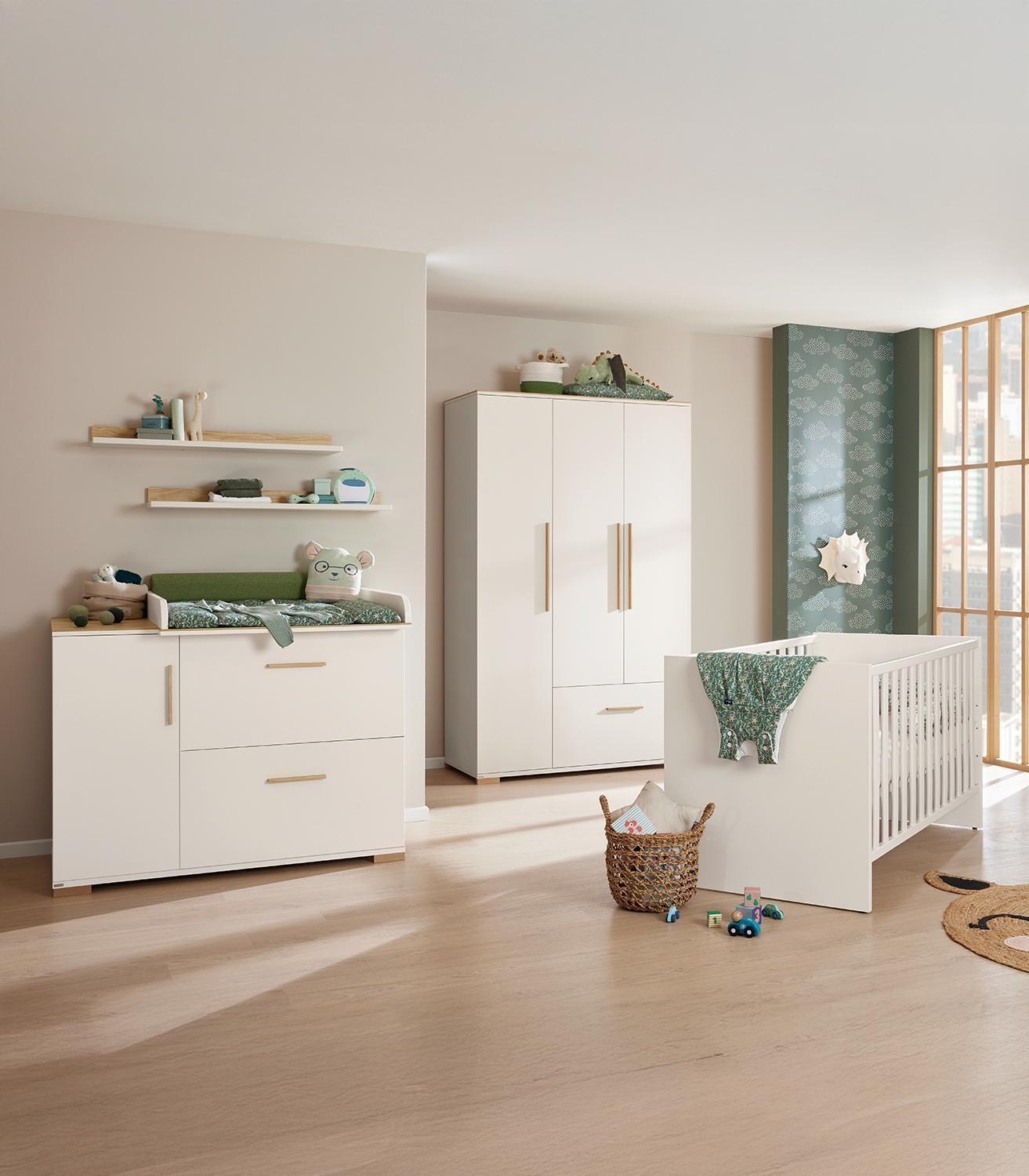 Der Kleiderschrank ENIE der Marke PAIDI ist in Weiß gestaltet, wobei die Stellfüße, Griffe und die Oberplatte in Montana Eiche Dekor abgesetzt sind. Dieser Drehtürenschrank besitzt eine Breite von 124 cm, eine Höhe von 200 cm sowie eine Tiefe von 56 cm. Die Ausstattung umfasst drei Türen und eine Schublade. Im Innenraum befinden sich eine Kleiderstange sowie fünf höhenverstellbare Einlegeböden zur Aufbewahrung von Kleidung.