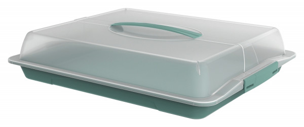 Der Party-Buttler bietet viel Platz für Kuchen oder Snacks. Der Deckel lässt sich mit 2 seitlichen Klappen sicher fixieren.