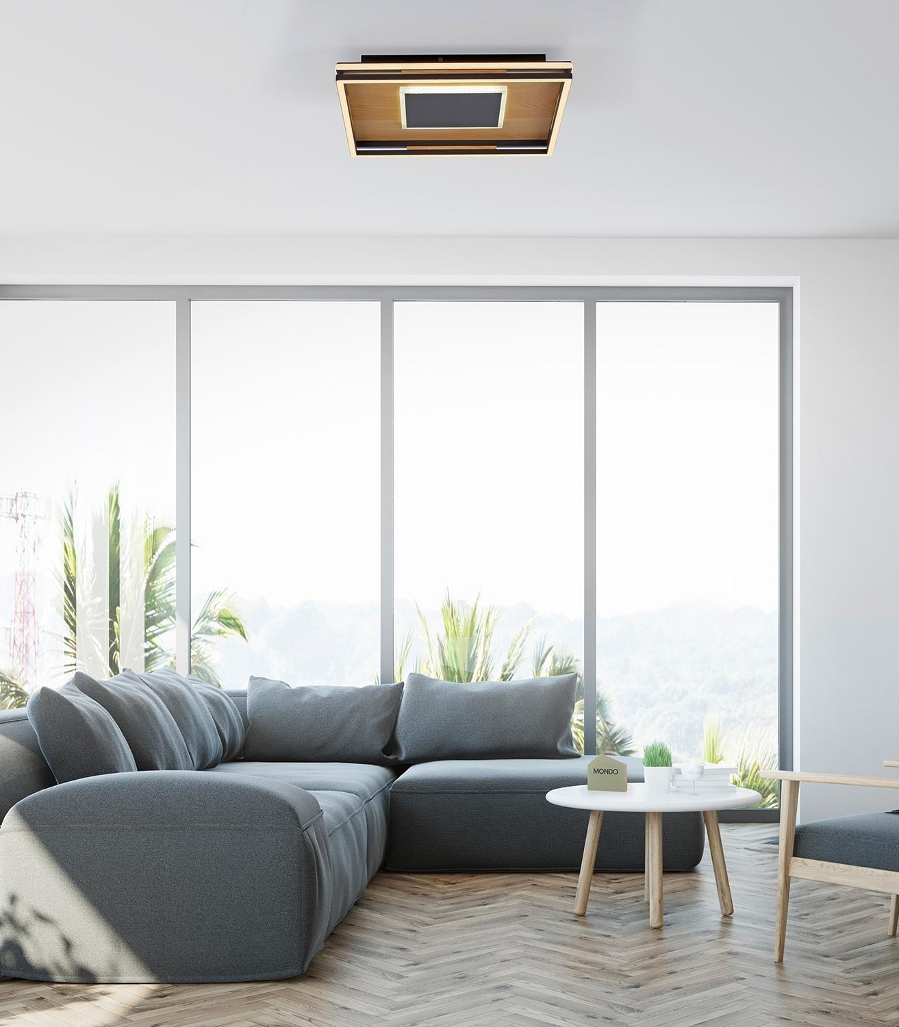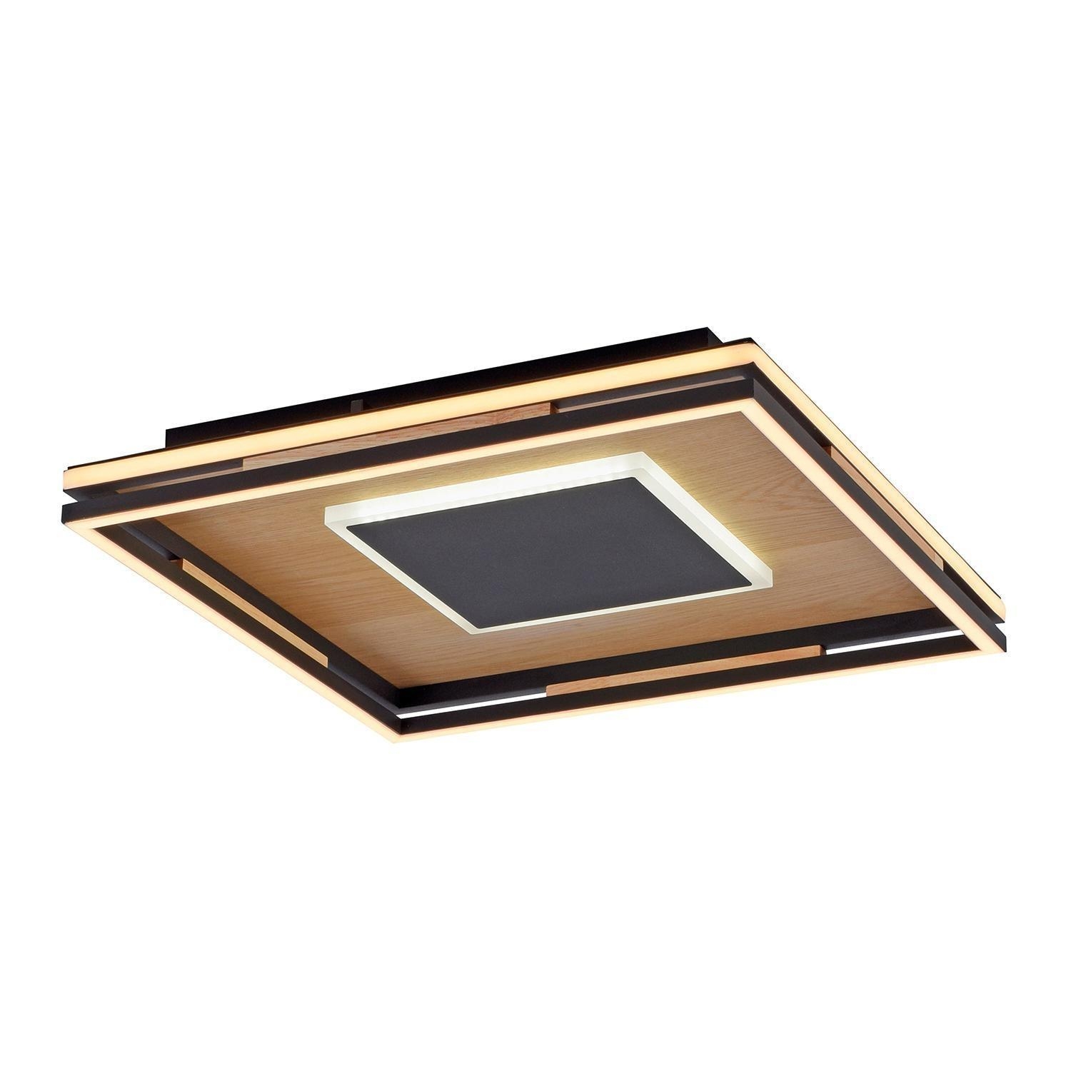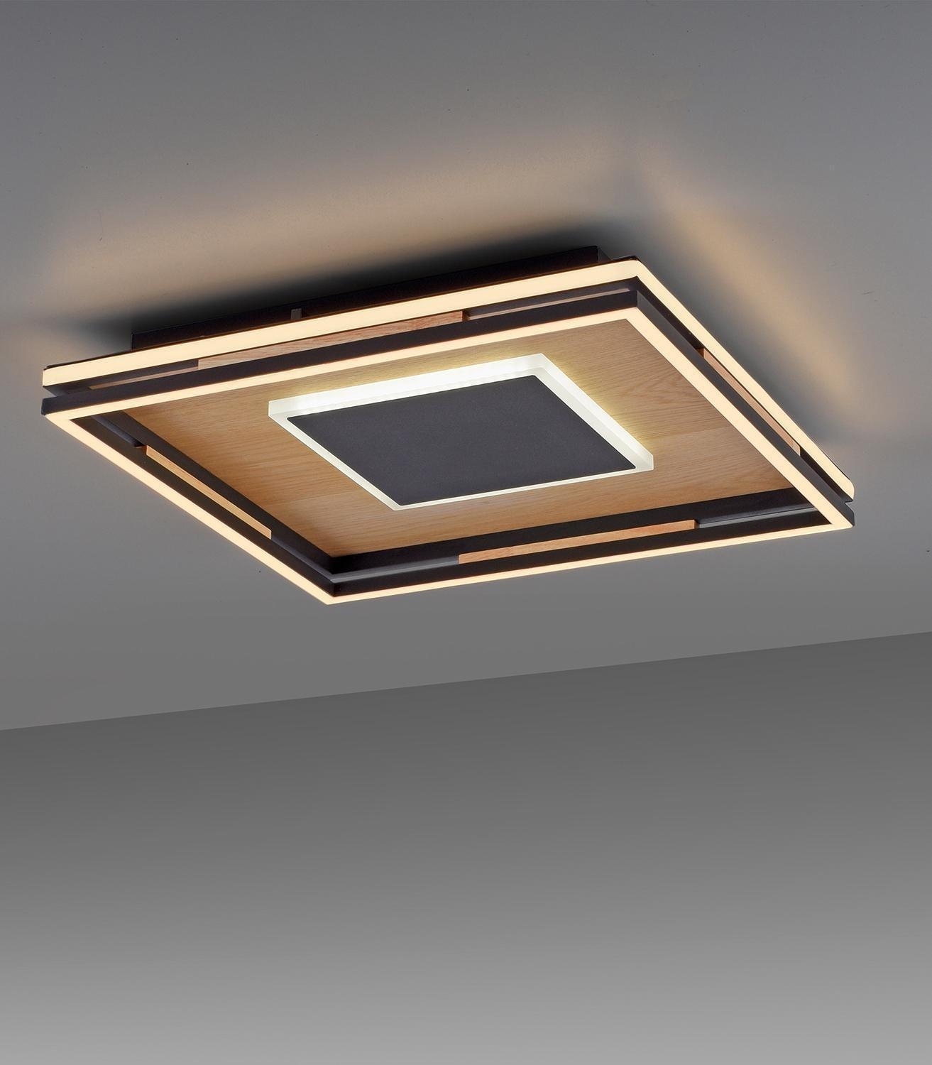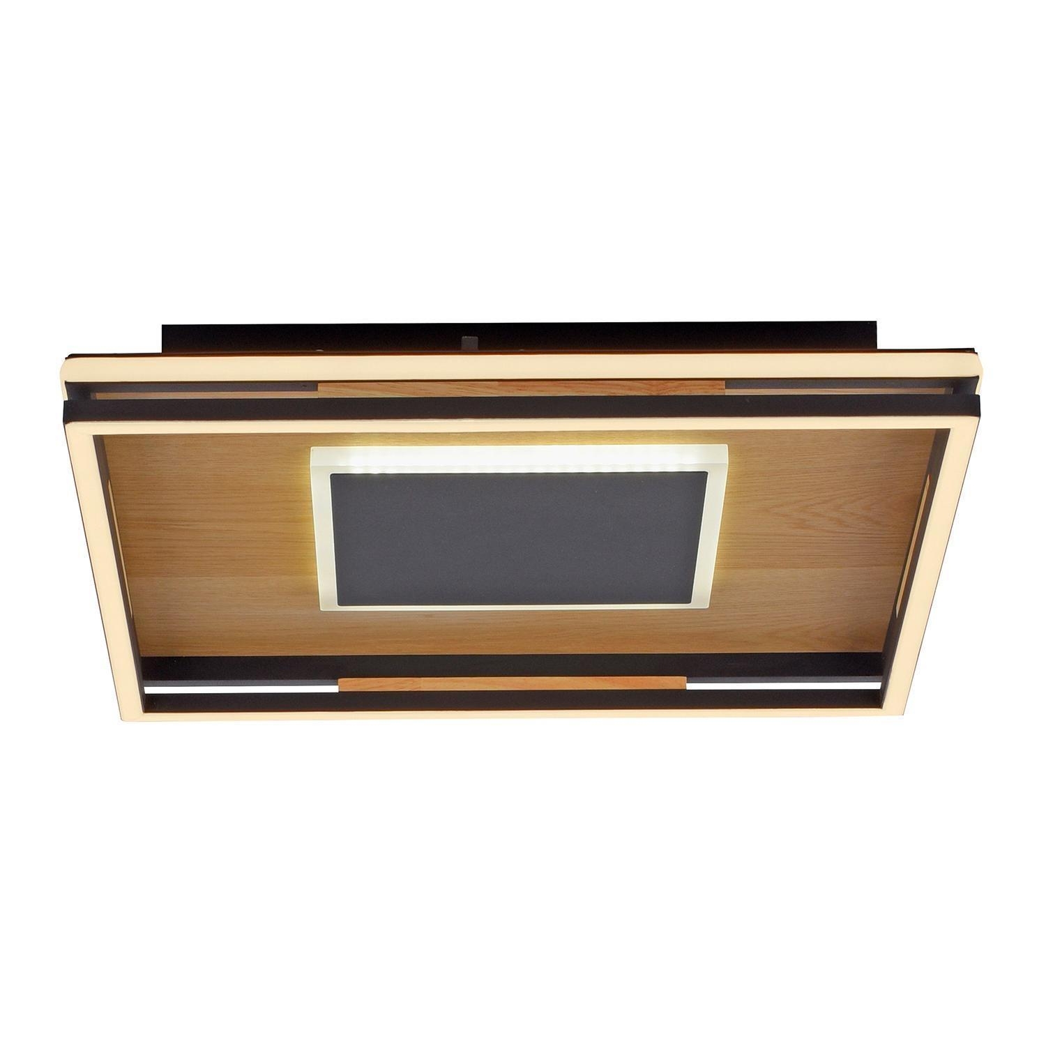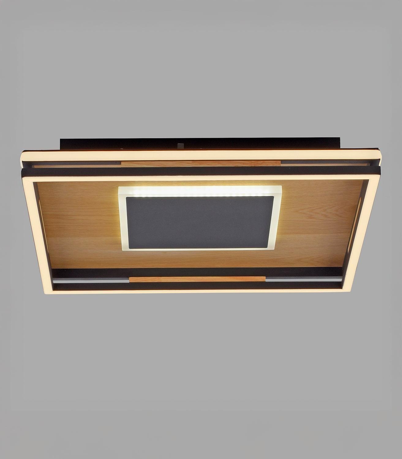 Die LED-Deckenleuchte FAMERA der Marke Paul Neuhaus besteht aus Metall in Schwarz und verfügt über einen Lampenschirm, der teilweise aus Eichenholzfurnier in Braun gefertigt ist. Sie hat eine Breite von 45 cm, eine Höhe von 8 cm und eine Tiefe von 45 cm. Die Leuchte bietet eine Anpassung der Farbtemperatur sowie eine Dimmfunktion und ist mit einer Memoryfunktion ausgestattet. Die Steuerung erfolgt über eine im Lieferumfang enthaltene Fernbedienung. Die Leistung beträgt 40 Watt bei einer Helligkeit von 4200 Lumen und einer einstellbaren Lichtfarbe von 2700 bis 5000 Kelvin im warm- und neutralweißen Bereich.