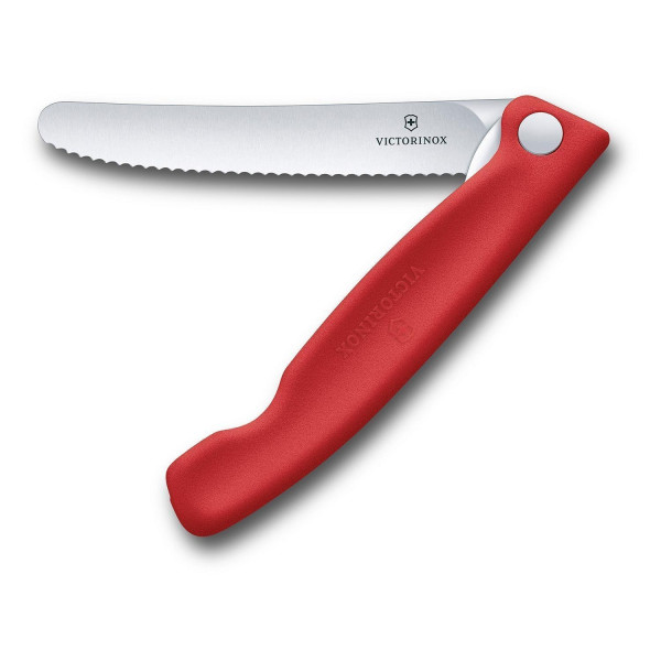 Das Picknickmesser SWISS CLASSIC verfügt über eine 11 cm lange Klinge aus rostfreiem Stahl mit Wellenschliff und eignet sich zum Schneiden von Lebensmitteln. Der ergonomisch geformte Griff besteht aus rotem Kunststoff.