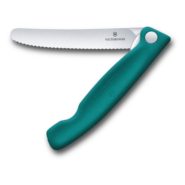Das Picknickmesser SWISS CLASSIC verfügt über eine 11 cm lange Klinge aus rostfreiem Stahl mit Wellenschliff und eignet sich zum Schneiden von Lebensmitteln. Der ergonomisch geformte Griff besteht aus grünem Kunststoff.