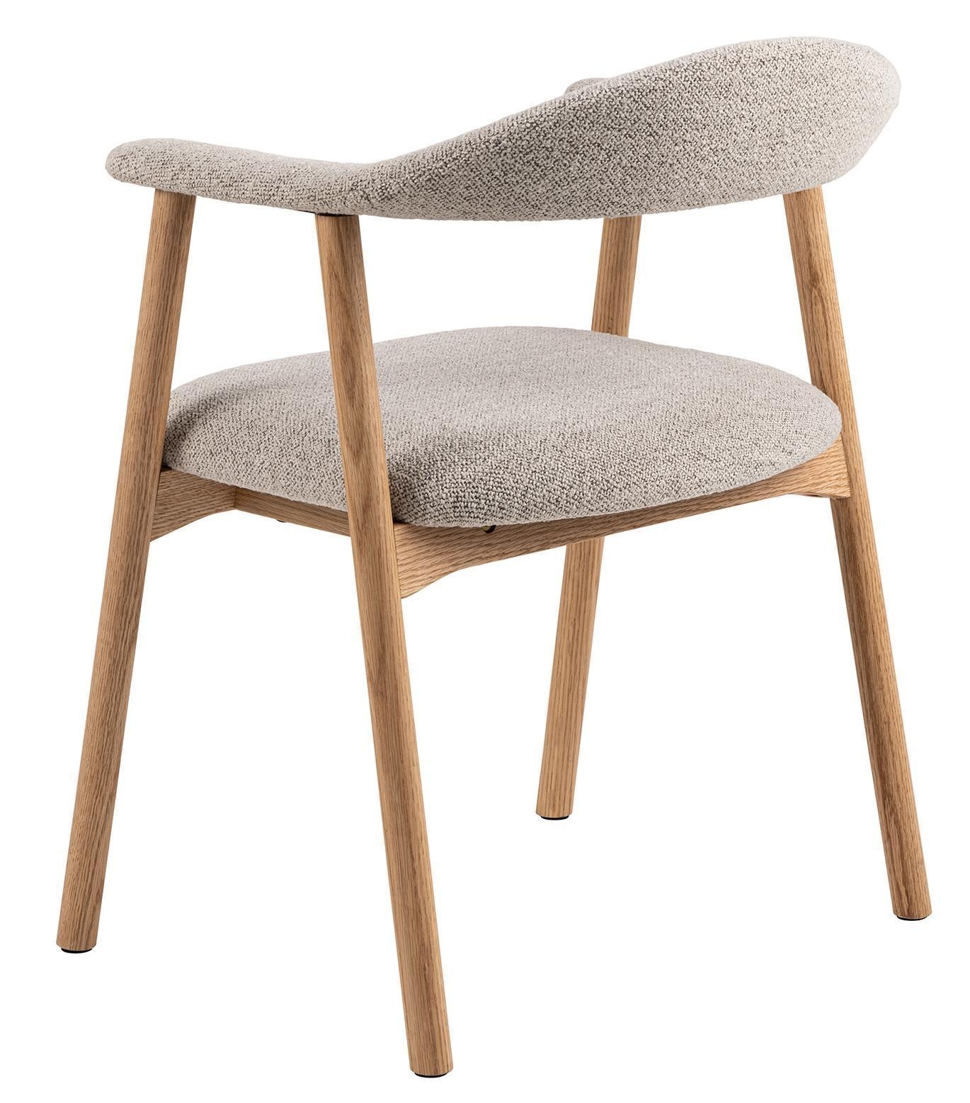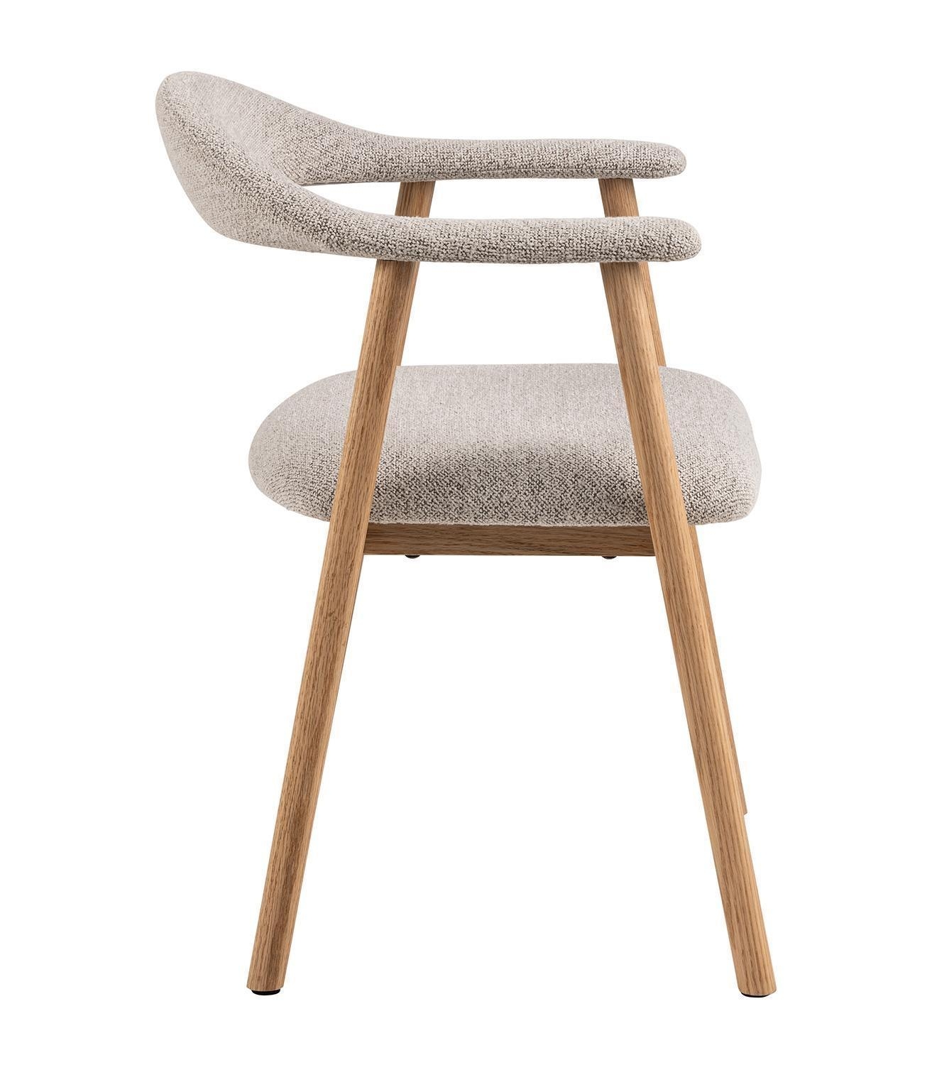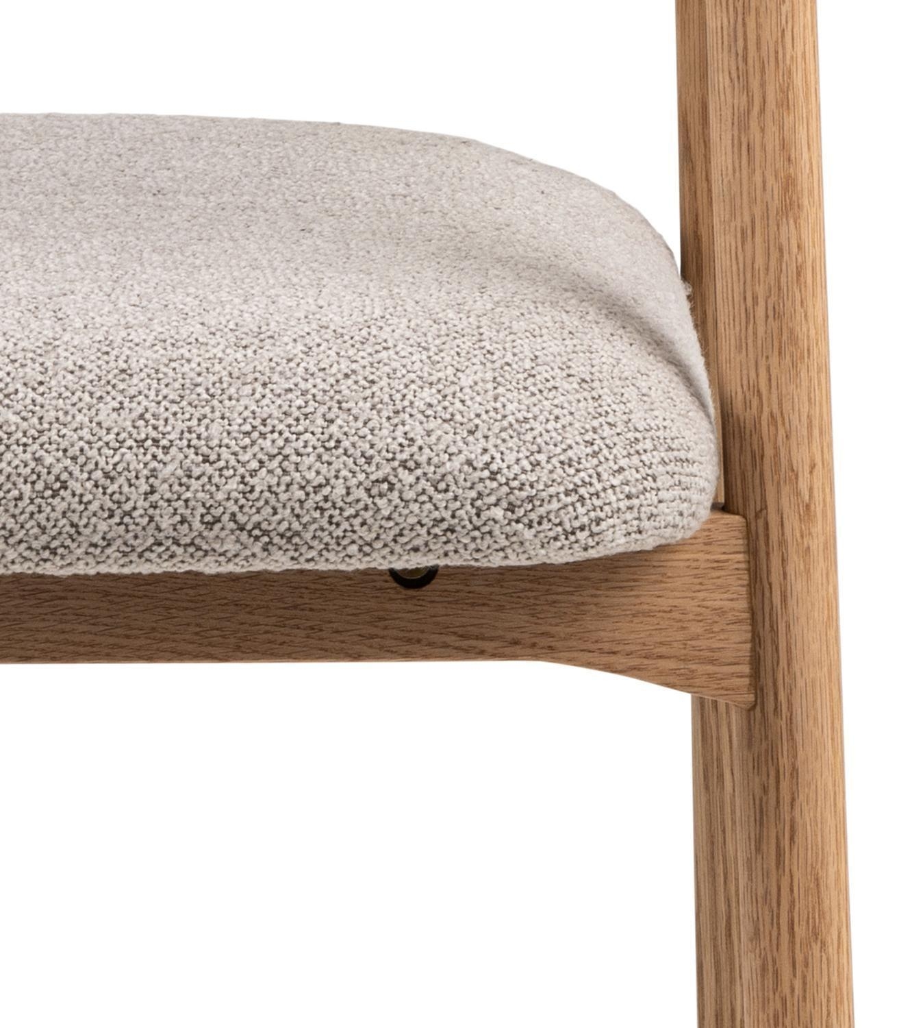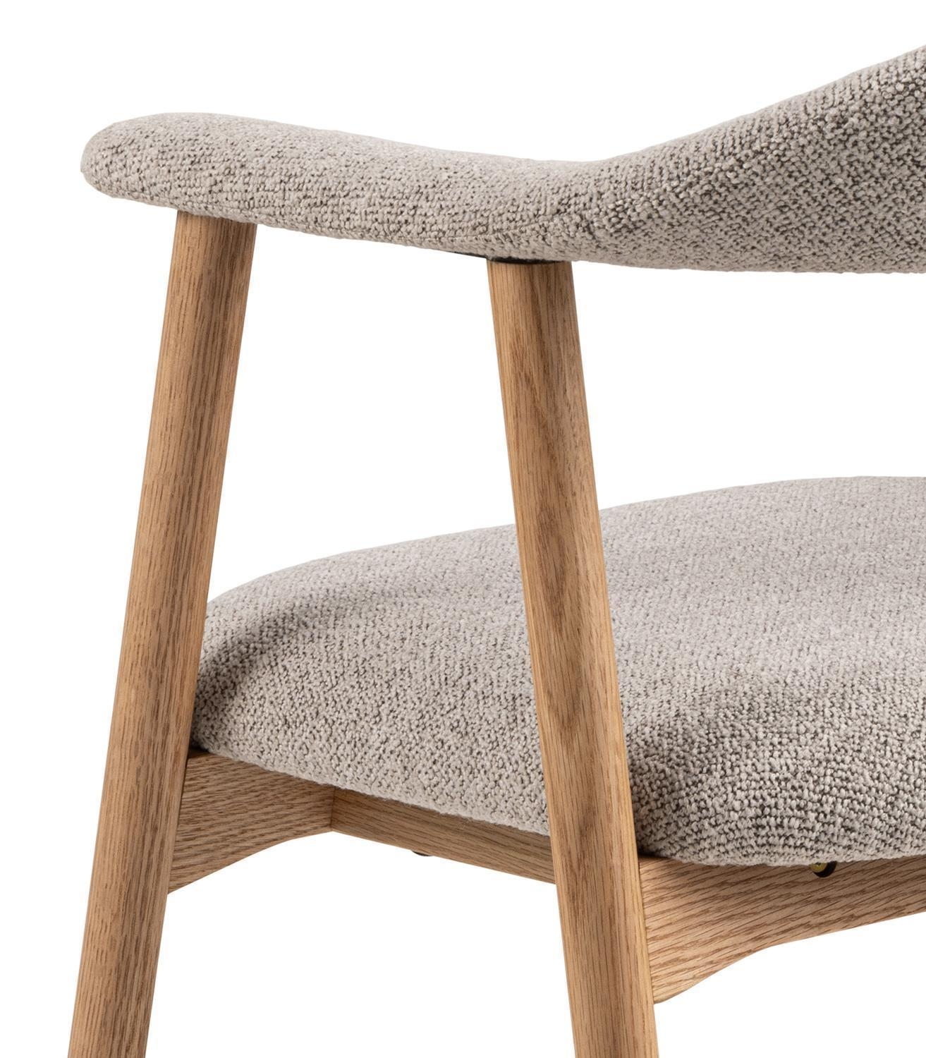 Der Polsterstuhl ALFONS ist mit einem Boucléstoff in Beige bezogen. Das Gestell besteht aus massivem Eichenholz und verfügt über eine geölte Oberflächenbehandlung. Der Stuhl ist mit gepolsterten Armlehnen ausgestattet und bis maximal 110 kg belastbar. Er misst 56 cm in der Breite, 76 cm in der Höhe und 54 cm in der Tiefe. Die Sitzfläche hat eine Breite von 47 cm, eine Höhe von 47 cm und eine Tiefe von 45 cm.