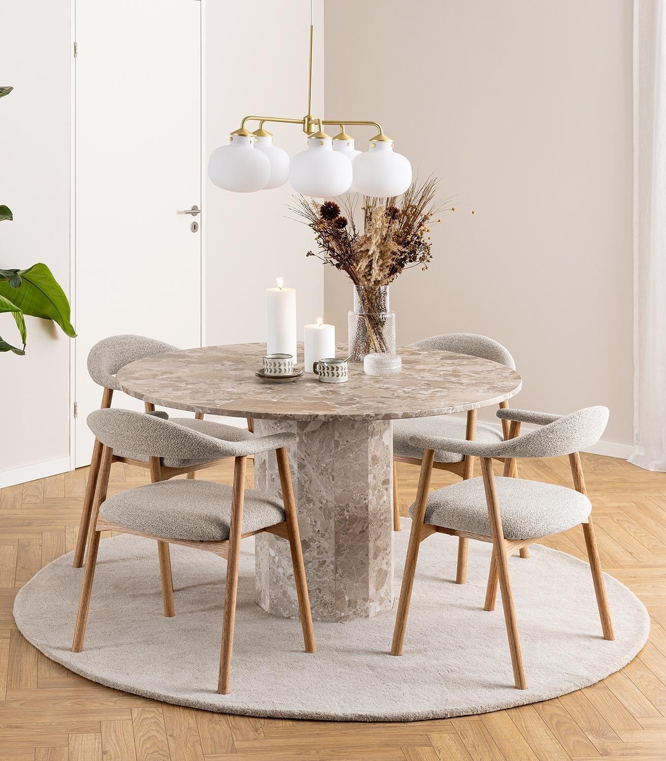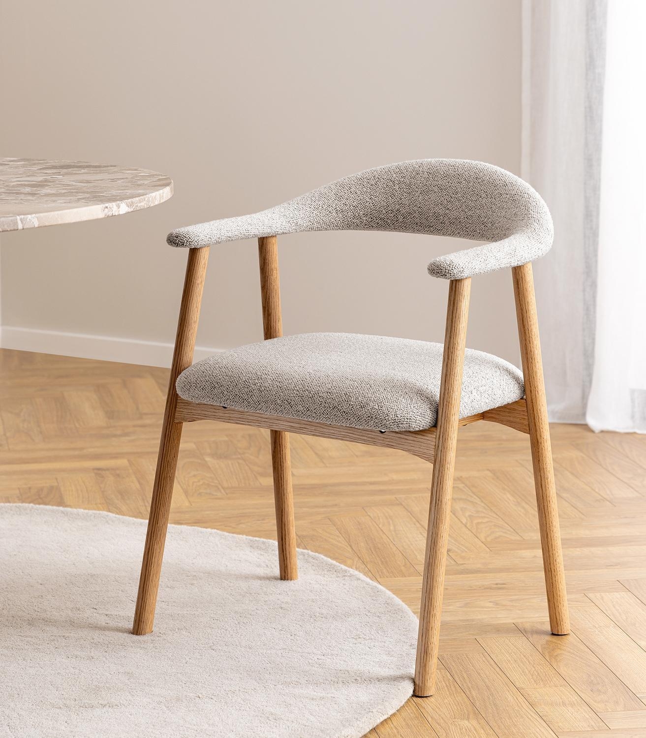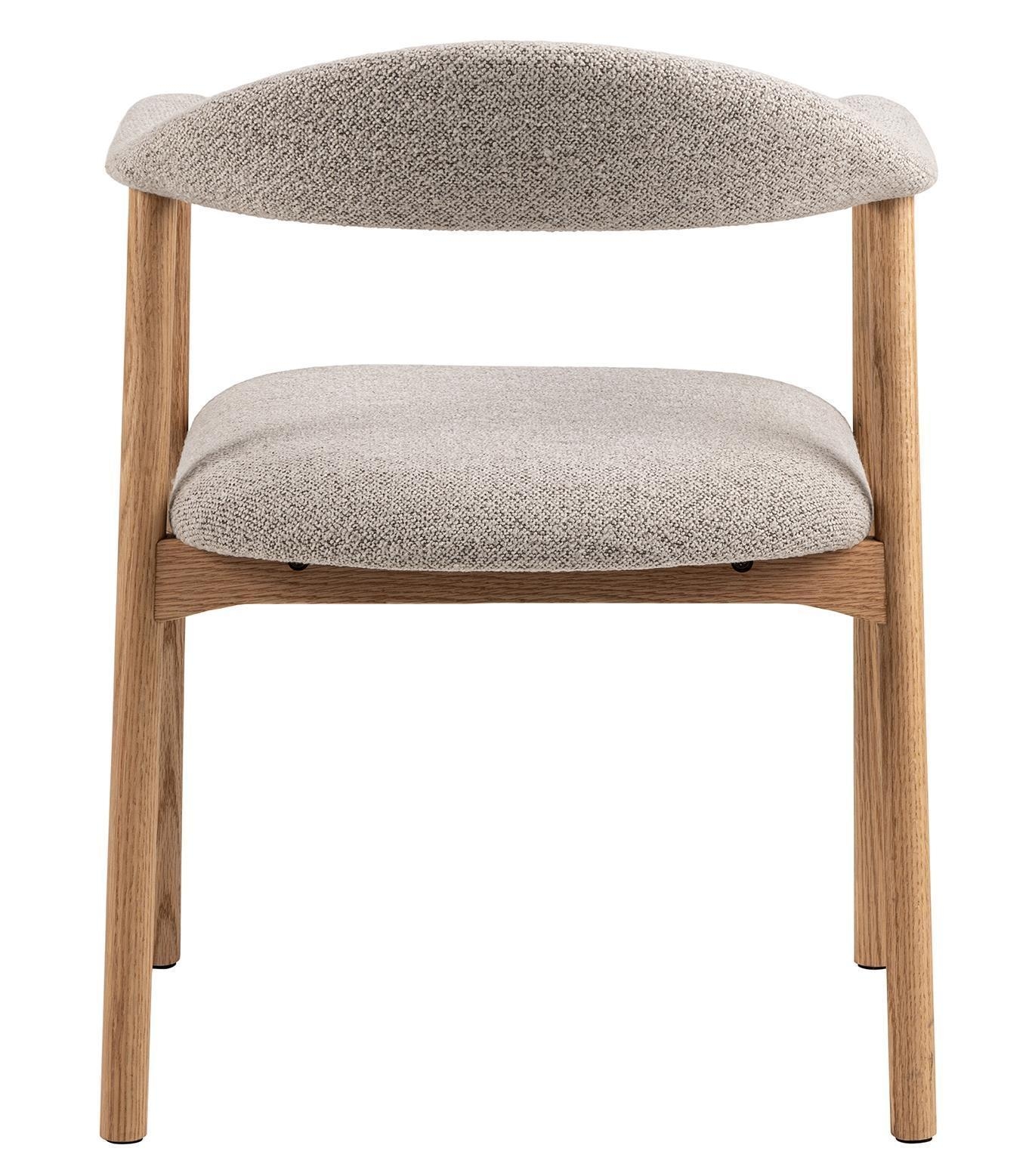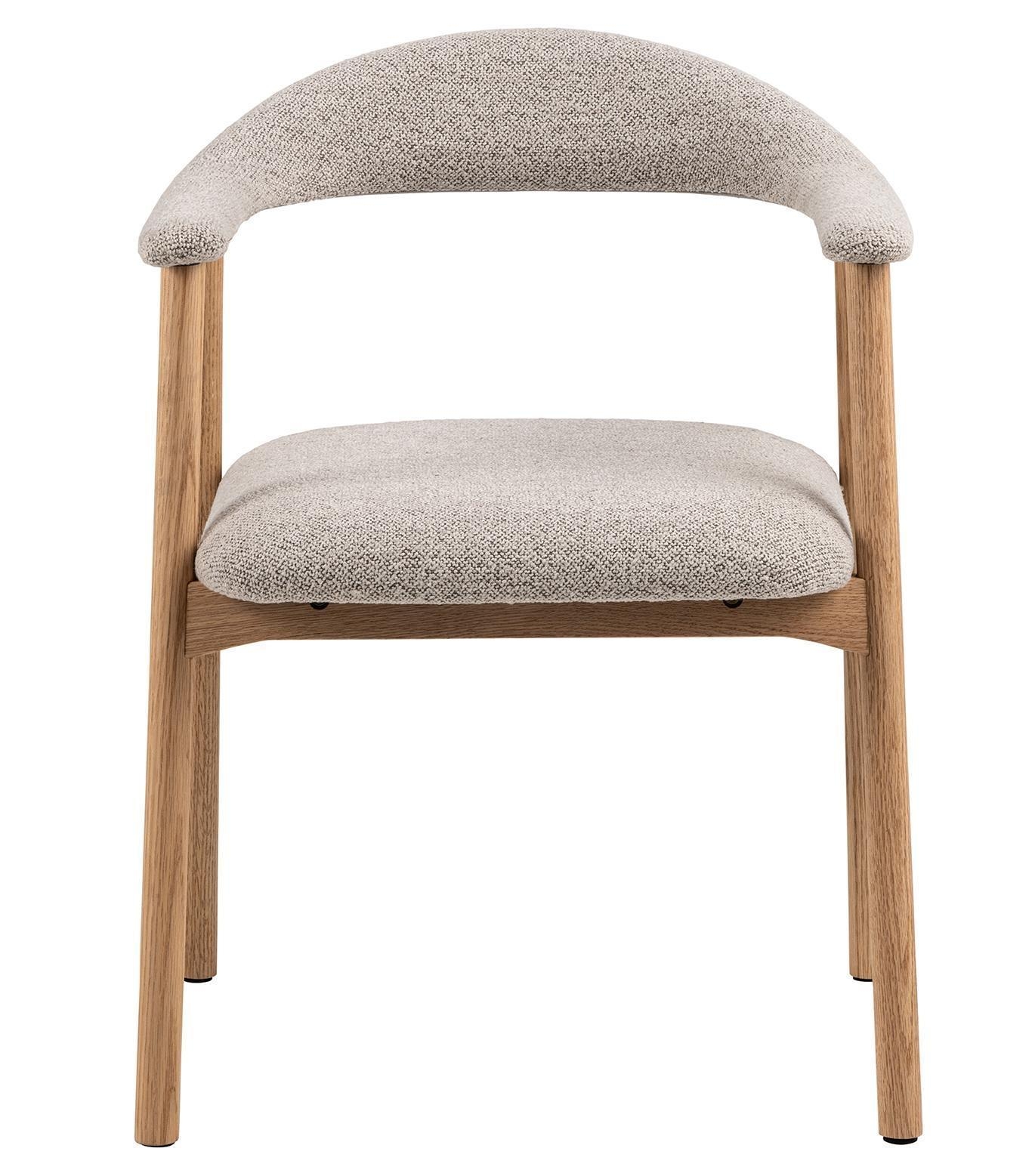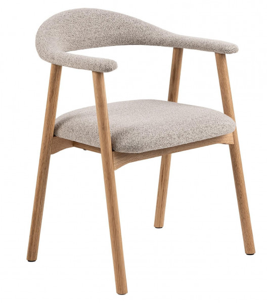 Der Polsterstuhl ALFONS ist mit einem Boucléstoff in Beige bezogen. Das Gestell besteht aus massivem Eichenholz und verfügt über eine geölte Oberflächenbehandlung. Der Stuhl ist mit gepolsterten Armlehnen ausgestattet und bis maximal 110 kg belastbar. Er misst 56 cm in der Breite, 76 cm in der Höhe und 54 cm in der Tiefe. Die Sitzfläche hat eine Breite von 47 cm, eine Höhe von 47 cm und eine Tiefe von 45 cm.