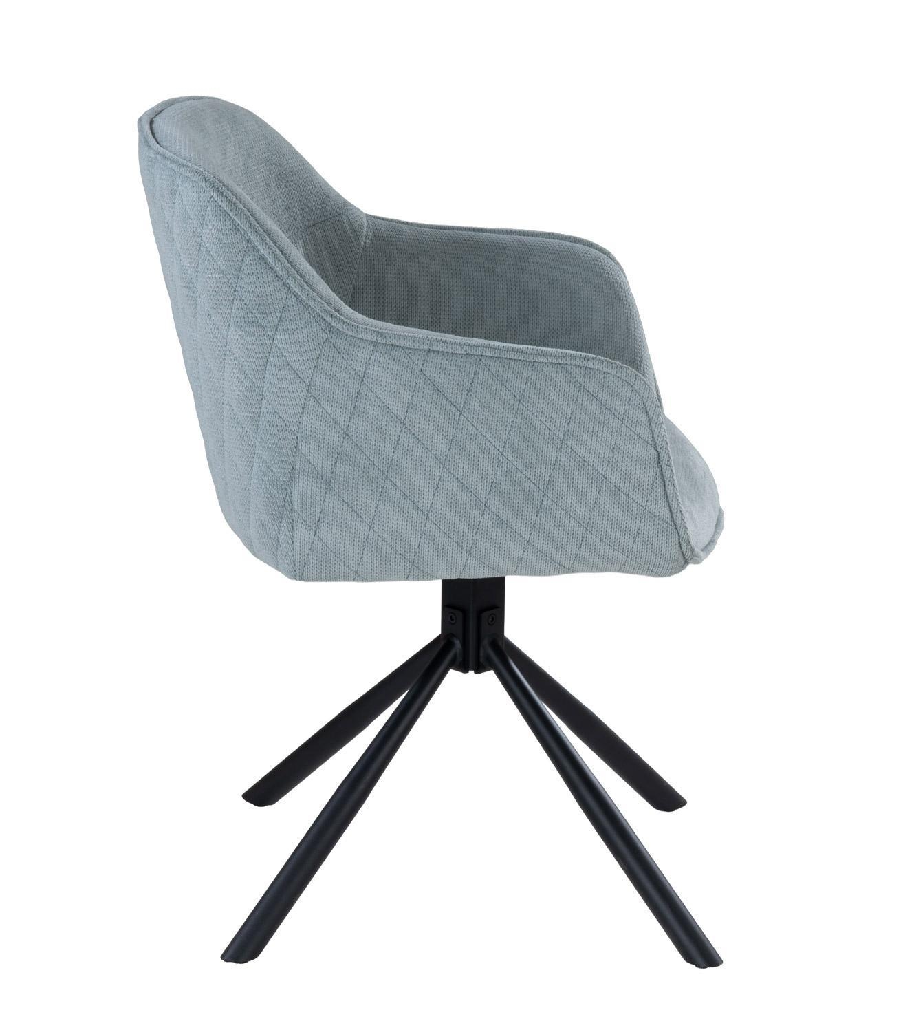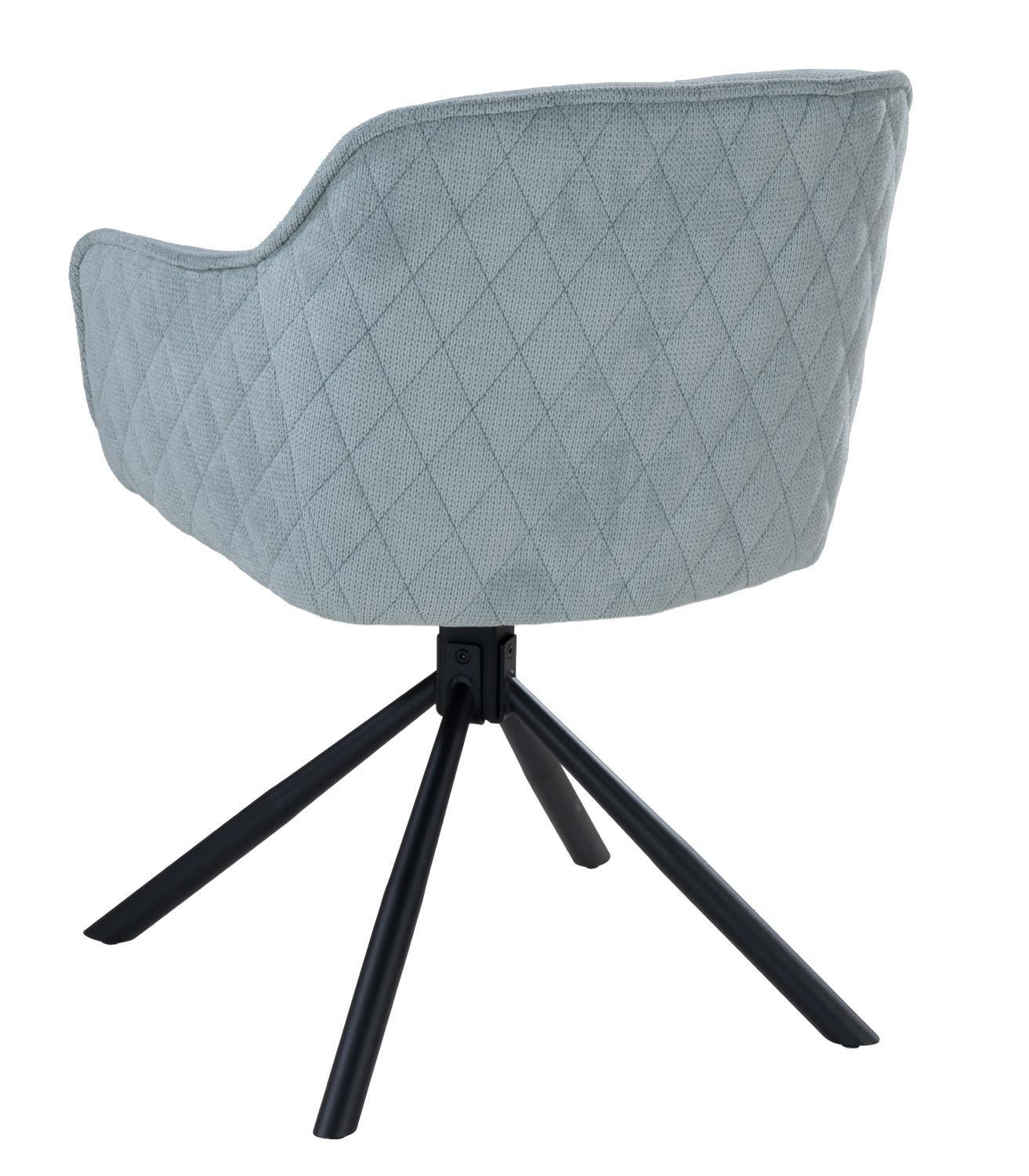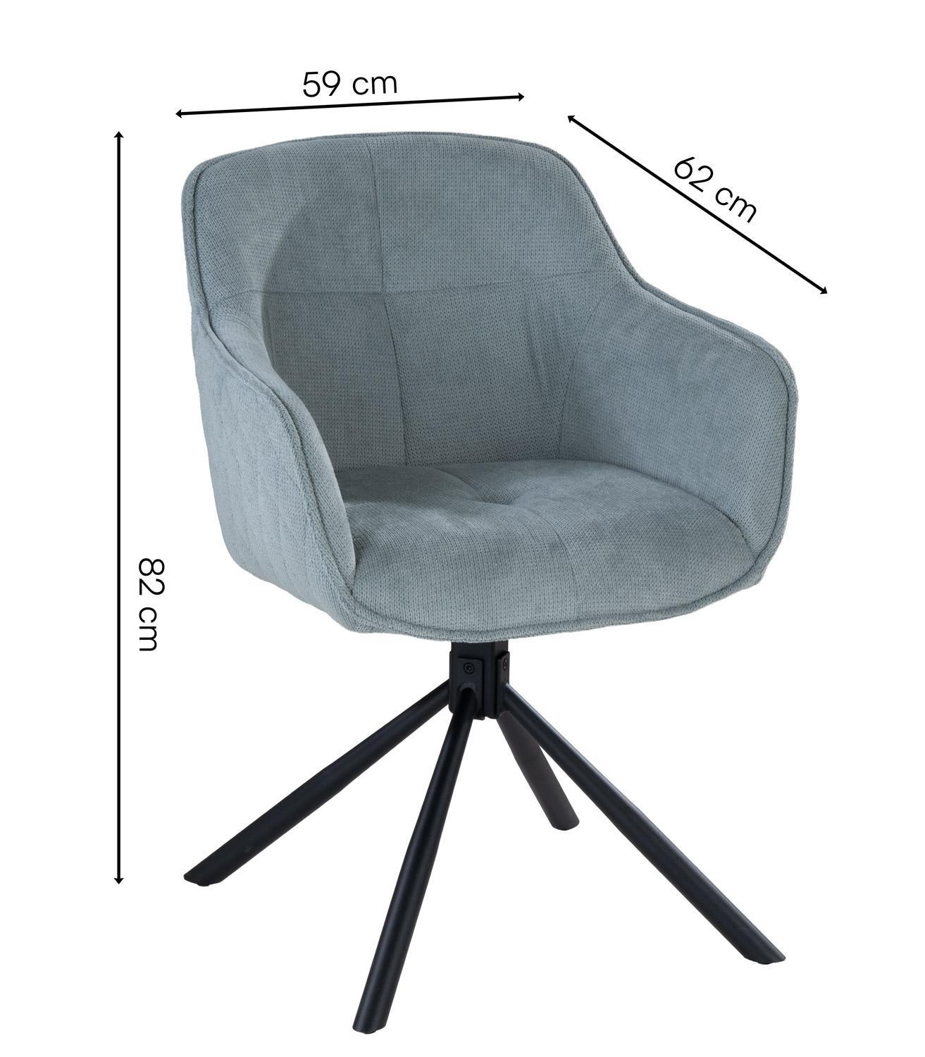 Der Polsterstuhl ERWIN ist mit einem salbeigrünen Webstoffbezug ausgestattet. Das Gestell besteht aus schwarzem Metall und bietet eine stabile Basis. Der Außenbezug ist mit Diamantsteppungen versehen, die dem Stuhl eine strukturierte Oberfläche verleihen. Die Sitzschale ist um 180 Grad drehbar und verfügt über eine automatische Rückholfunktion. Die maximale Belastbarkeit beträgt 120 kg. Die Abmessungen des Stuhls betragen 59 cm in der Breite, 82 cm in der Höhe und 62 cm in der Tiefe.