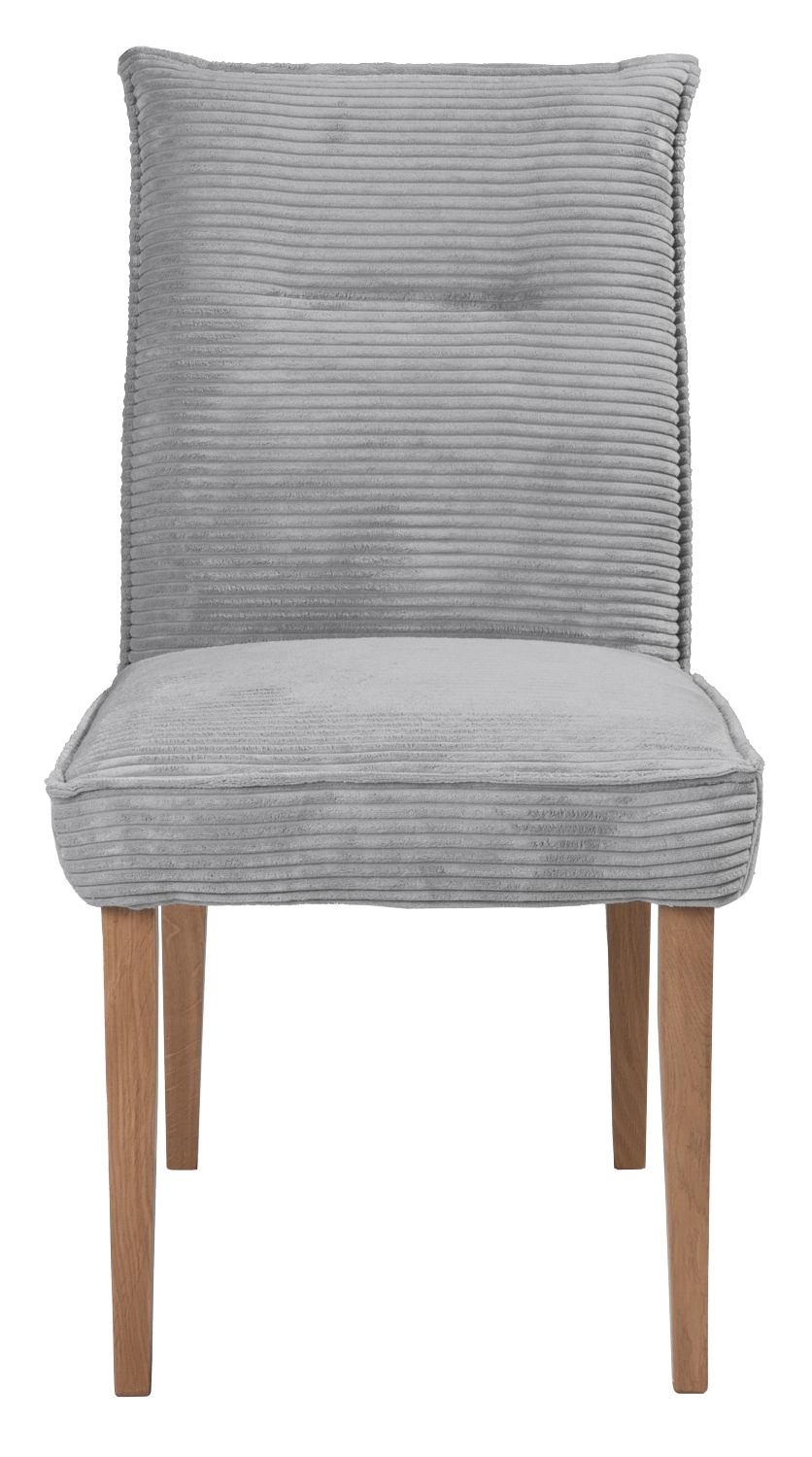 Der Polsterstuhl FRANKA vereint zeitloses Design und Komfort. Mit einem Cordbezug in hellgrau und Beinen aus massivem Eichenholz ist er eine stilvolle Ergänzung für die Küche, das Ess- oder Wohnzimmer. Die Rückenfläche ist mit einer dekorativen Steppung versehen, die dem Stuhl eine ansprechende Optik verleiht. Der Stuhlrücken ist zudem mit Echtstoff überzogen, was für eine hochwertige Verarbeitung spricht. Mit einer Breite von 48 cm, einer Höhe von 88 cm und einer Tiefe von 57 cm bietet der Stuhl ausreichend Platz und eine bequeme Sitzposition.