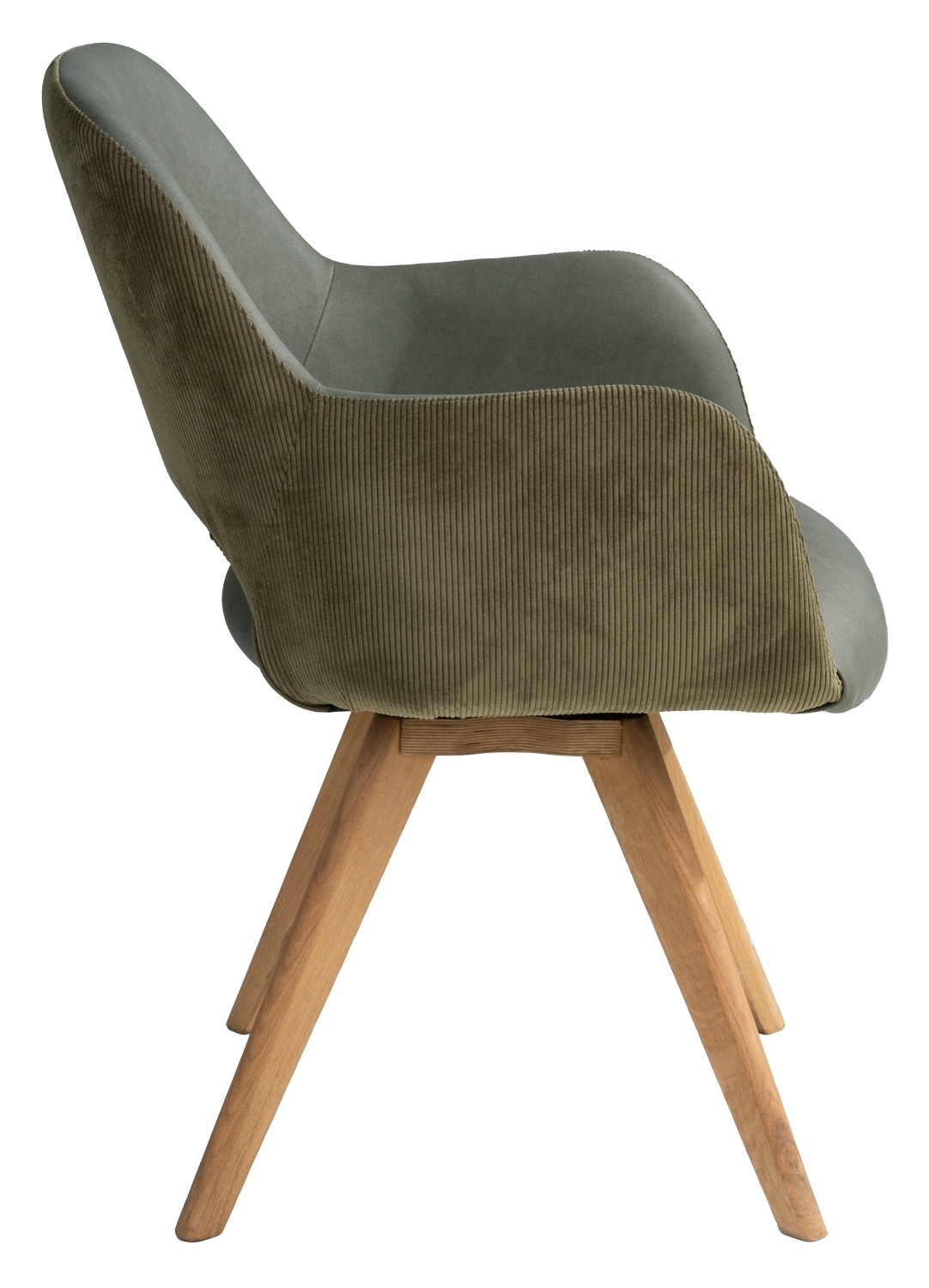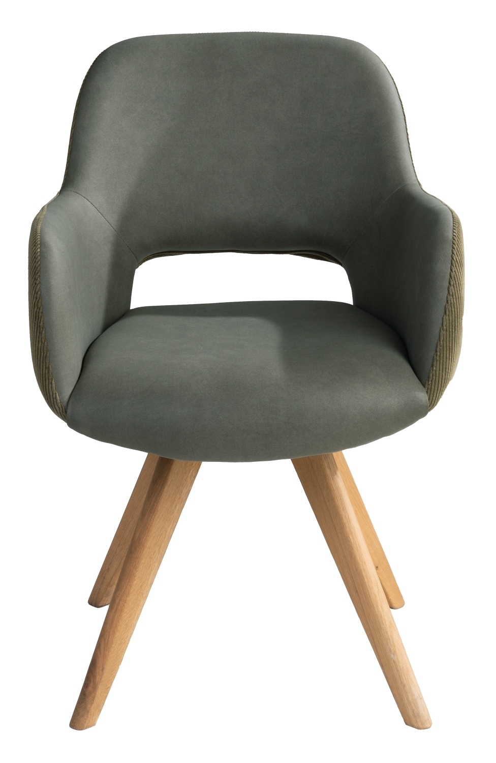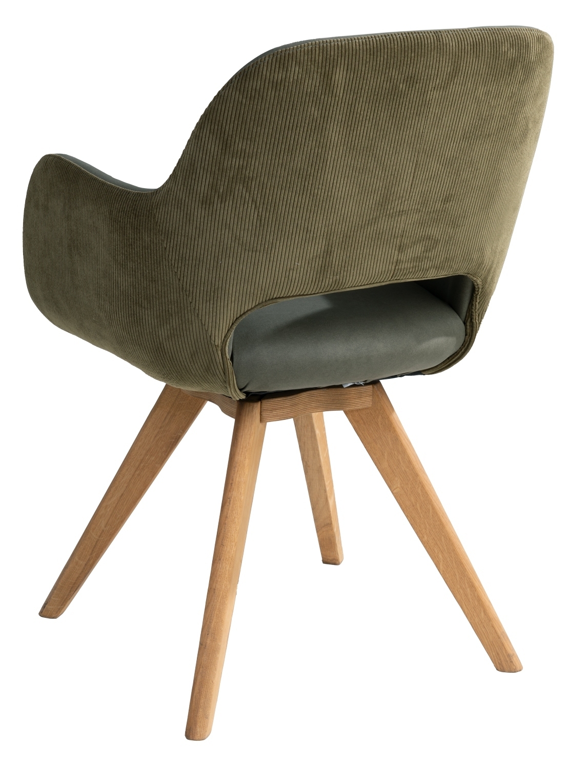 Der Polsterstuhl KARNIO präsentiert sich mit einem innovativen Design und funktionalen Merkmalen. Sein Innenbezug aus grünem Stoff und der Außenbezug aus grünem Stoff in Cordoptik verleihen ihm eine moderne Ästhetik. Das Gestell aus massivem Eichenholz sorgt für Stabilität und Langlebigkeit. Eine Besonderheit des Stuhls ist die Öffnung in der Rückenlehne, die dem Design eine einzigartige Note verleiht. Zusätzlich ist der Stuhl mit einer Drehfunktion ausgestattet, die Flexibilität bietet.