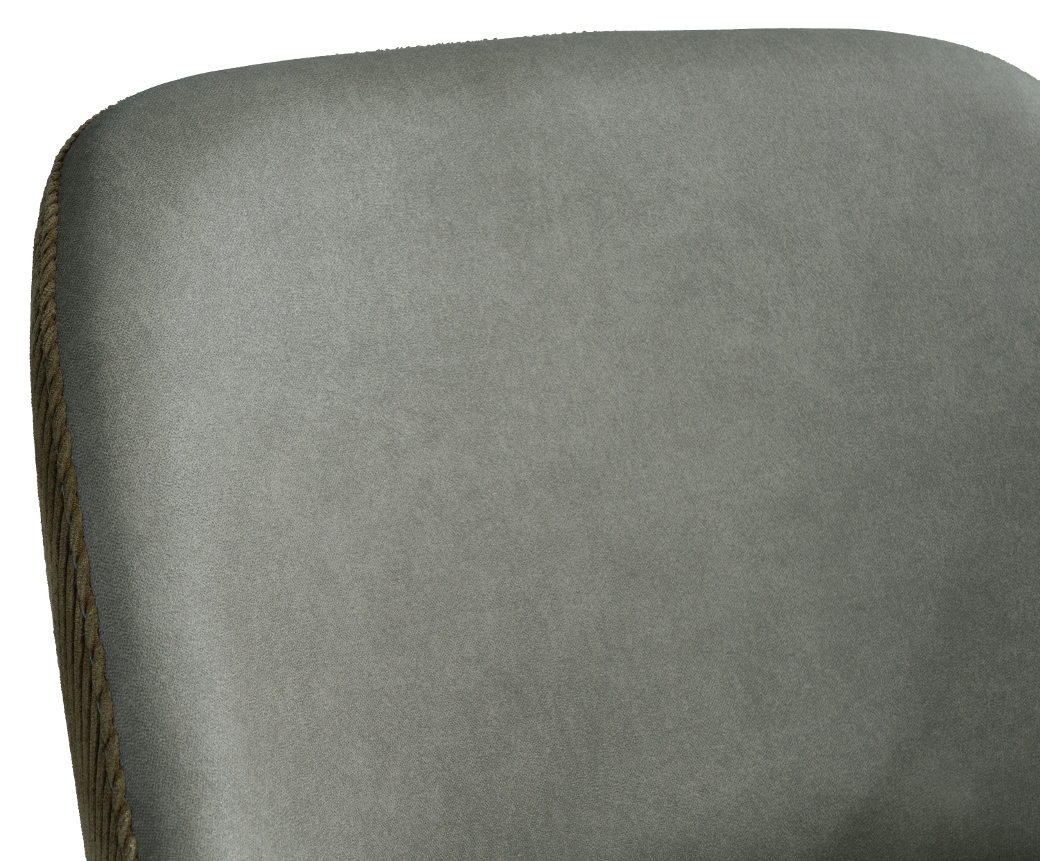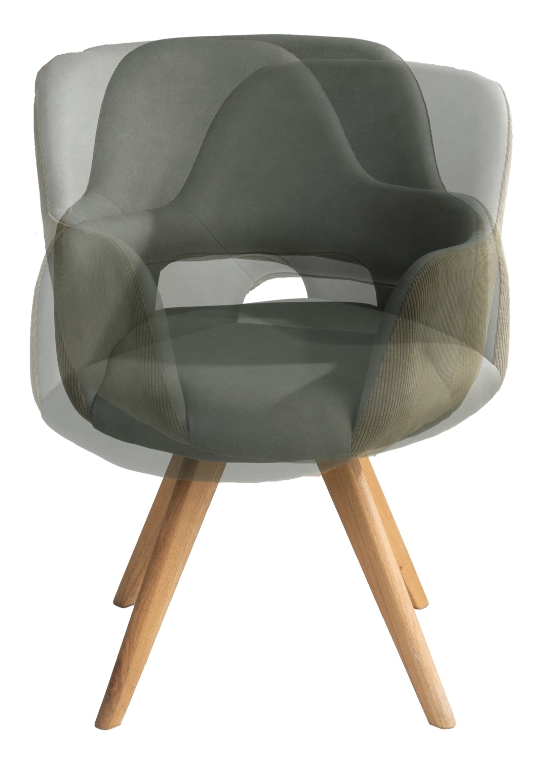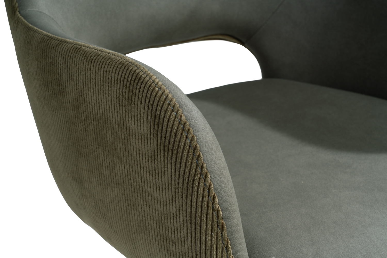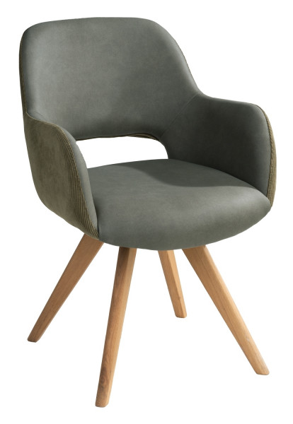 Der Polsterstuhl KARNIO präsentiert sich mit einem innovativen Design und funktionalen Merkmalen. Sein Innenbezug aus grünem Stoff und der Außenbezug aus grünem Stoff in Cordoptik verleihen ihm eine moderne Ästhetik. Das Gestell aus massivem Eichenholz sorgt für Stabilität und Langlebigkeit. Eine Besonderheit des Stuhls ist die Öffnung in der Rückenlehne, die dem Design eine einzigartige Note verleiht. Zusätzlich ist der Stuhl mit einer Drehfunktion ausgestattet, die Flexibilität bietet.