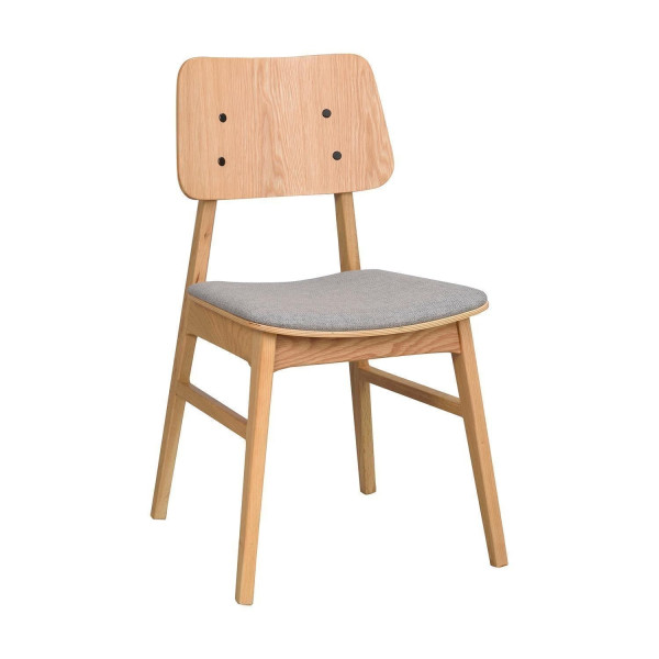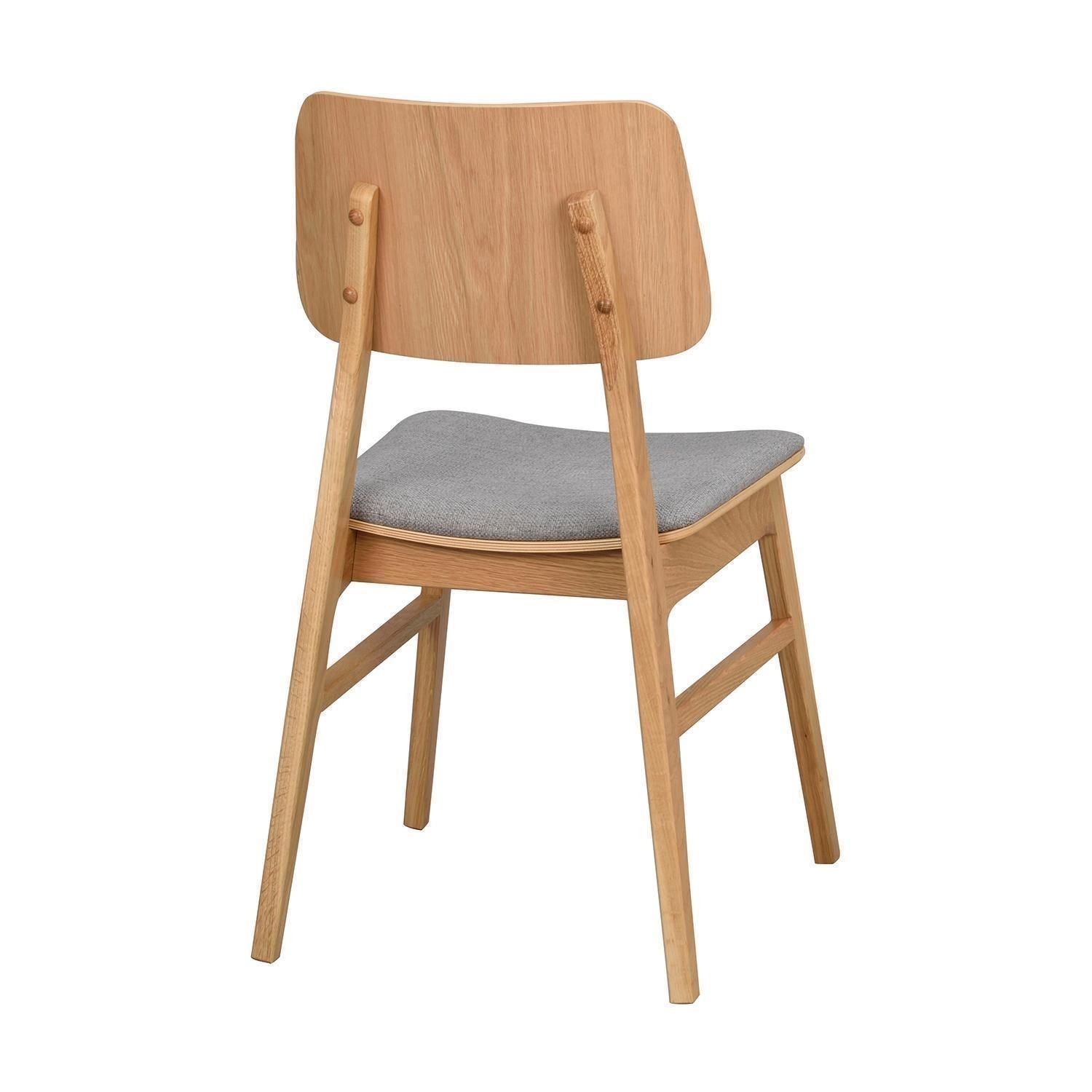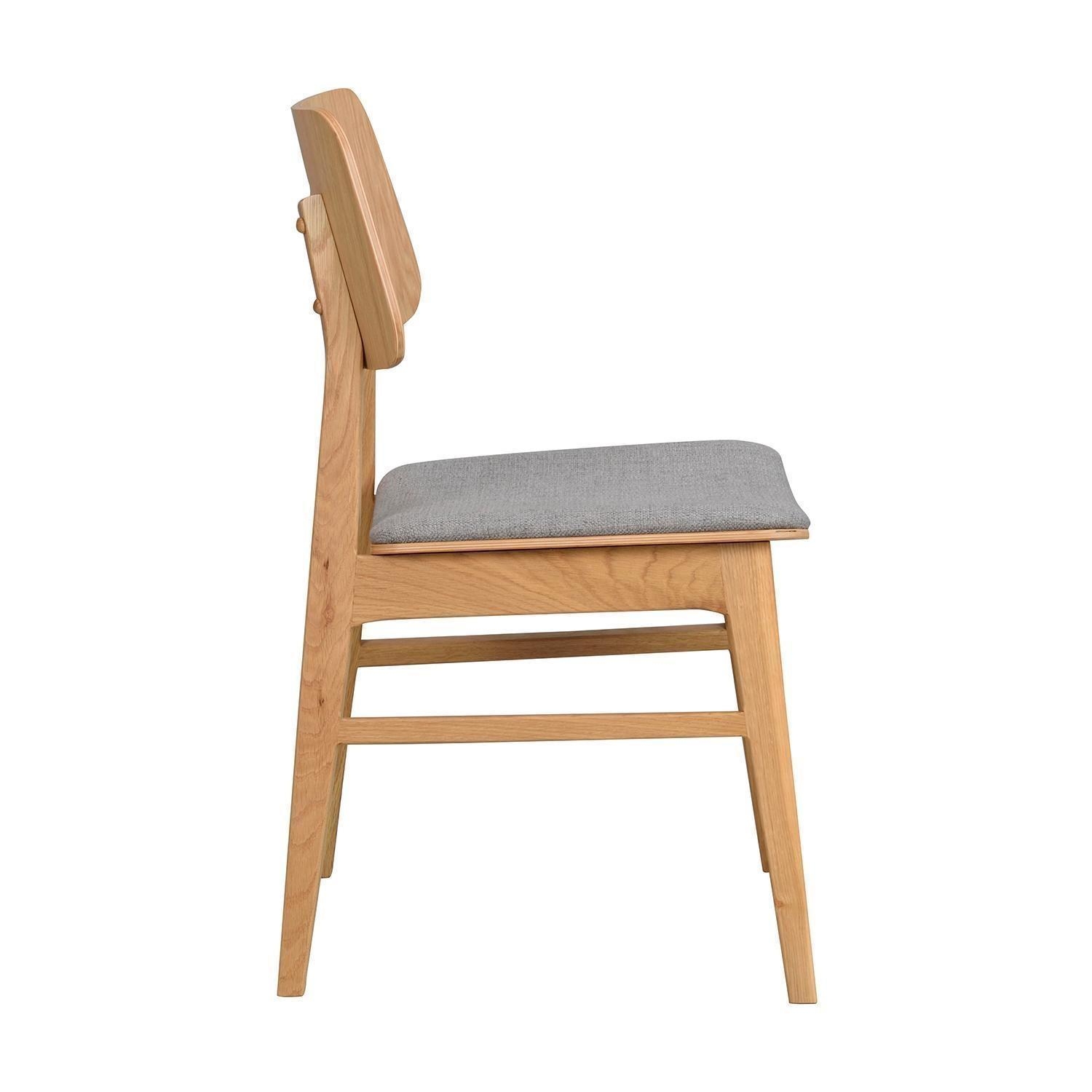 Der Polsterstuhl NAGANO besteht aus massivem Eichenholz und ist mit einem Sitzkissenbezug aus hellgrauem Stoff ausgestattet. Er verfügt über eine gebogene Rückenlehne und ist vielseitig einsetzbar in Küche, Ess- und Wohnzimmer. Die Breite beträgt 50 cm, die Höhe 85 cm und die Tiefe 51 cm. Die Sitzhöhe liegt bei 46 cm.