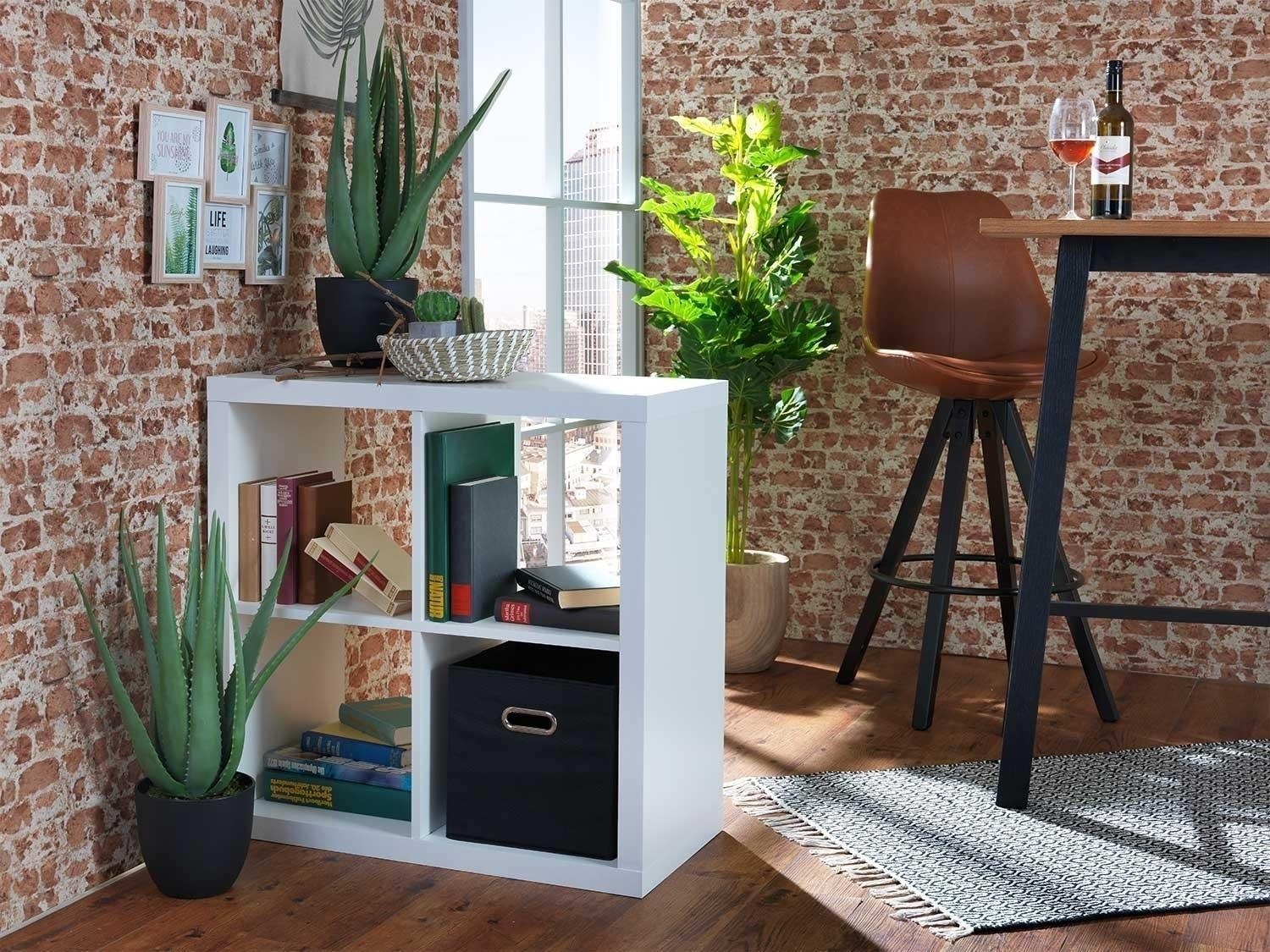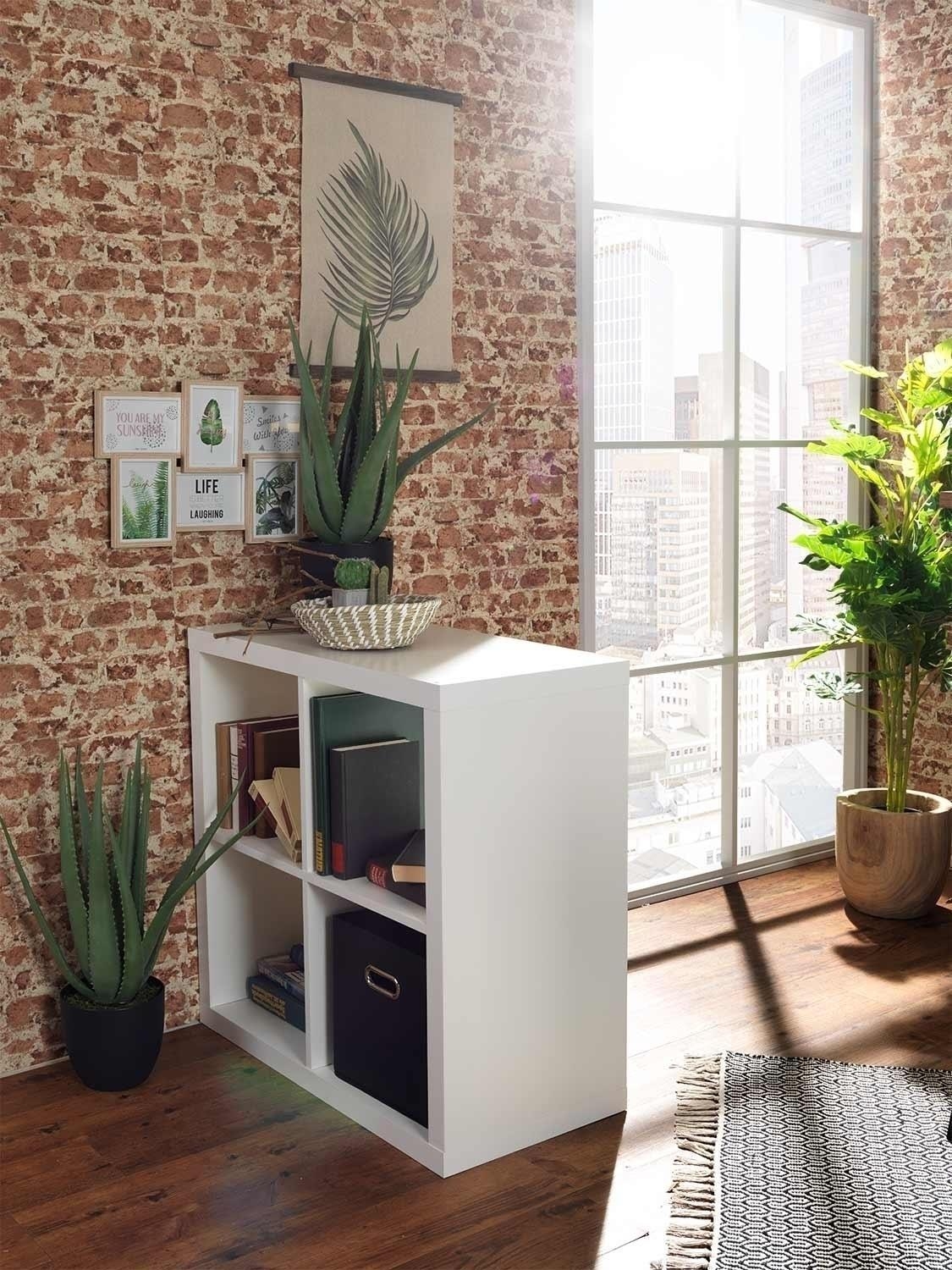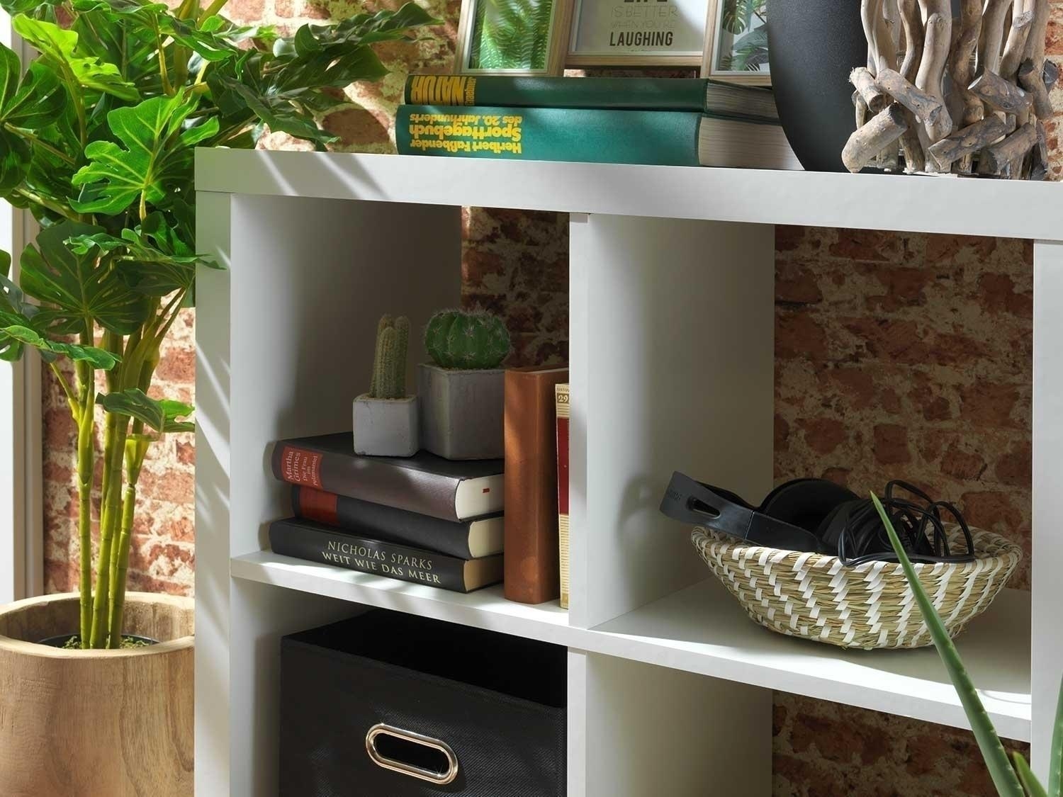 Der Raumteiler bietet Ihnen 4 große Fächer um Deko, Bücher und Co. unterbringen zu können. Das weiße Dekor lässt das Regal schlicht und elegant zugleich aussehen. Das Regal lässt auch auf der oberen Fläche Platz für beispielsweise die Ablage von Schlüsseln und Magazinen.