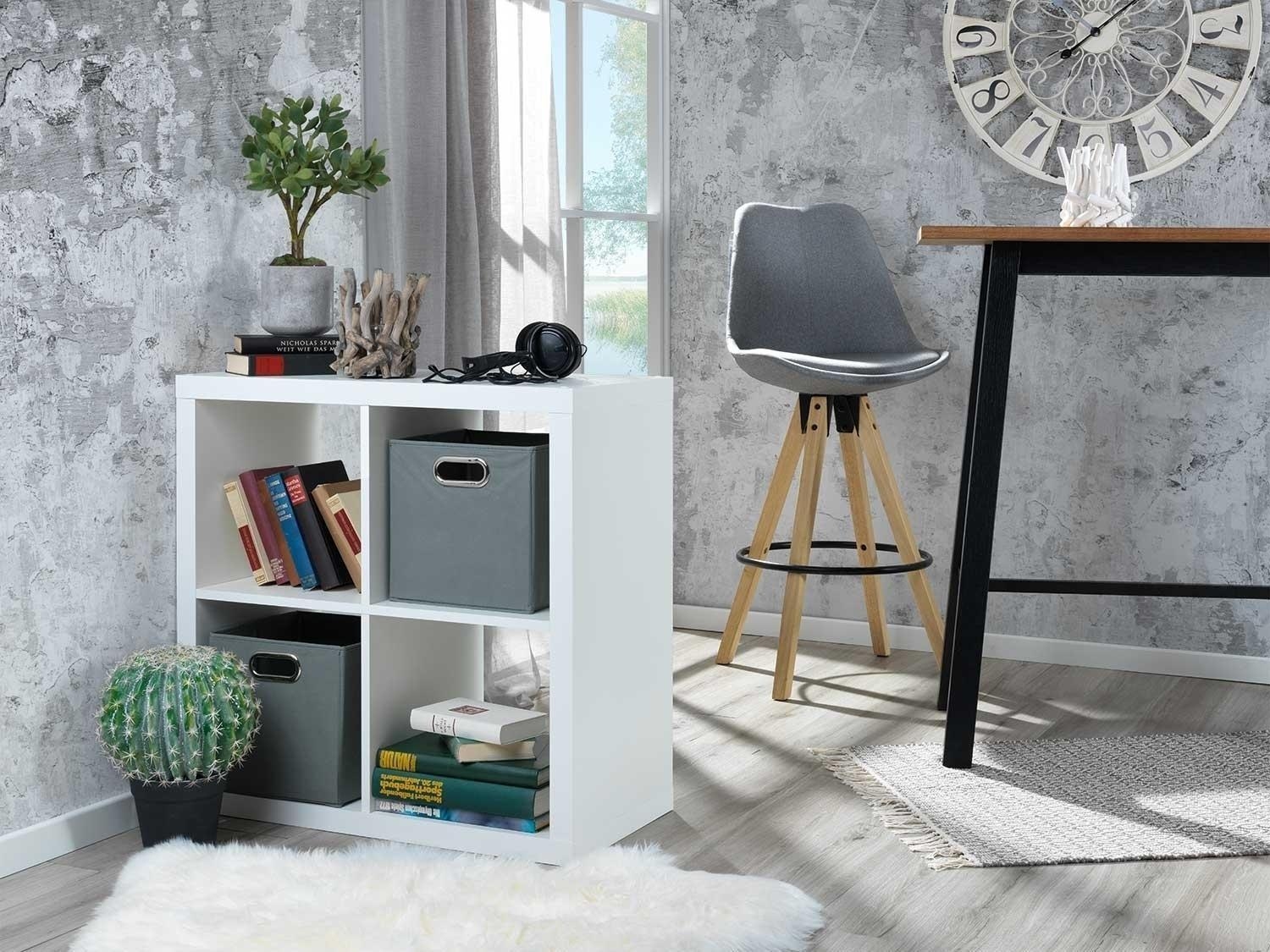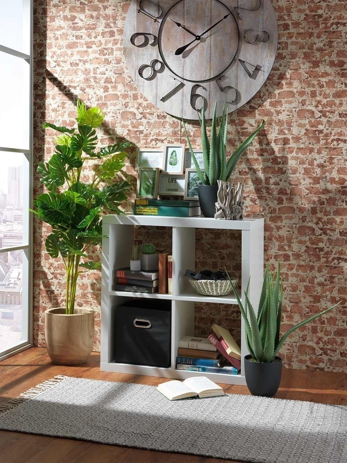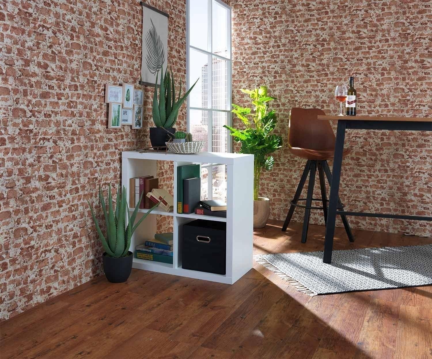 Der Raumteiler bietet Ihnen 4 große Fächer um Deko, Bücher und Co. unterbringen zu können. Das weiße Dekor lässt das Regal schlicht und elegant zugleich aussehen. Das Regal lässt auch auf der oberen Fläche Platz für beispielsweise die Ablage von Schlüsseln und Magazinen.