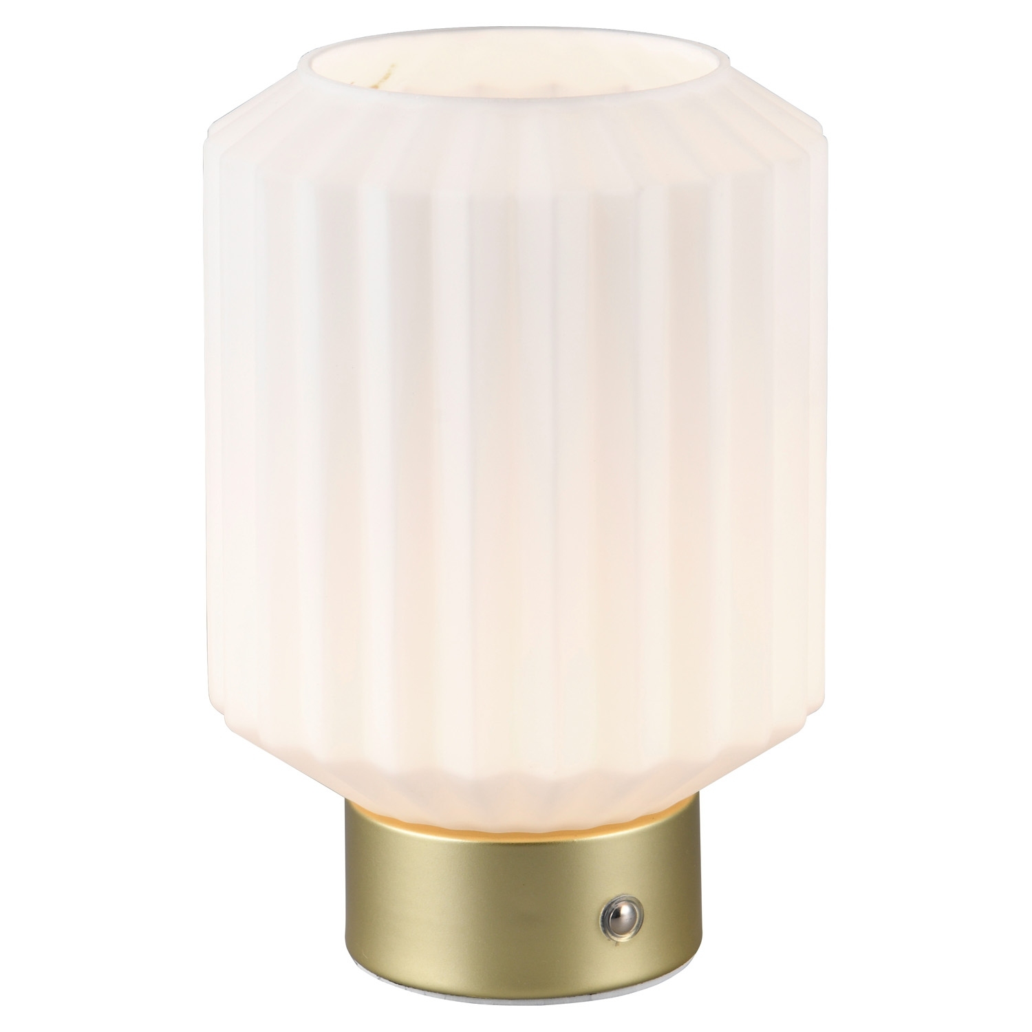 Die Akku LED-Tischlampe LORD von Reality Leuchten kombiniert elegantes Design mit praktischer Funktionalität. Hergestellt aus Metall in messingfarben und einem Lampenschirm aus weißem Glas strahlt sie zeitlose Eleganz aus. Der wiederaufladbare Akku mit USB-Port und mitgeliefertem Kabel ermöglicht kabellose Beleuchtung und einfaches Aufladen. Die Lampe ist 4-fach dimmbar und verfügt über einen Touchsensor für bequeme Helligkeitsanpassungen. Mit einem Durchmesser von 13 cm und einer Höhe von 19 cm passt sie perfekt auf jeden Tisch oder Nachttisch. Das enthaltene LED-Leuchtmittel bietet eine Leistung von 1,5 Watt, eine warmweiße Farbtemperatur von 3000 Kelvin und eine Helligkeit von 100 Lumen, was für eine angenehme Beleuchtung sorgt. Ob im Wohnzimmer oder Schlafzimmer, die Tischleuchte ist eine stilvolle und praktische Lichtquelle für verschiedene Anlässe.