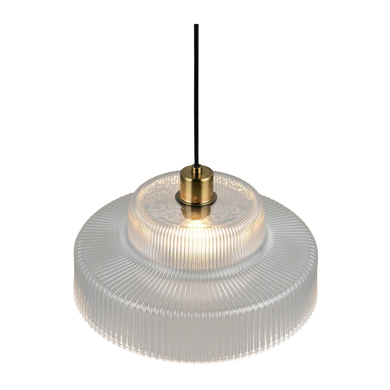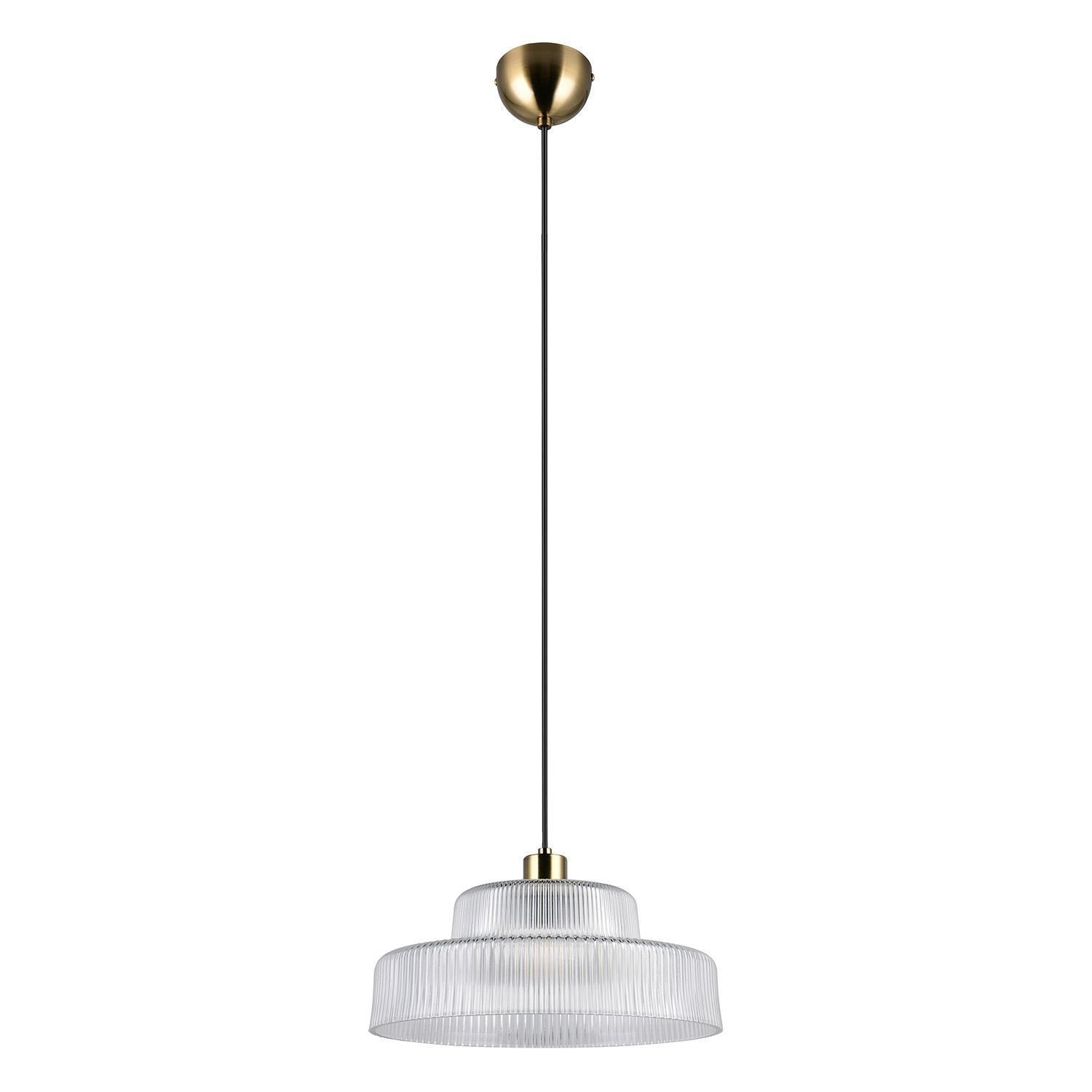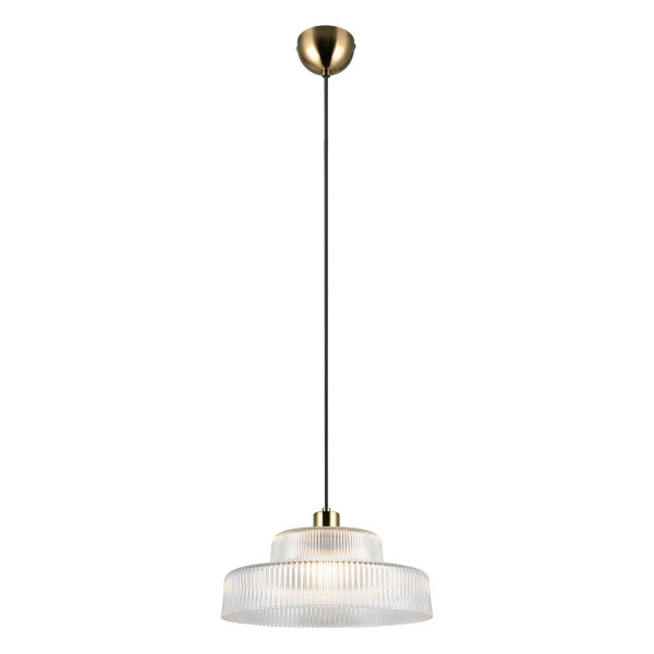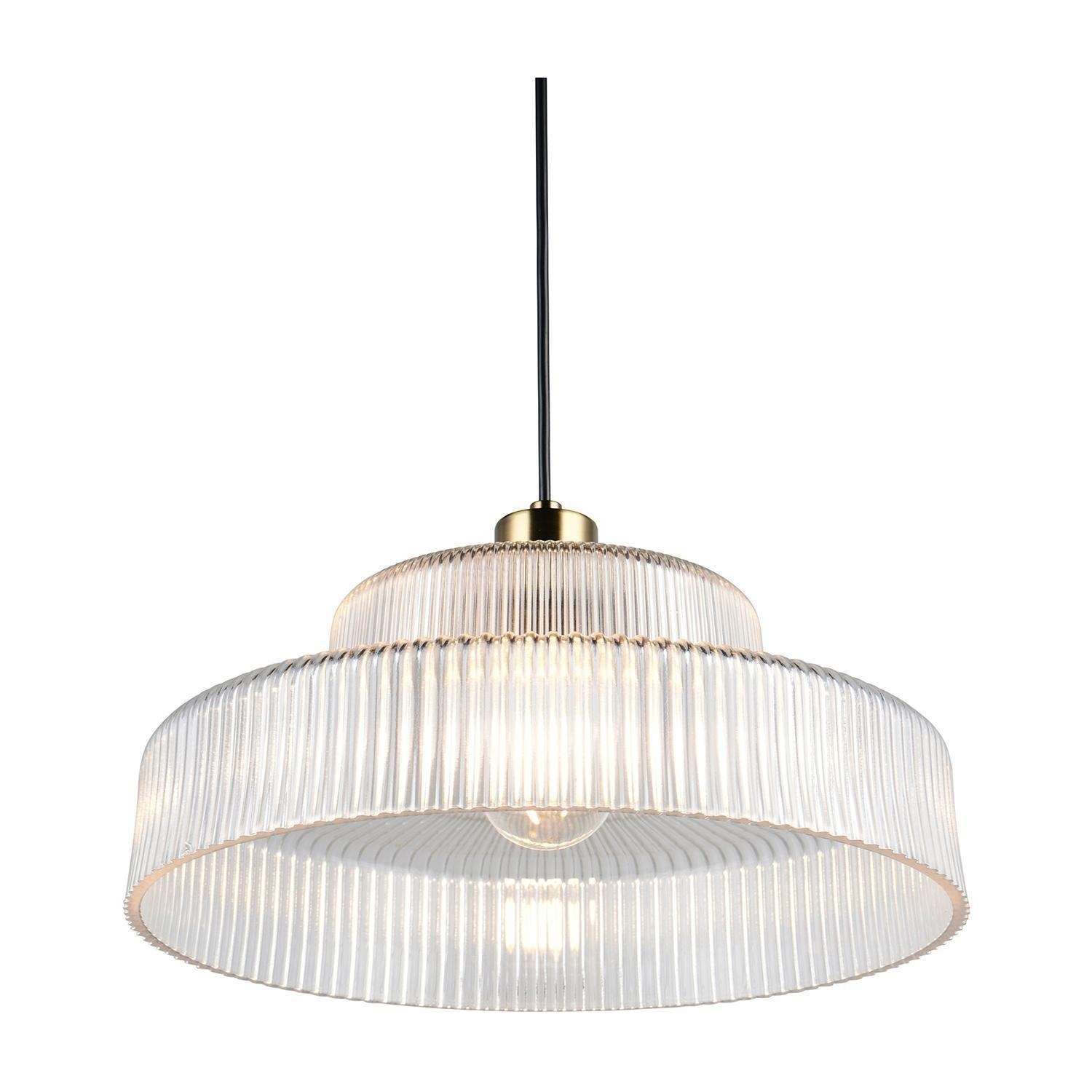 Die Pendelleuchte ABELLA der Marke Reality Leuchten wird aus Metall in Goldgelb sowie einem Lampenschirm aus transparentem Rillenglas gefertigt. Diese Hängeleuchte besitzt einen Durchmesser von 35 cm und eine Höhe von 150 cm. Zur individuellen Anpassung ist der Lampenschirm der Pendellampe höhenverstellbar. Als Lichtquelle dient ein nicht vorhandenes und austauschbares E27-Leuchtmittel mit einer Leistung von bis zu 10 Watt.