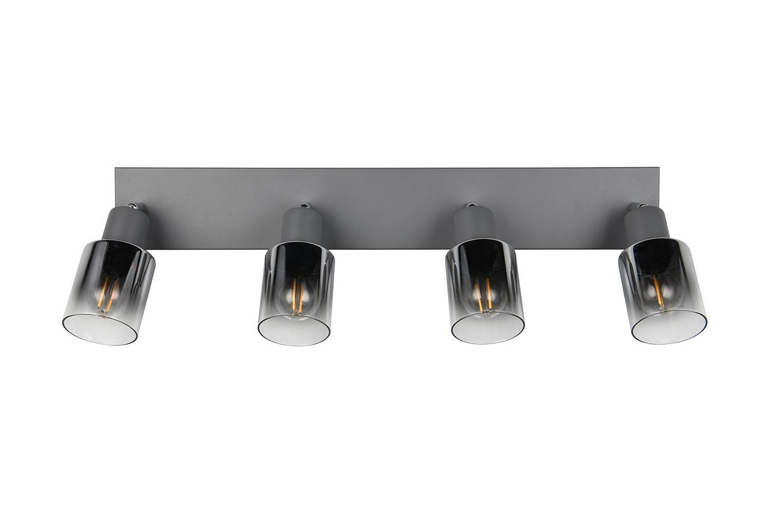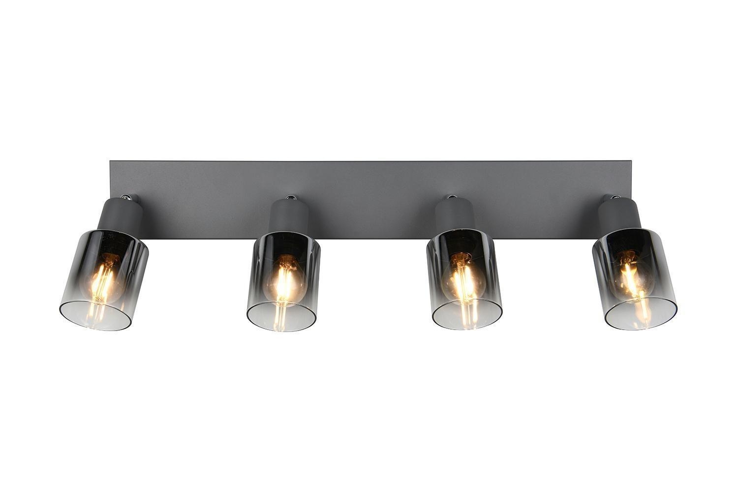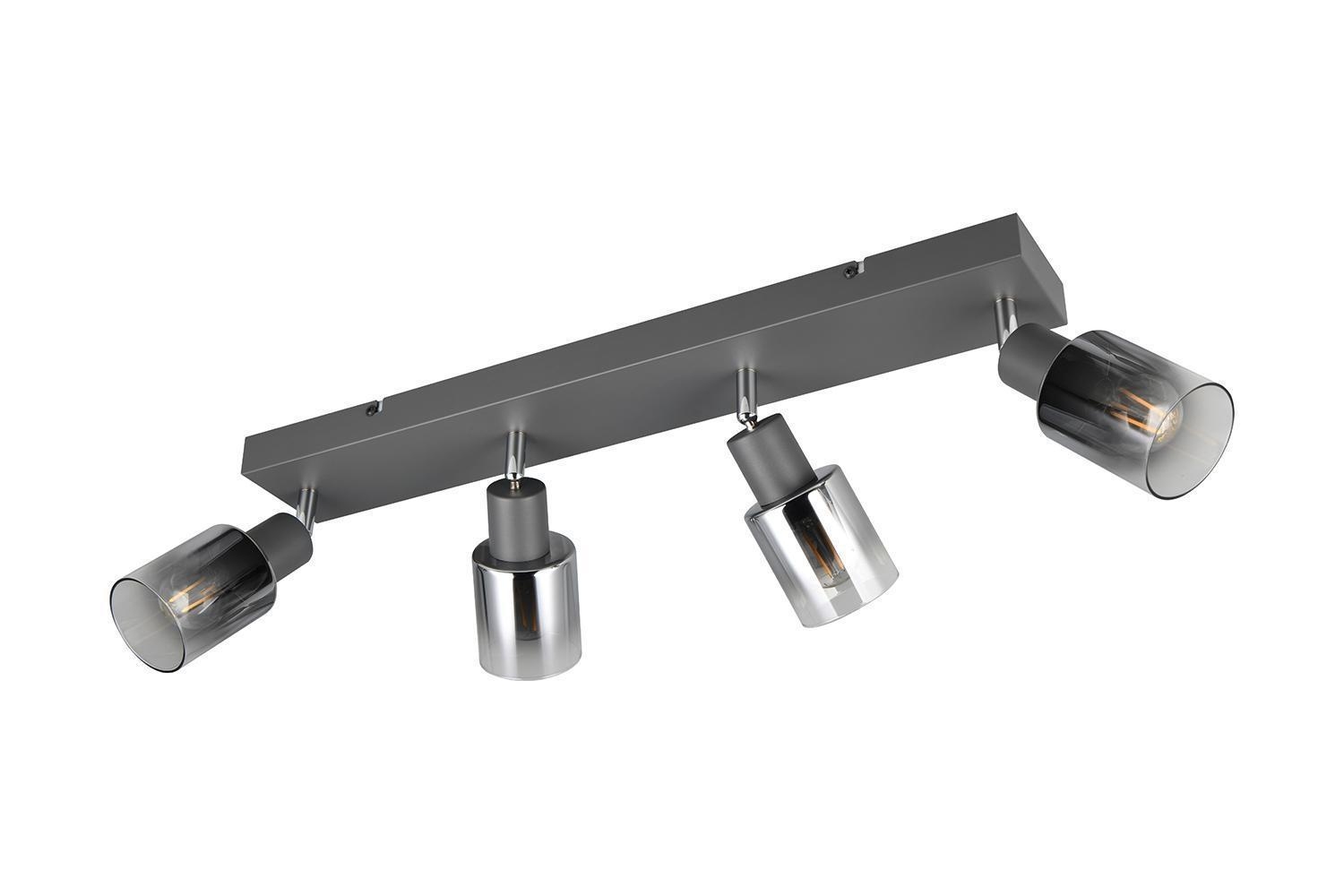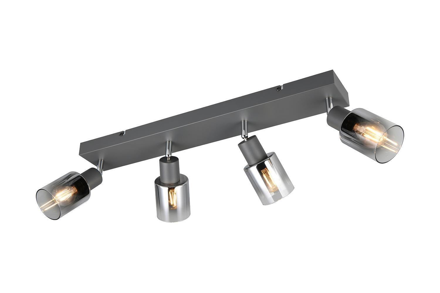 Der Strahler CADIZ von Reality Leuchten besticht durch eine Deckenhalterung aus Metall in Anthrazit und verstellbare Lampenschirme aus Rauchglas. Mit einer Breite von 58 cm, einer Höhe von 15 cm und einer Tiefe von 8 cm fügt er sich ideal in verschiedene Raumkonzepte ein. Der Strahler ist für vier E14-Leuchtmittel mit einer maximalen Leistung von je 10 Watt geeignet. Die Leuchtmittel sind nicht im Lieferumfang enthalten, können aber bei Bedarf ausgetauscht werden.