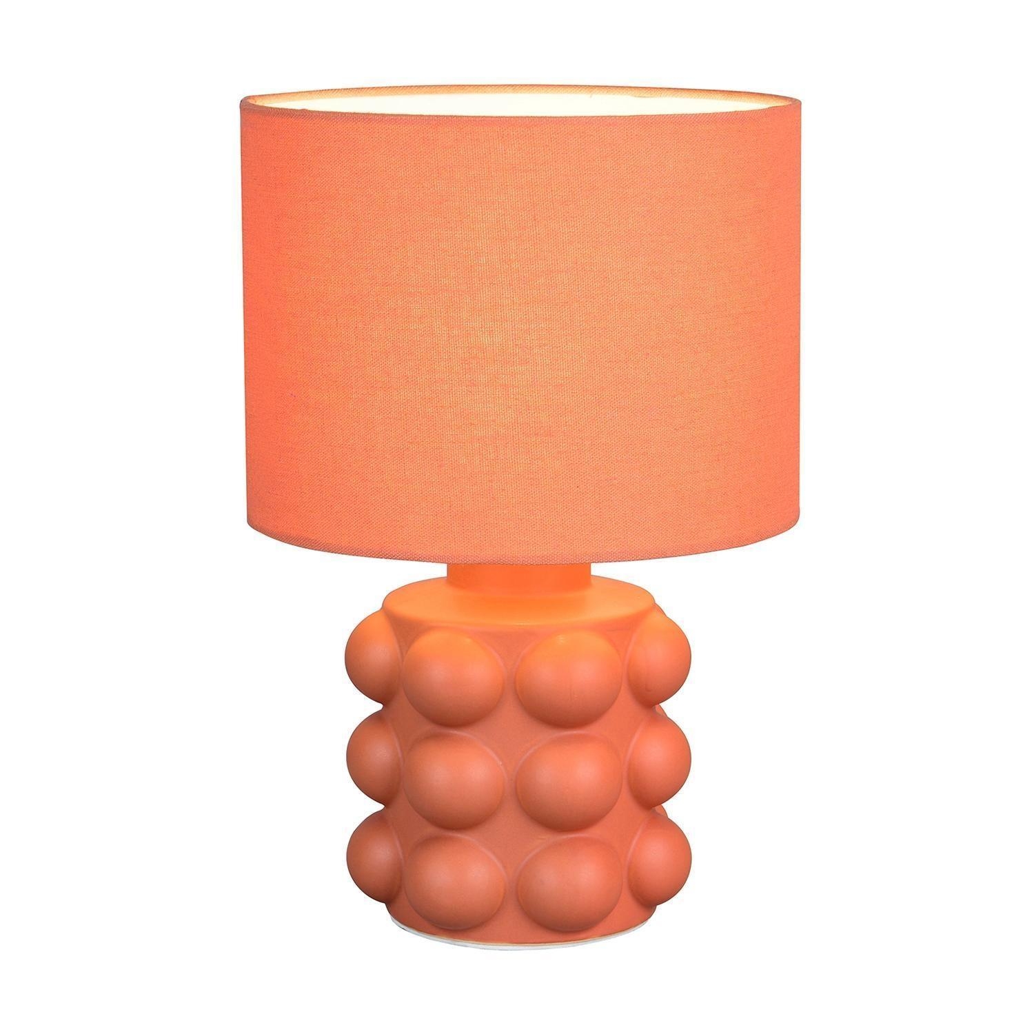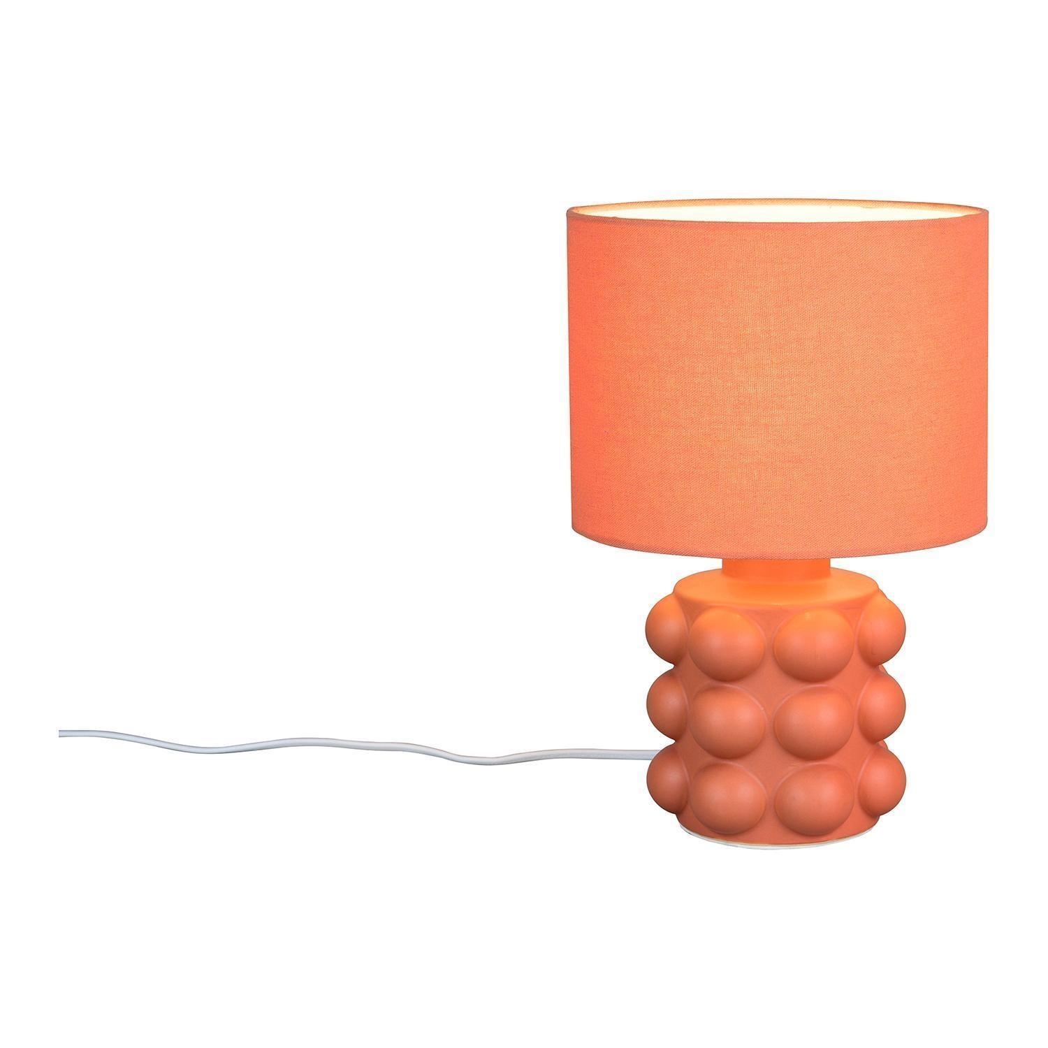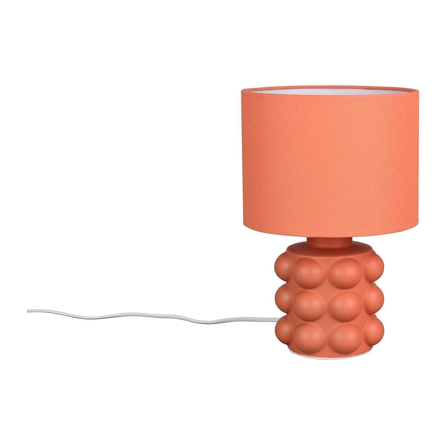 Die Tischlampe KATE der Marke Reality Leuchten wird mit einem Fuß aus Keramik in Apricot mit Bubble-Optik sowie einem Lampenschirm aus Stoff in Apricot gefertigt. Diese Tischleuchte besitzt eine Höhe von 30 cm und einen Durchmesser von 20 cm. Als Lichtquelle wird ein austauschbares E14-Leuchtmittel mit einer Leistung von bis zu 40 Watt benötigt. Zur Bedienung ist die Nachttischlampe mit einem Schnurschalter ausgestattet.