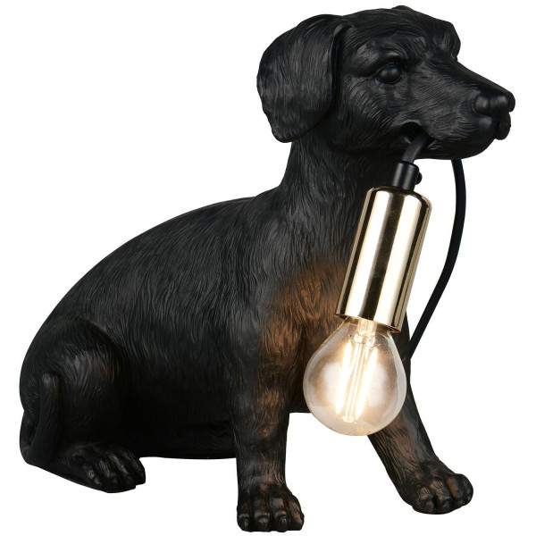 Die Tischlampe RUDI der Marke Reality Leuchten ist aus Kunststoff in Schwarz gefertigt und in Form eines Dackels gestaltet. Sie verfügt über einen Schnurschalter zur Bedienung. Die Maße betragen 23,5 cm in der Breite, 28 cm in der Höhe und 13 cm in der Tiefe. Die Lampe ist für ein Leuchtmittel mit E14-Fassung ausgelegt, das nicht im Lieferumfang enthalten ist, aber austauschbar bleibt. Die maximale Leistung des Leuchtmittels beträgt 10 Watt.