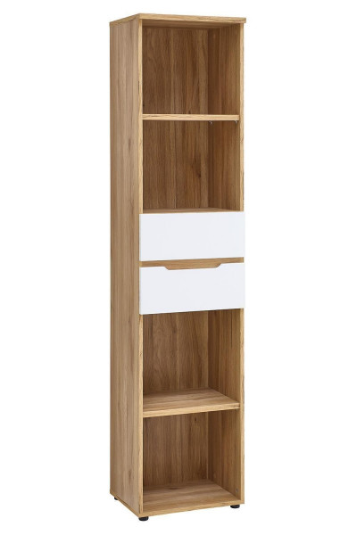 Das Regal CLYDE der Marke vito besteht aus Mauvella Eiche Dekor und verfügt über Fronten in Weiß supermatt. Es ist mit zwei Schubladen mit Soft-Close-Funktion sowie zwei höhenverstellbaren Einlegeböden ausgestattet. Die Maße betragen 45 cm in der Breite, 197 cm in der Höhe und 38 cm in der Tiefe.