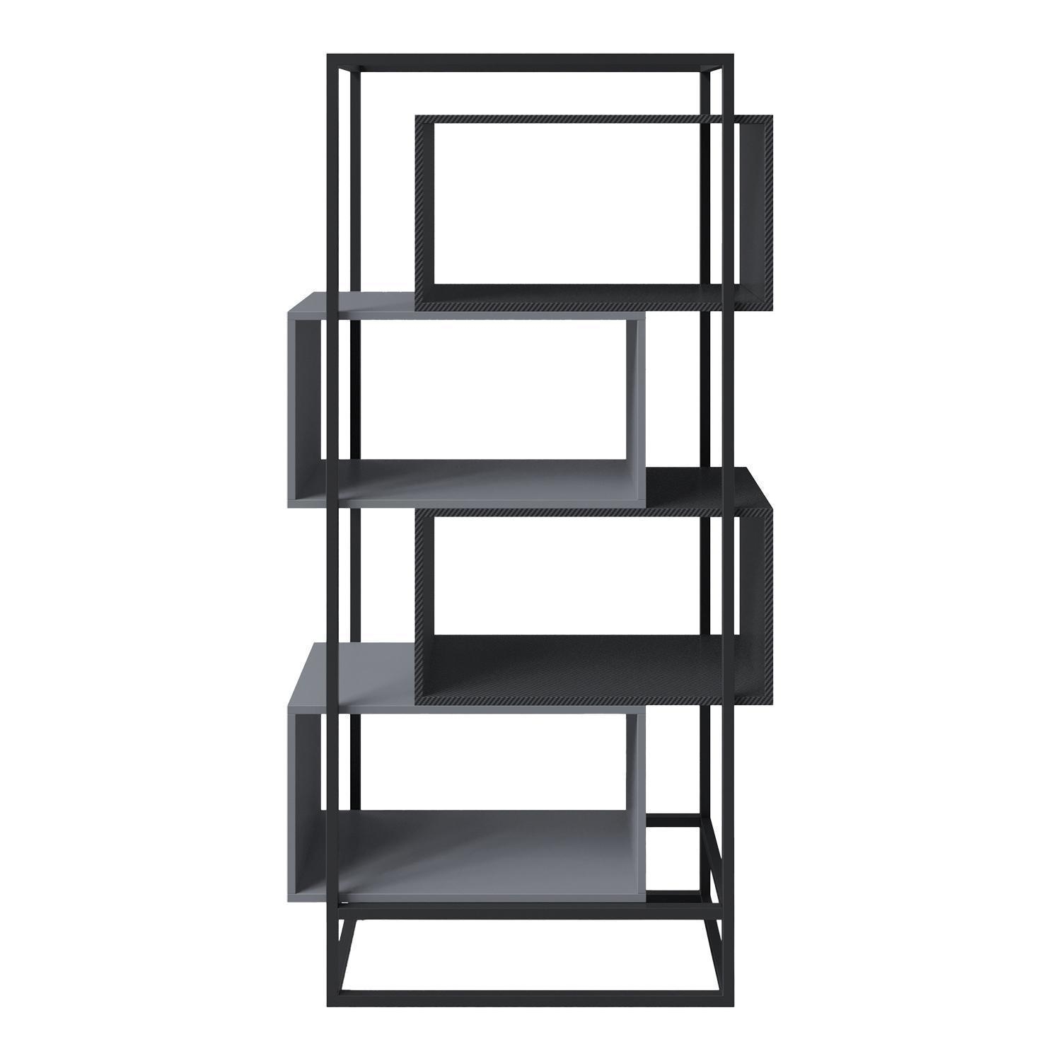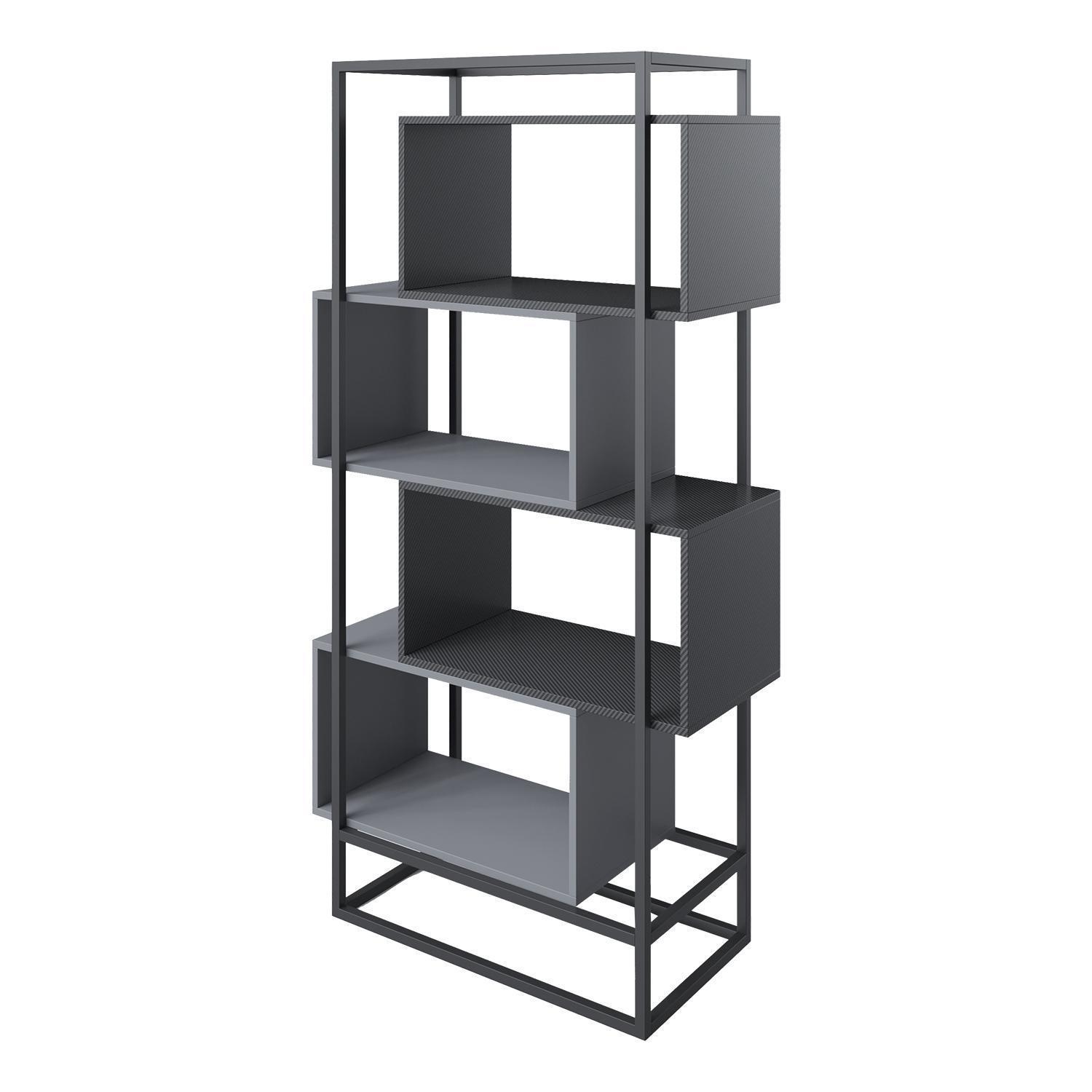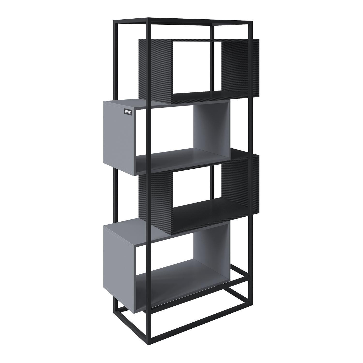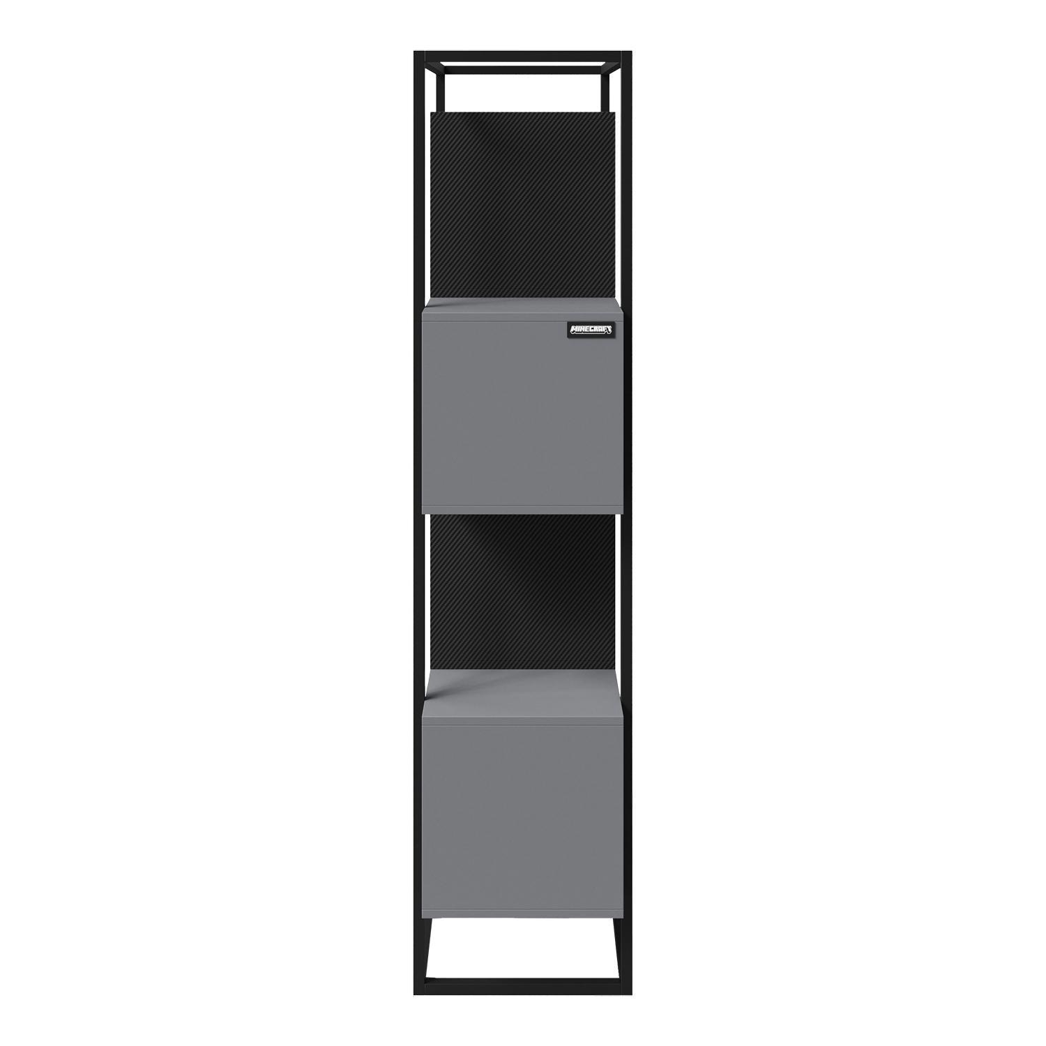 Das Regal MINECRAFT ist in den Farben Grau und Schwarz gehalten. Das Gestell besteht aus Metall in Schwarz.