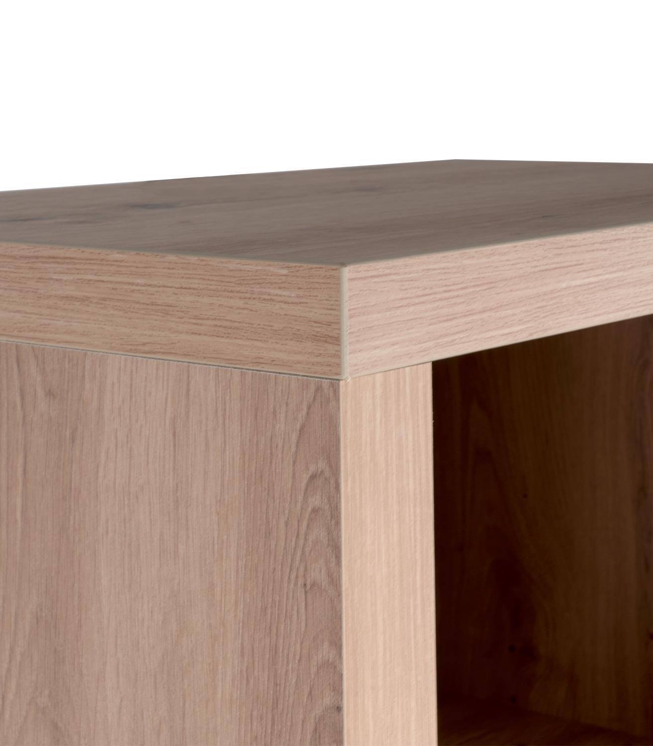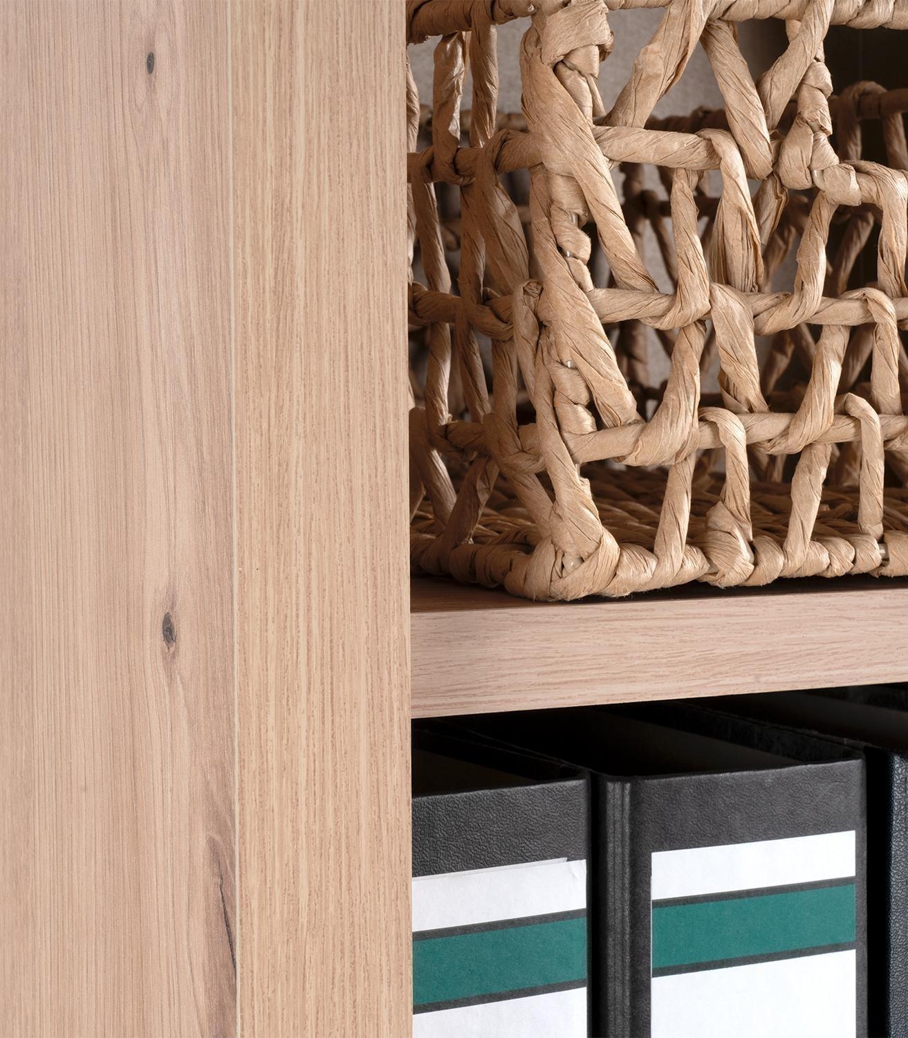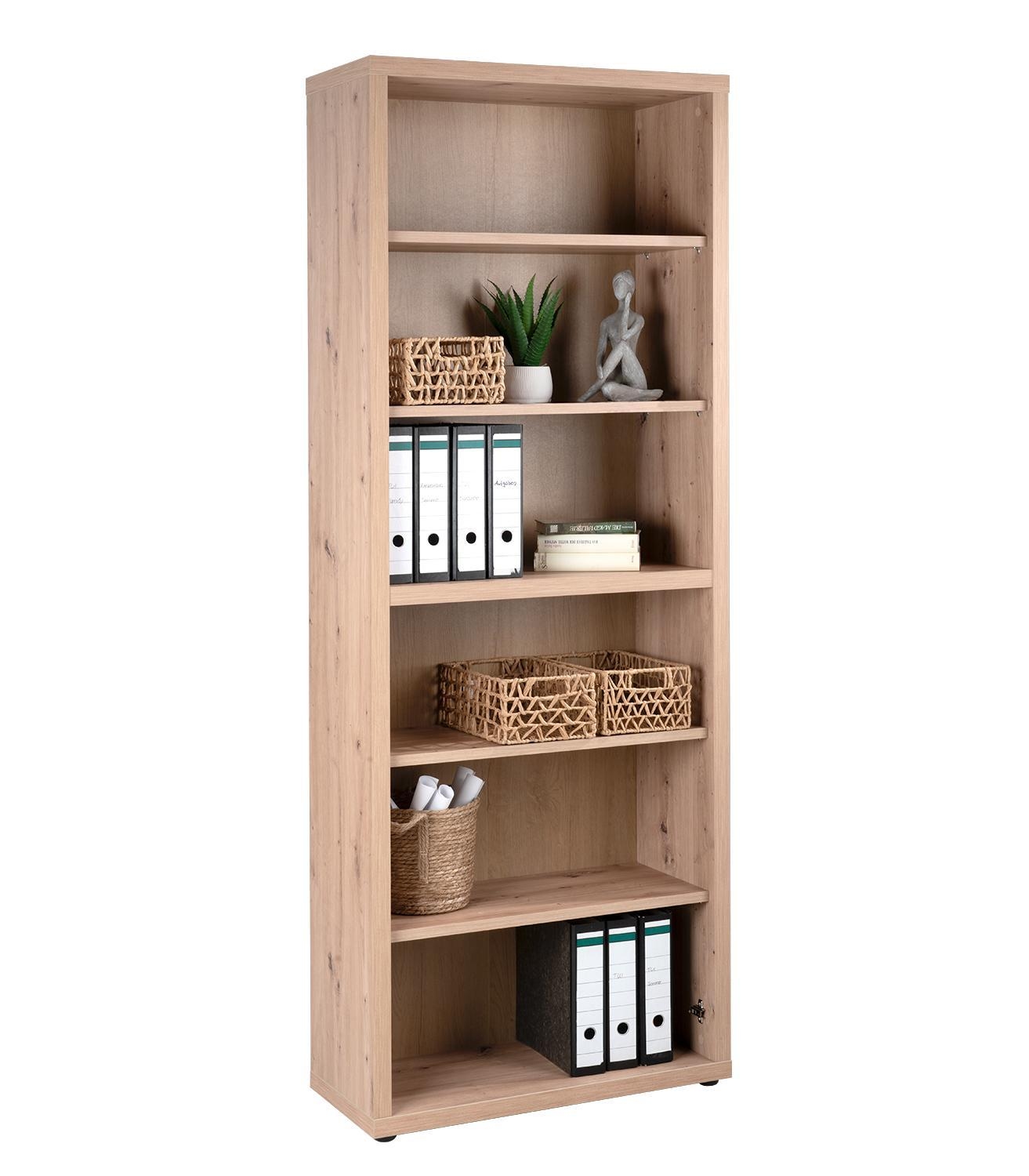 Das Regal REGINE ist in Artisan Eiche Dekor ausgeführt. Es bietet sechs offene Fächer, die durch vier höhenverstellbare Einlegeböden sowie einen festen Einlegeboden gegliedert sind. Die höhenverstellbaren Böden sind jeweils bis maximal 10 kg belastbar, während der feste Boden eine Belastbarkeit von bis zu 12 kg aufweist. Die Fächer sind auf die Aufbewahrung von handelsüblichen Ordnern ausgelegt. Das Regal hat eine Breite von 82 cm, eine Höhe von 215 cm und eine Tiefe von 36 cm.