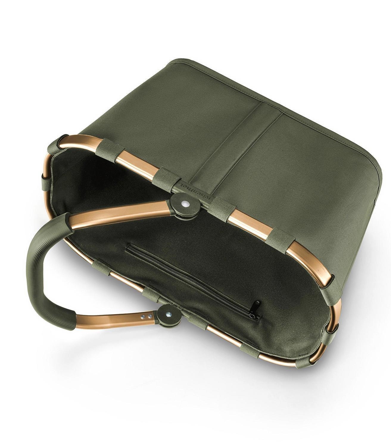Der Einkaufskorb CARRYBAG FOREST GOLD von Reisenthel in Grün ist eine praktische und umweltfreundliche Lösung für Ihren Einkauf. Hergestellt aus recycelten PET-Flaschen, trägt er aktiv zum Umweltschutz bei. Mit einem stabilen Aluminiumrahmen und einem ummantelten Griff in Goldgelb bietet er Komfort und Langlebigkeit. Ein inneres Fach mit Reißverschluss sorgt für die sichere Aufbewahrung kleinerer Gegenstände. Bei Nichtgebrauch kann der Korb platzsparend zusammengefaltet werden. Mit einem Fassungsvermögen von 22 Litern bietet er ausreichend Platz für Ihre Einkäufe. Praktisch, belastbar bis max. 20 kg, umweltfreundlich und stilvoll - der CARRYBAG macht Ihren Einkauf zum Vergnügen.