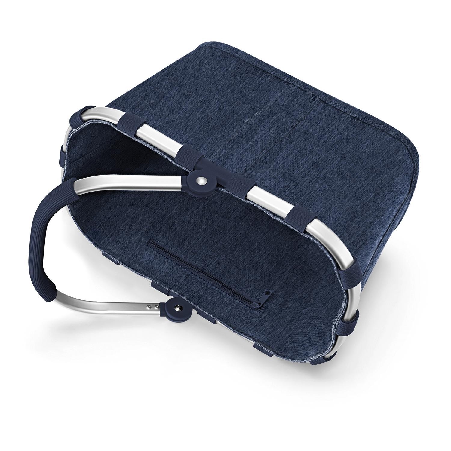 Der Einkaufskorb CARRYBAG TWIST NAVY von Reisenthel in Blau ist eine praktische und umweltfreundliche Lösung für Ihren Einkauf. Hergestellt aus recycelten PET-Flaschen, trägt er aktiv zum Umweltschutz bei. Mit einem stabilen Aluminiumrahmen und einem ummantelten Griff in Silbergrau bietet er Komfort und Langlebigkeit. Ein inneres Fach mit Reißverschluss sorgt für die sichere Aufbewahrung kleinerer Gegenstände. Bei Nichtgebrauch kann der Korb platzsparend zusammengefaltet werden. Mit einem Fassungsvermögen von 22 Litern bietet er ausreichend Platz für Ihre Einkäufe. Praktisch, belastbar bis max. 20 kg, umweltfreundlich und stilvoll - der CARRYBAG macht Ihren Einkauf zum Vergnügen.