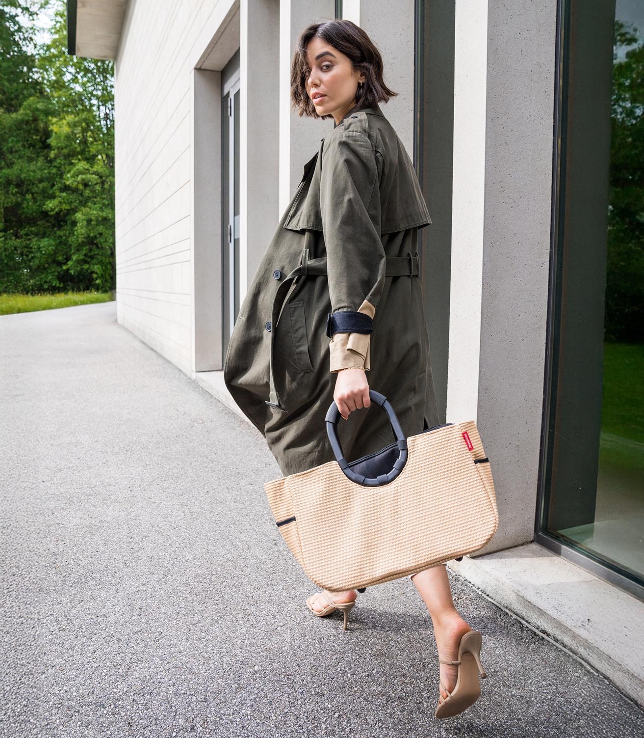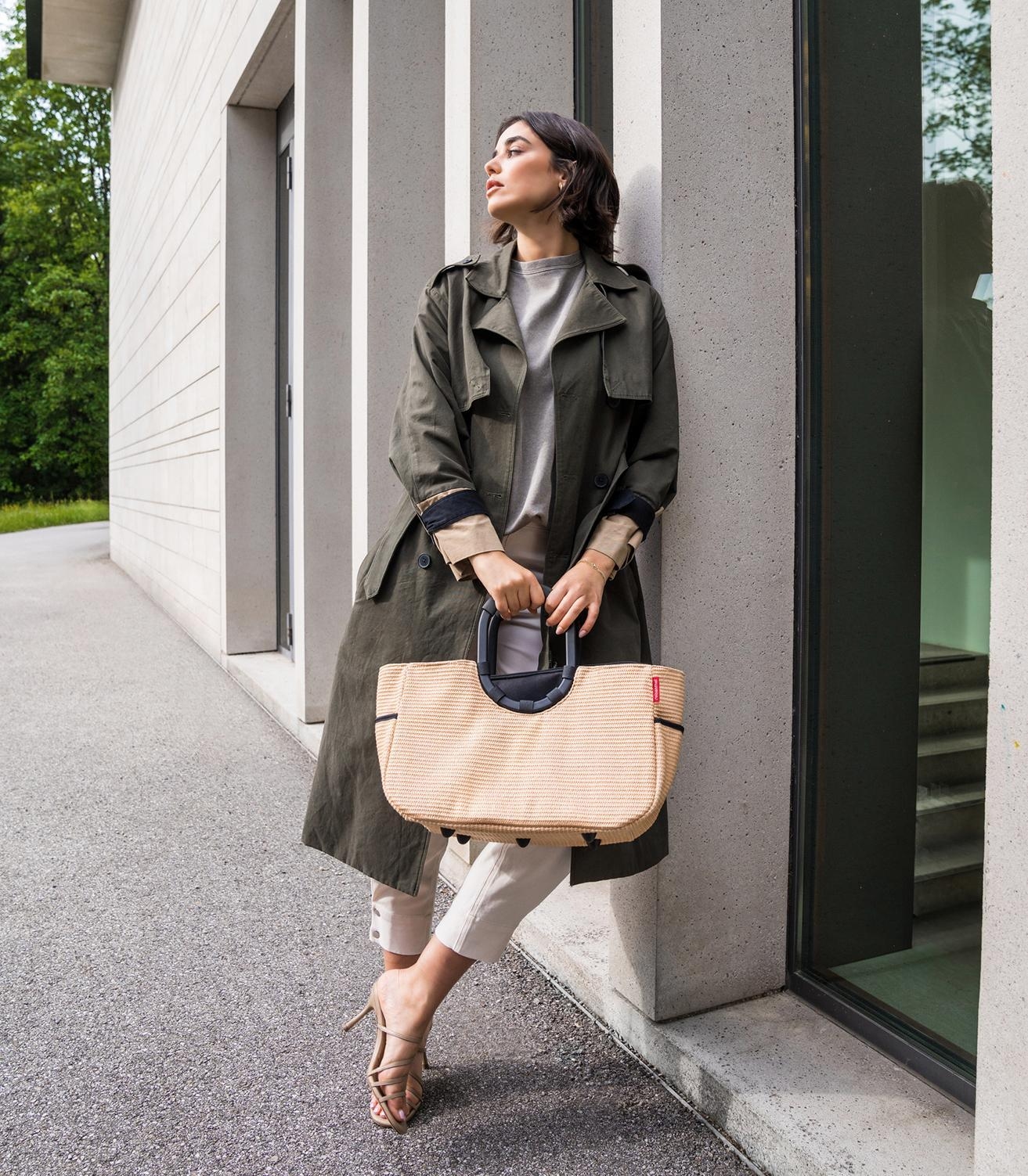 Die Einkaufstasche LOOPSHOPPER M RAFFIA BLACK der Marke Reisenthel besteht aus Polyester in den Farben Beige und Schwarz. Sie ist mit gepolsterten Tragegriffen aus Aluminium ausgestattet. Zur Aufbewahrung bietet die Tasche eine Innentasche mit Reißverschluss, zwei Außenstecktaschen sowie eine herausnehmbare Kosmetiktasche mit drei Fächern. Standfüße an der Unterseite schützen vor Nässe von unten. Die Tasche ist wasserabweisend. Die Breite beträgt 40 cm, die Höhe 26 cm und die Tiefe 20 cm. Das Fassungsvermögen liegt bei 12 Litern.