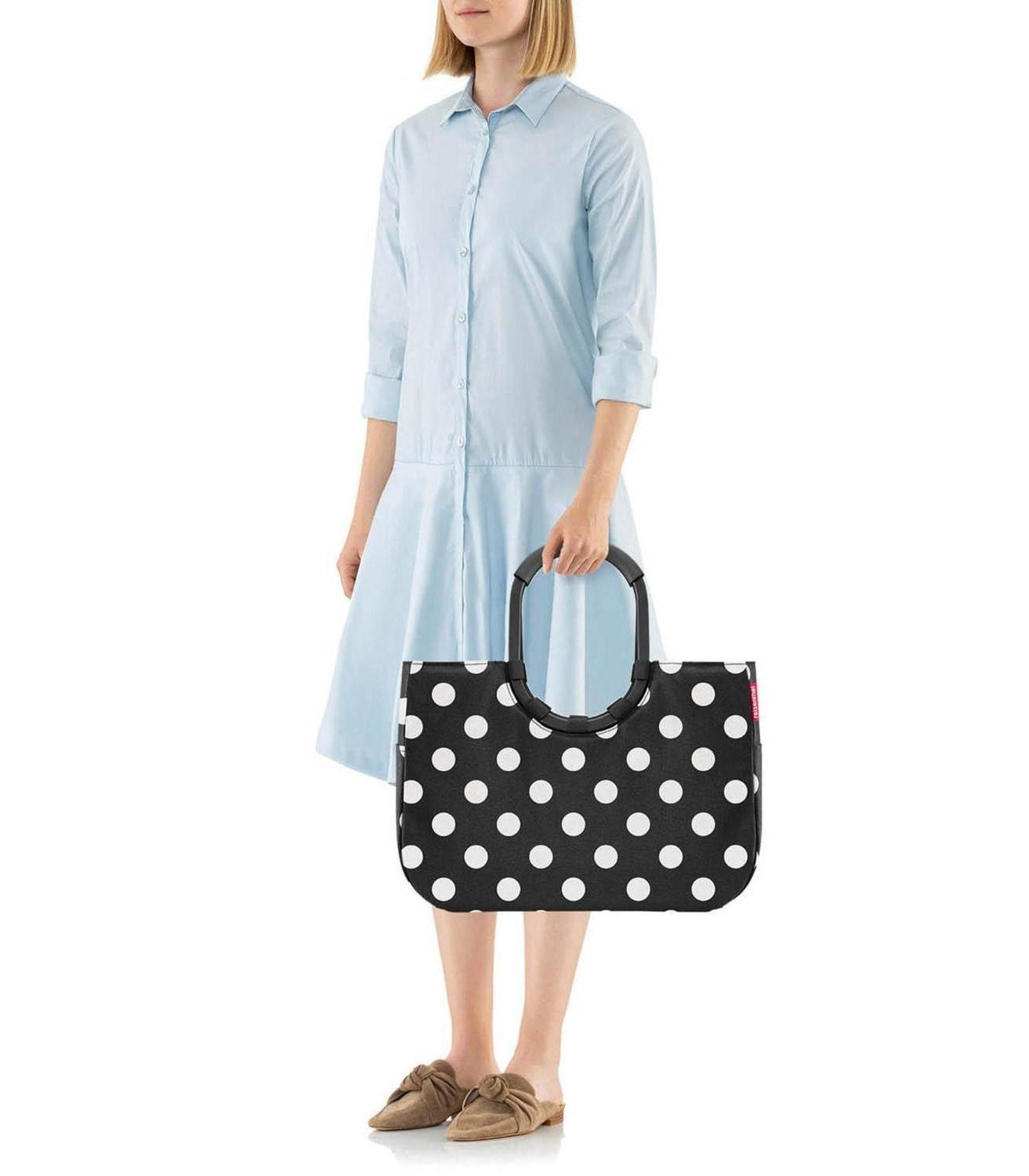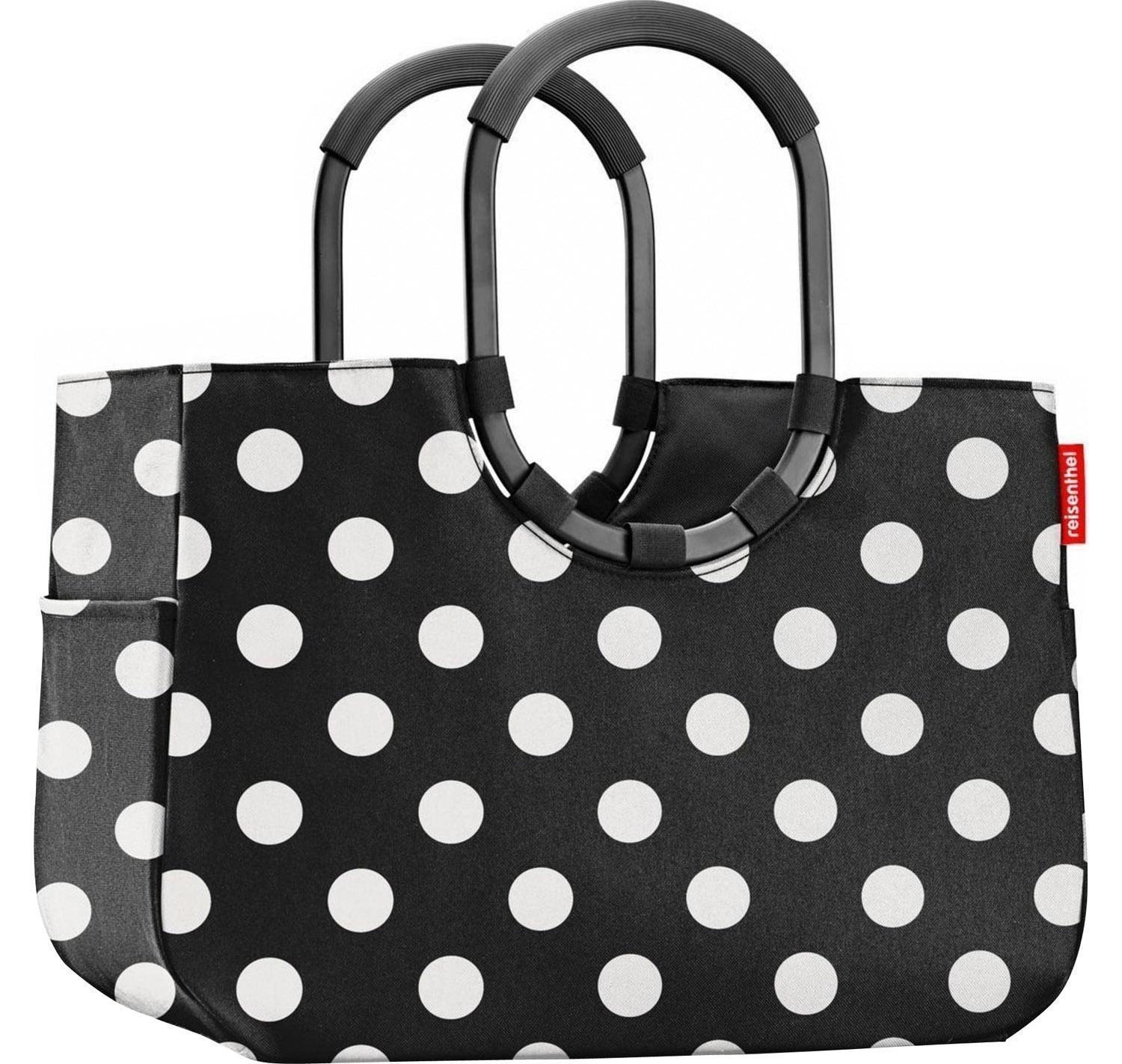 Die Einkaufstasche LOOPSHOPPER L DOTS WHITE von Reisenthel mit 25 Litern Fassungsvermögen ist aus wasserabweisendem Polyester in Schwarz mit weißen Punkten gefertigt. Sie verfügt über gepolsterte Aluminium-Tragegriffe in Silbergrau, eine Innentasche mit Reißverschluss und zwei Außenstecktaschen. Die Standfüße schützen vor Feuchtigkeit. Maße: 46 x 34 cm. Mit ihren ringförmigen Tragegriffen ist sie sowohl stilvoll als auch praktisch.
