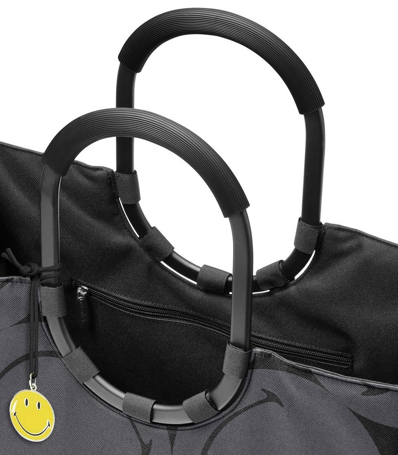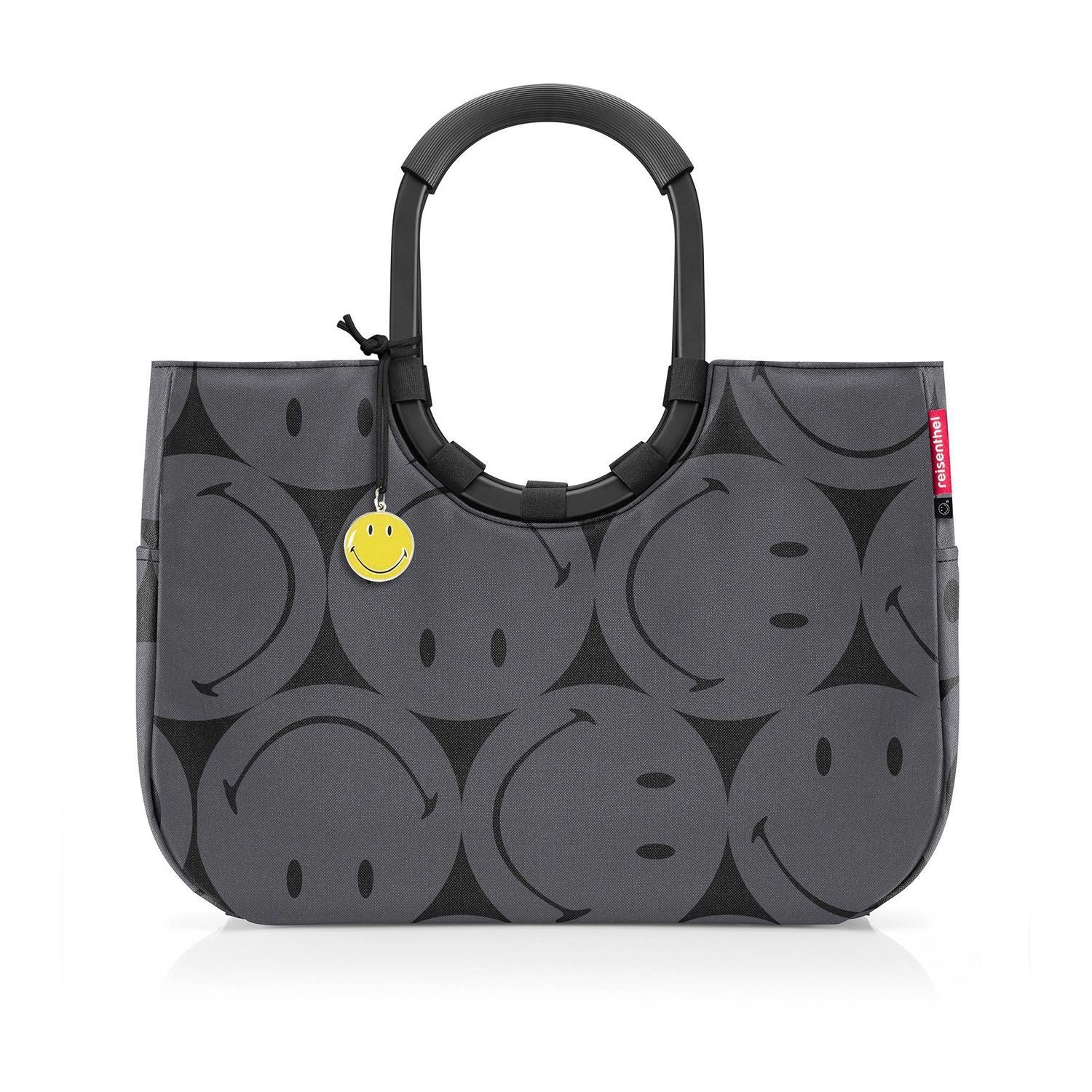 Die Einkaufstasche LOOPSHOPPER L SMILEY GREY von Reisenthel mit 25 Litern Fassungsvermögen ist aus wasserabweisendem Polyester in Grau mit Smiley-Motiven gefertigt. Sie verfügt über gepolsterte Aluminium-Tragegriffe, eine Innentasche mit Reißverschluss und zwei Außenstecktaschen. Die Standfüße schützen vor Feuchtigkeit. Maße: 46 x 34 cm. Mit ihren ringförmigen Tragegriffen ist sie sowohl stilvoll als auch praktisch. Der gelbe Anhänger mit dem lächelnden Gesicht ist enthalten.
