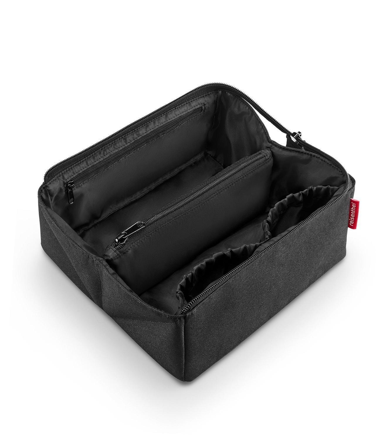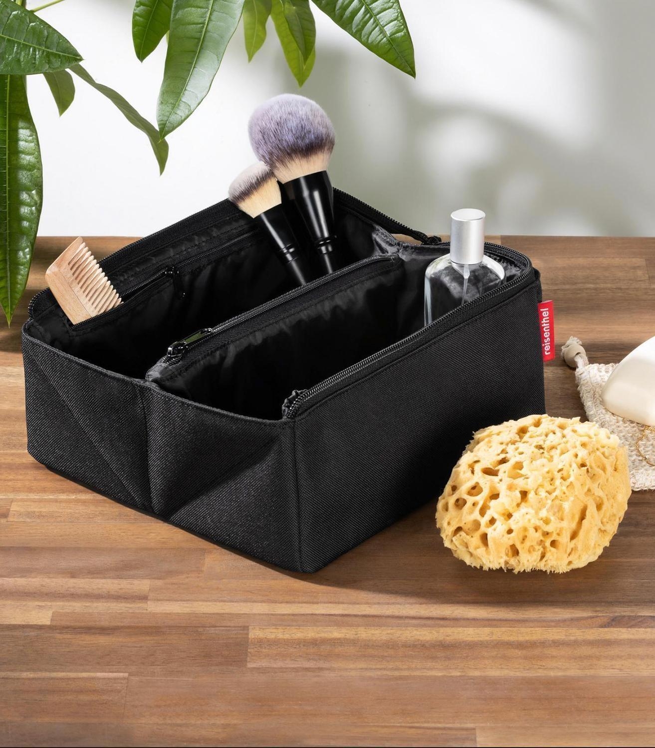 Die Kosmetiktasche FOLD CASE BLACK von der Marke Reisenthel wurde aus recyceltem Polyester in der Farbe Schwarz hergestellt. Im Inneren ist die Tasche für eine sichere Aufbewahrung der Inhalte gepolstert. Die Fächeraufteilung umfasst zwei offene Innenfächer sowie ein Reißverschlussfach innen. Zudem sind zwei offene Steckfächer und ein flexibles Reißverschlussfach integriert. Bei einer Breite von 23 cm, einer Höhe von 11 cm und einer Tiefe von 11 cm beträgt das Fassungsvermögen der Kosmetiktasche 1,5 Liter.