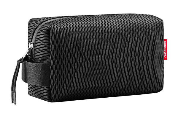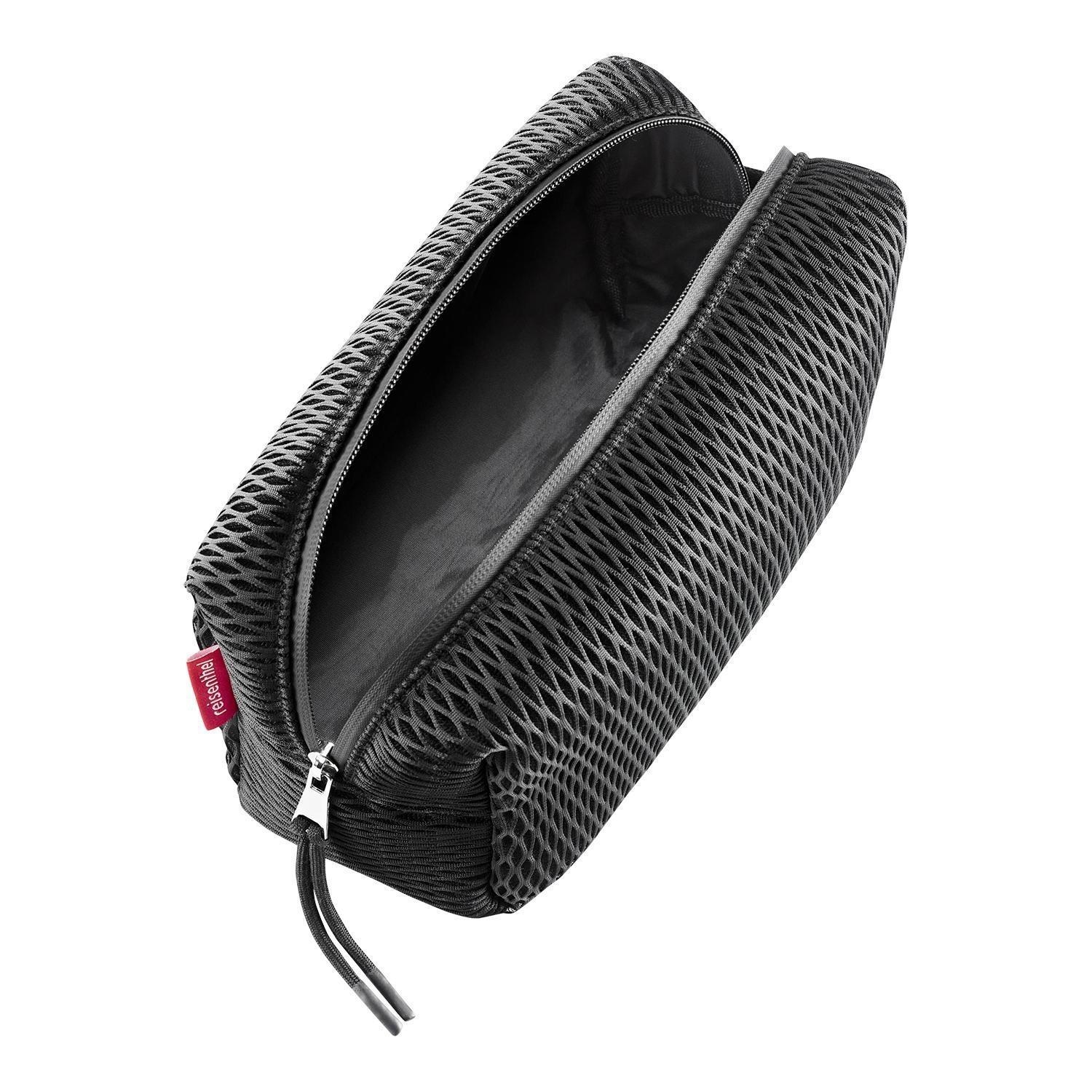 Die Kosmetiktasche EXTRALITE COSMETIC MESH BLACK der Marke Reisenthel besteht aus einem schwarzen Mesh-Gewebe in Kombination mit Polyester. Sie bietet ein Fassungsvermögen von 3 Litern und verfügt über ein Hauptfach, das mit einem Reißverschluss und einer langen Zughilfe ausgestattet ist.