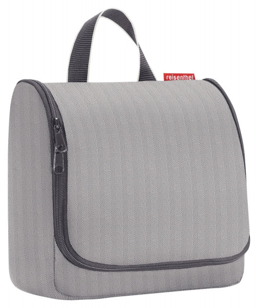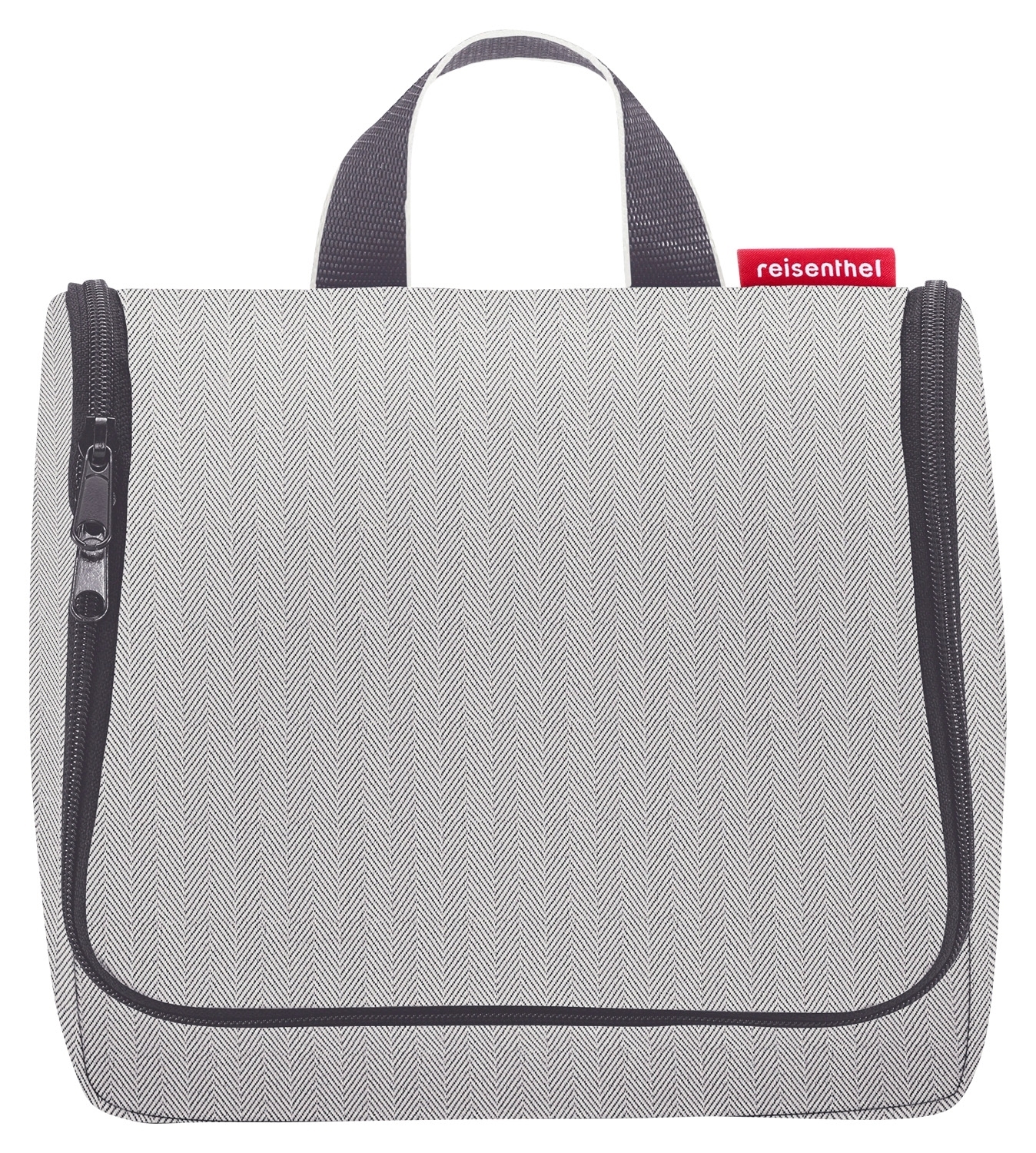 Die wasserabweisende Kosmetiktasche TOILETBAG HERRINGBONE GREY von Reisenthel bietet 3 Liter Volumen dank 2 äußeren Reißverschlüssen. Hergestellt aus Polyestergewebe in grau und schwarz, hat sie ein inneres Hauptfach, 2 Fächer mit Reißverschluss und 4 Steckfächer. Ein kleiner Spiegel kann über den Klettverschluss im Inneren angeheftet werden. Geschlossen beträgt die Größe B 23 x H 20 x T 10 cm.