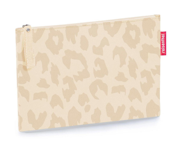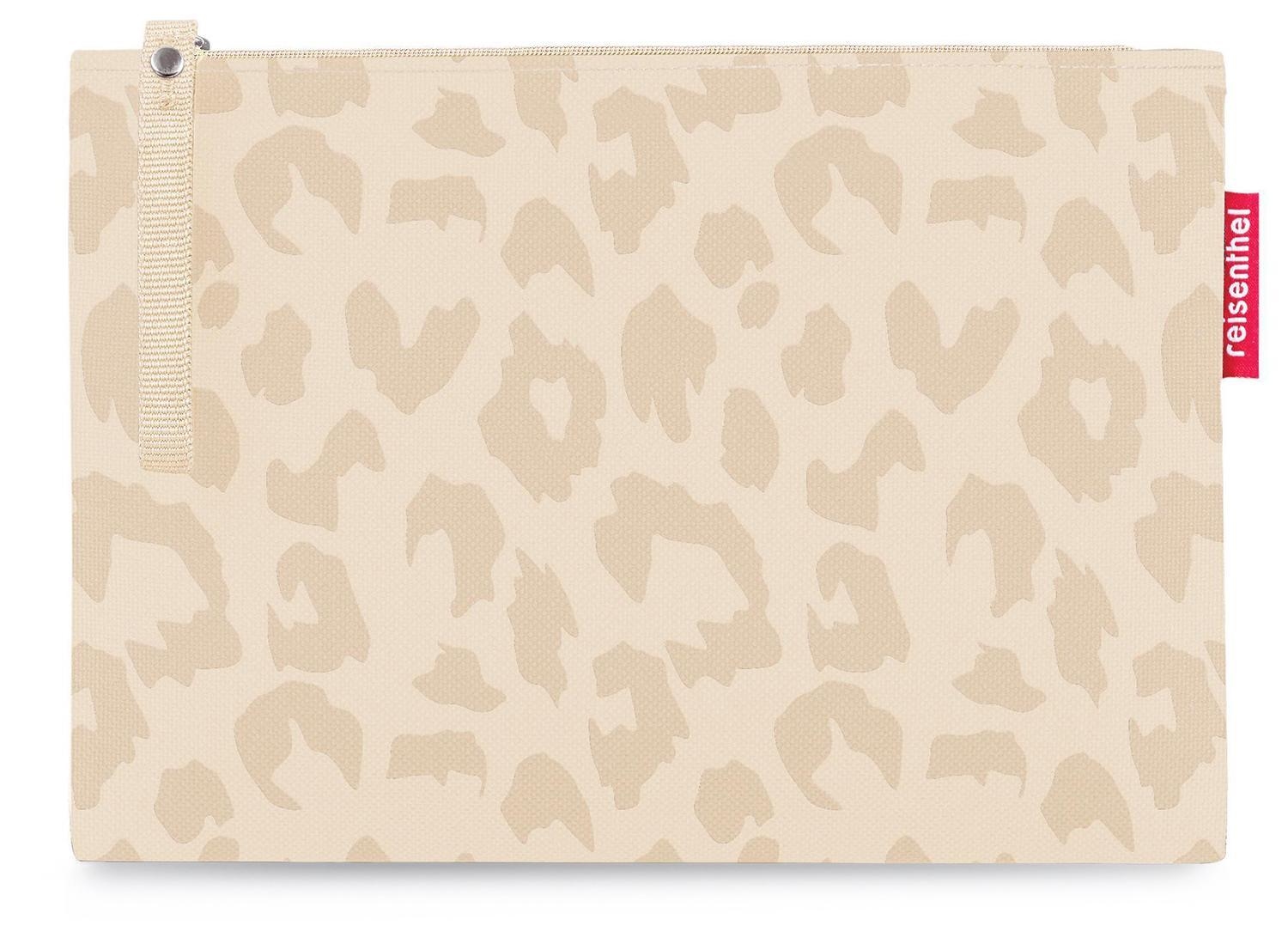 Die Kosmetiktasche CASE LEO VANILLA von der Marke Reisenthel besteht aus einem Polyestergewebe mit Leopardenmuster in Beige und Creme. Dank des wasserabweisenden Außenmaterials sind die Inhalte gut geschützt. Zum Verschluss dient ein Reißverschluss, der mit einer langen Zughilfe versehen ist. Im Inneren ist die Tasche für eine sichere Aufbewahrung von Gegenständen gefüttert. Bei einer Breite von 24 cm und einer Höhe von 17 cm weist die Kosmetiktasche eine geringe Tiefe von lediglich 1 cm auf.