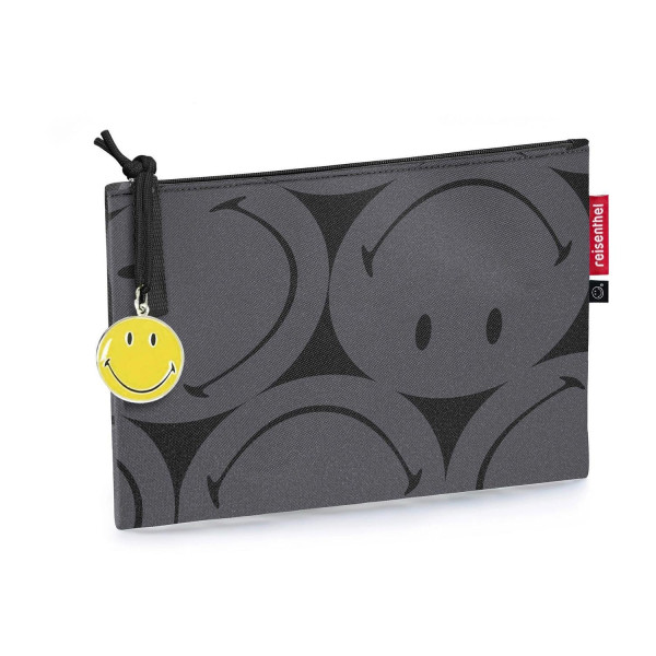 Die Kosmetiktasche CASE SMILEY GREY von der Marke Reisenthel besteht aus einem Polyestergewebe in Grau mit Smiley-Motiven. Dank des wasserabweisenden Außenmaterials sind die Inhalte gut geschützt. Zum Verschluss dient ein Reißverschluss, der mit einer langen Zughilfe versehen ist. Im Inneren ist die Tasche für eine sichere Aufbewahrung von Gegenständen gefüttert. Bei einer Breite von 24 cm und einer Höhe von 17 cm weist die Kosmetiktasche eine geringe Tiefe von lediglich 1 cm auf. Der gelbe Anhänger mit dem lächelnden Gesicht ist mit enthalten.