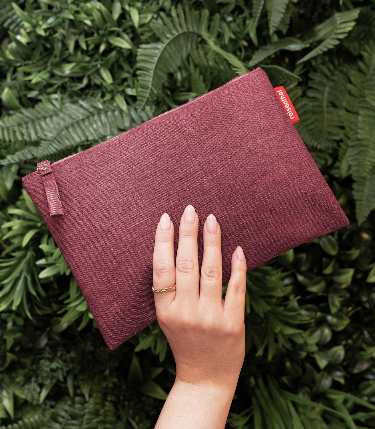 Die Kosmetiktasche CASE TWIST MAROON von der Marke Reisenthel besteht aus einem Polyestergewebe in Rot. Dank des wasserabweisenden Außenmaterials sind die Inhalte gut geschützt. Zum Verschluss dient ein Reißverschluss, der mit einer langen Zughilfe versehen ist. Im Inneren ist die Tasche für eine sichere Aufbewahrung von Gegenständen gefüttert. Bei einer Breite von 24 cm und einer Höhe von 17 cm weist die Kosmetiktasche eine geringe Tiefe von lediglich 1 cm auf.