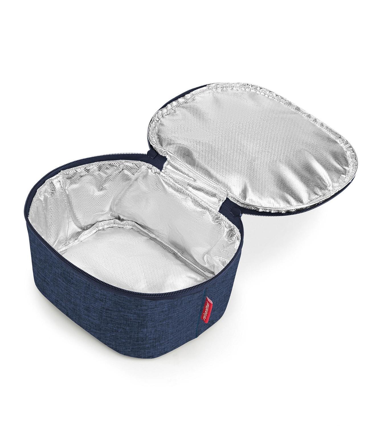 Die Kühltasche COOLERBAG S POCKET TWIST NAVY der Marke Reisenthel besteht aus blauem Polyestergewebe und weist ein Fassungsvermögen von 2,5 Litern auf. Das Modell ist mit einem vernähten Tragegriff sowie einem dichtschließenden Reißverschluss ausgestattet. Im Inneren verfügt die Tasche über eine Thermobeschichtung aus dicker Aluminiumfolie, die Lebensmittel länger kühl und frisch hält. Die Abmessungen betragen 22 cm in der Breite, 12 cm in der Höhe und 18 cm in der Tiefe. Zudem besitzt das Behältnis einen stabilen und widerstandsfähigen Taschenboden. Durch die Kombination aus Polyestergewebe und Aluminiumfolie ist diese Kühltasche für den Transport von Lebensmitteln konzipiert.