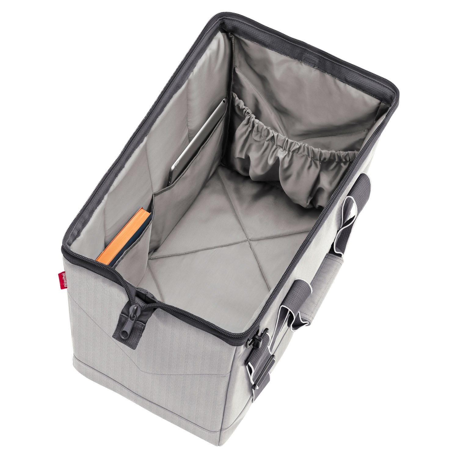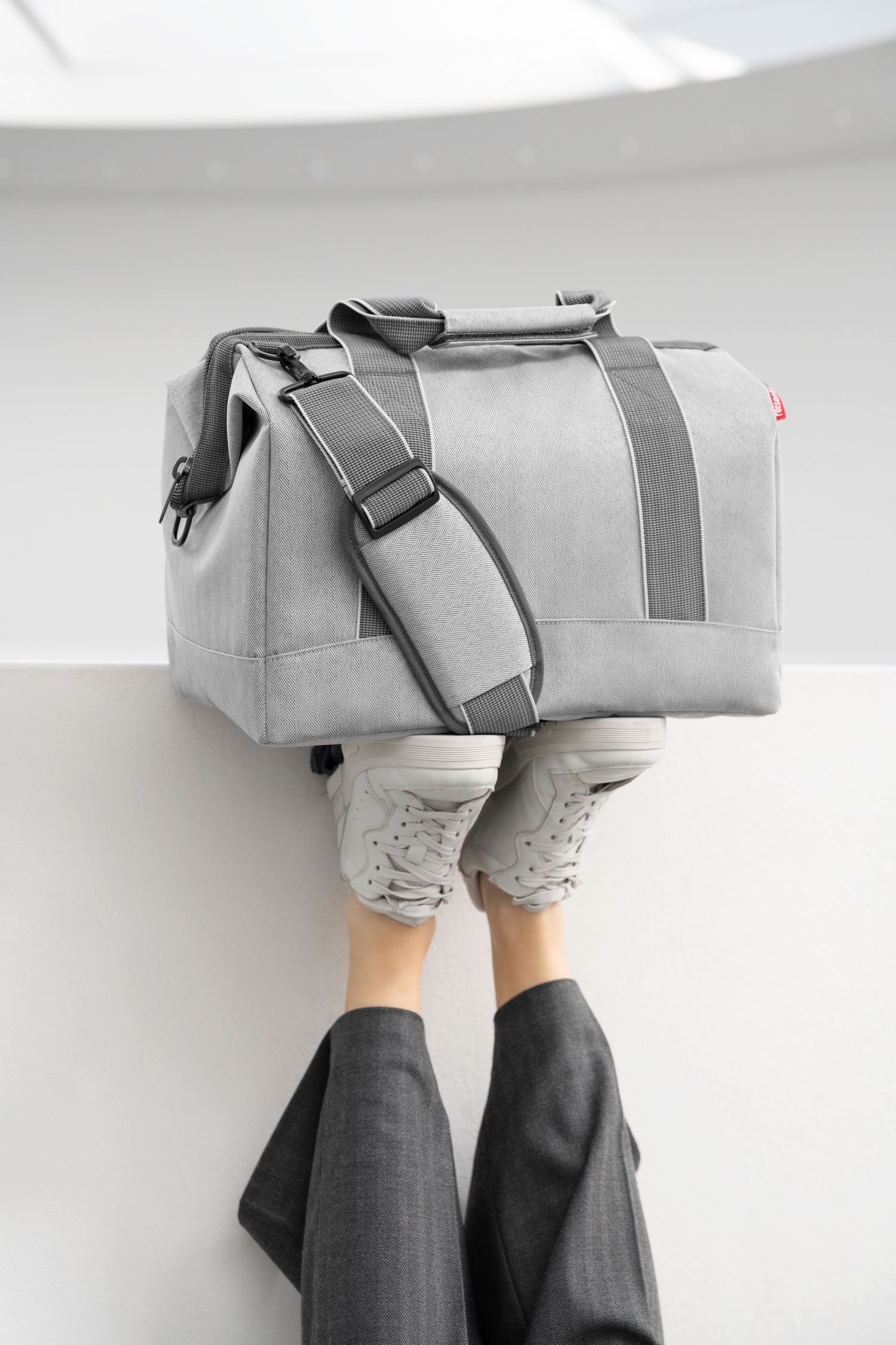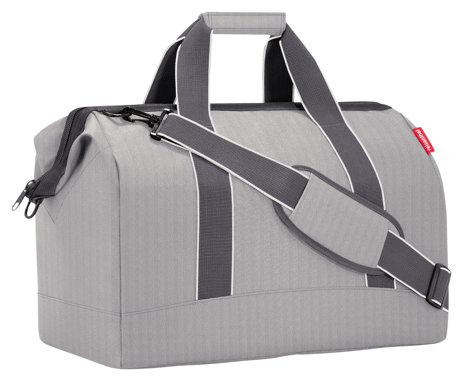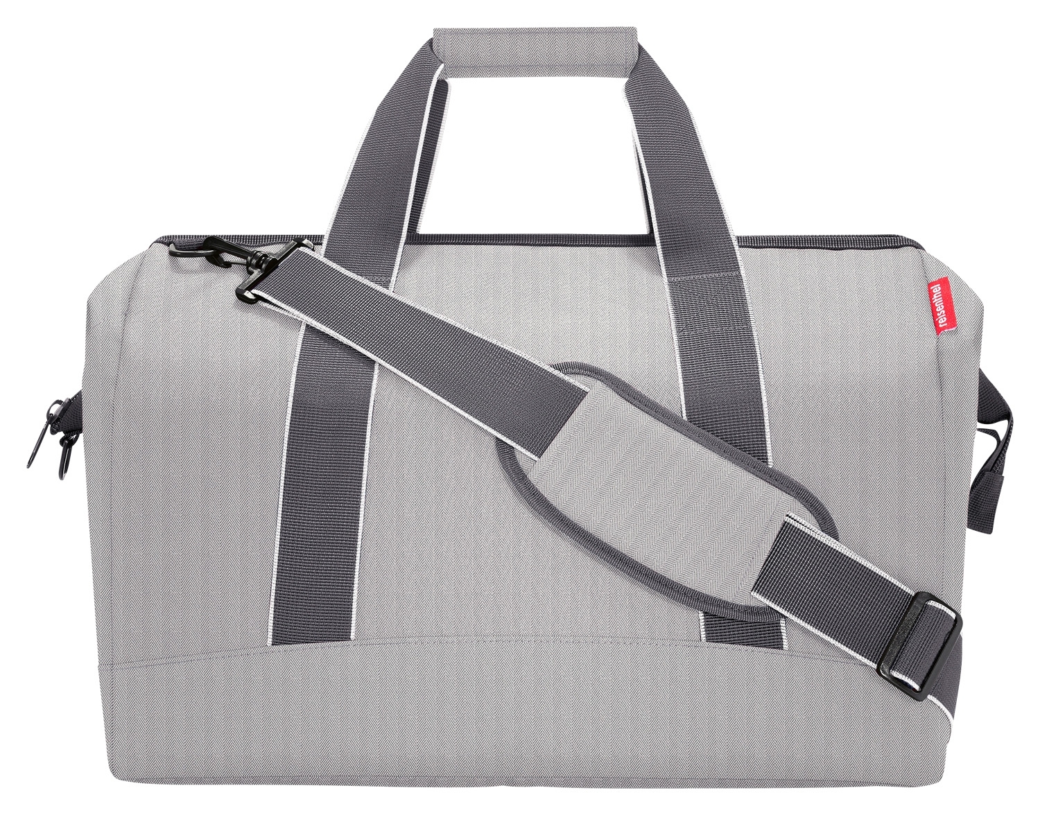 Die Reisetasche ALLROUNDER L HERRINGBONE GREY von Reisenthel in Grau und Schwarz ist aus Polyestergewebe gefertigt und bietet ein Volumen von 30 Litern. Sie hat einen abnehmbaren Schultergurt und 2 vernähte Tragegriffe, sowie gepolsterte Seitenwände und Boden. Im Inneren gibt es 6 Steckfächer und die Öffnung ist mit einem eingearbeiteten Metallbügel versehen. Das hochwertige Polyestergewebe ist wasserabweisend. Die Tasche hat eine komfortabel gepolsterte Schulterauflage und 2 Tragehenkel mit Griffpolster.